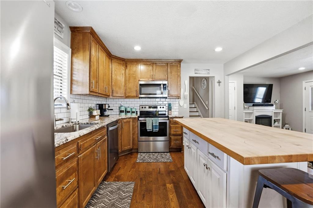 This is the one you’ve been waiting for! Completely move-in ready with no projects required! Step inside to an open, renovated layout. The kitchen shines with newer floor-to-ceiling cabinets, granite countertops, classic subway tile backsplash, and stainless steel appliances. Large kitchen island makes for great functionality. Beautiful wide-plank flooring flows throughout the kitchen and main living area. Generous size bedrooms. Updated bathrooms feature stylish tile finishes. Downstairs, the finished basement offers a versatile bonus room and an additional bath, perfect for guests, a home office, gym, or second living space. Deep garage for plenty of storage. Outside, enjoy a large fenced yard. Roof is approximately 2 years old, high-efficiency furnace, the list goes on! You won't want to miss this one!