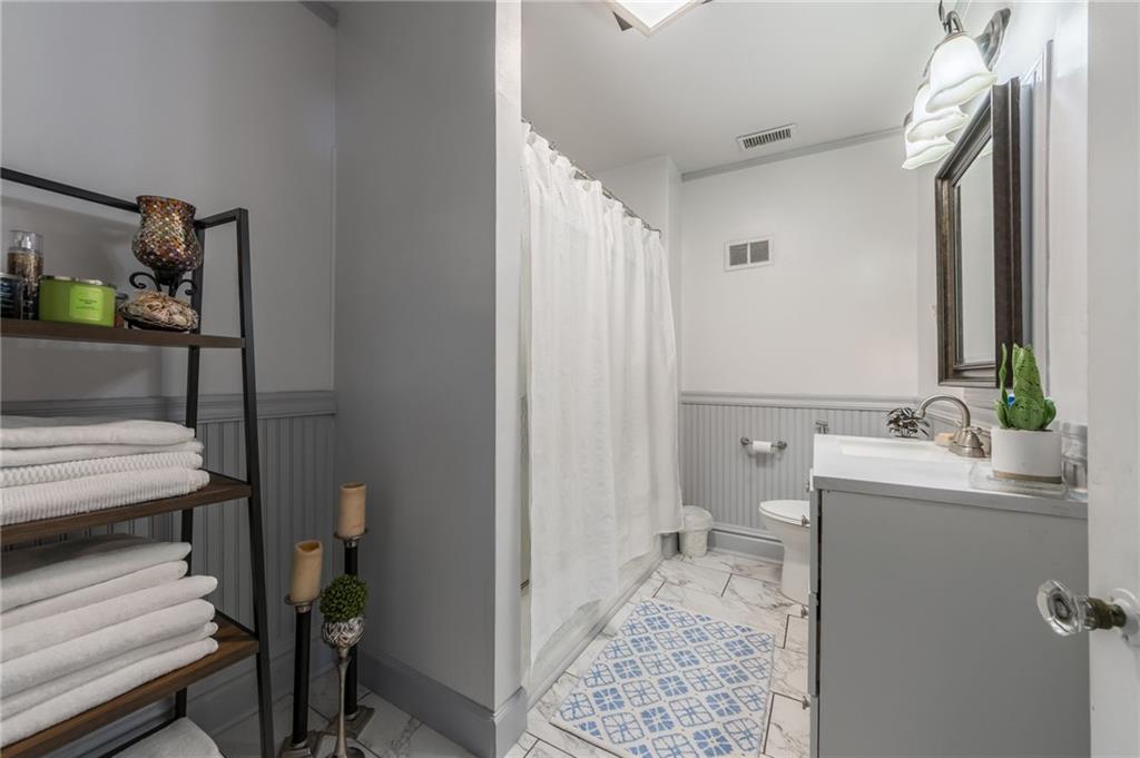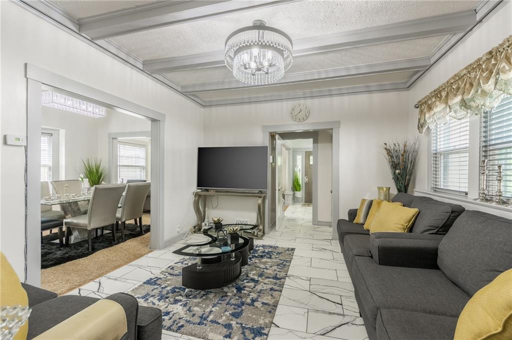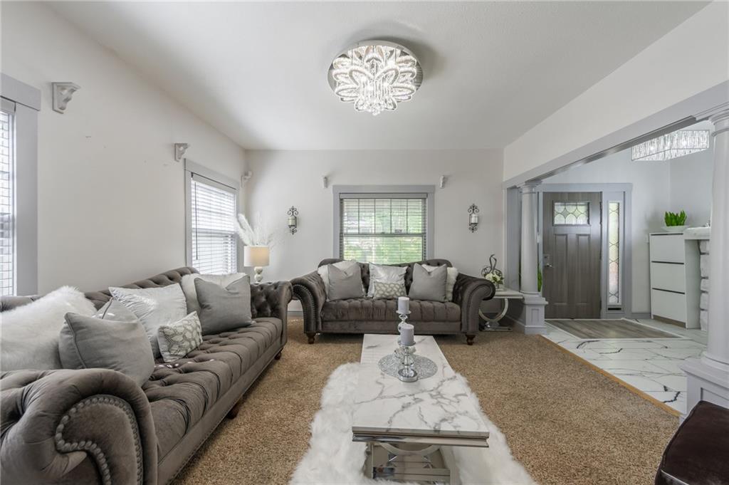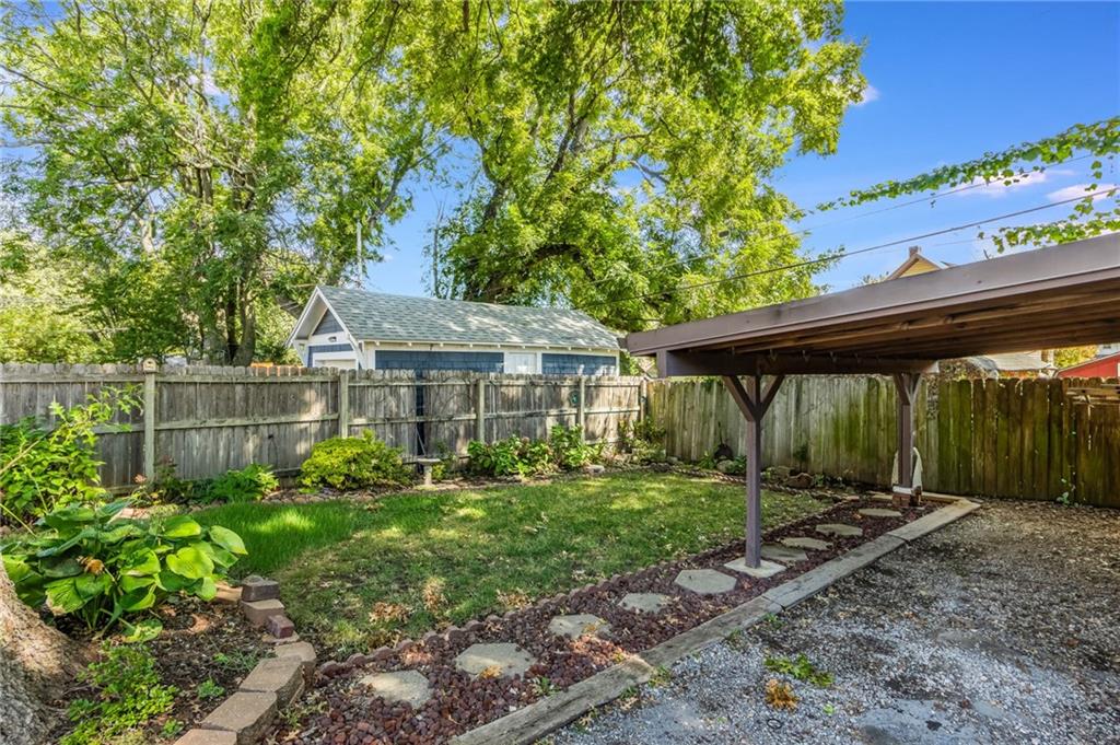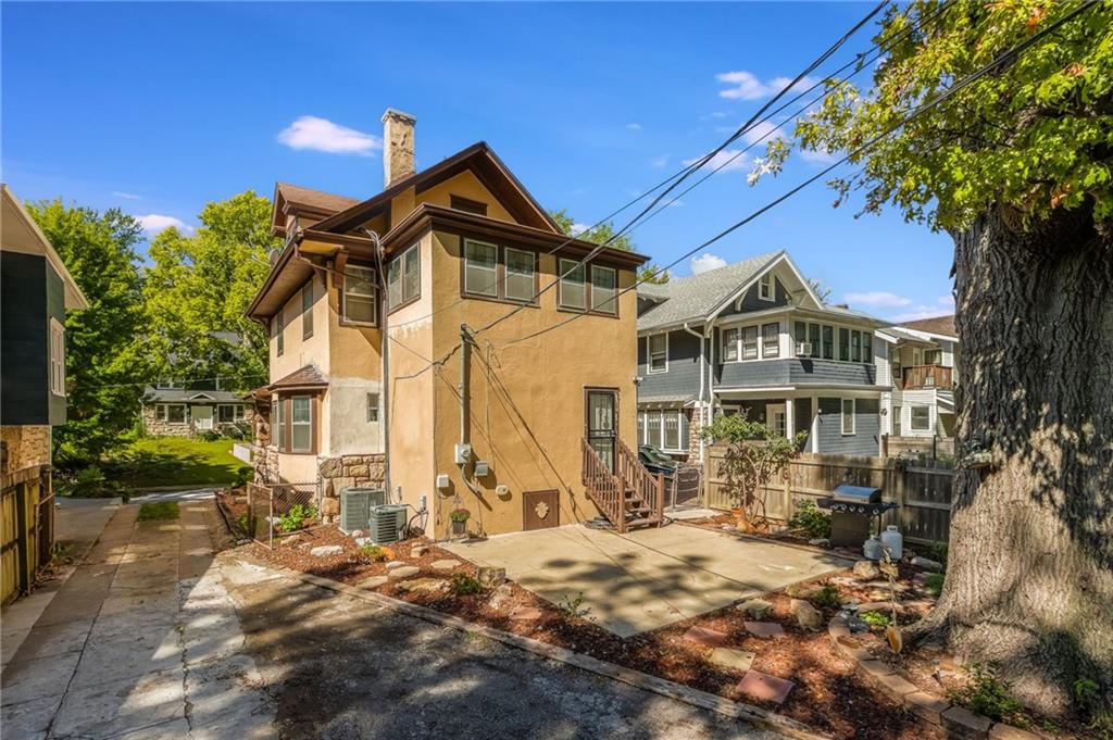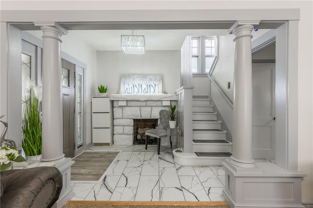 Prepared to be in aww as you walk through the front door of this beautifully remodeled Shirtwaist home located in Kansas City’s Historic Northeast. This classic turn-of-the-century style retains its original character including the signature stone foundation, front gable, and covered front porch while offering extensive modern updates to the main level. Interior features include a bright entry foyer with white masonry fireplace, marble-patterned tile flooring (original hardwoods underneath), and fresh paint throughout. The main level offers formal living and dining rooms with updated lighting, bay window, and new blinds, along with a family room and a remodeled ¾ bath (2024). The updated kitchen (2024) includes new cabinetry, countertops, sink, faucet, and appliances. Gas line is available behind the current electric range. The second floor features three bedrooms, including a spacious primary bedroom with access to a sunroom room that also serves as a laundry area with washer & dryer hookups. The full bath has been updated, and the attic provides ample storage or potential additional living space. Zoned HVAC services the second floor and attic. The lower level includes a finished office area, utility space, and additional shower & toilet. Exterior improvements include widened driveway, updated concrete, new landscaping, patio, three-sided privacy fence, detached garage, and lean-to. Numerous updates completed in 2024, including fresh interior paint, remodeled bathrooms, kitchen updates, and exterior improvements. This property offers a rare combination of historic charm and modern functionality.
