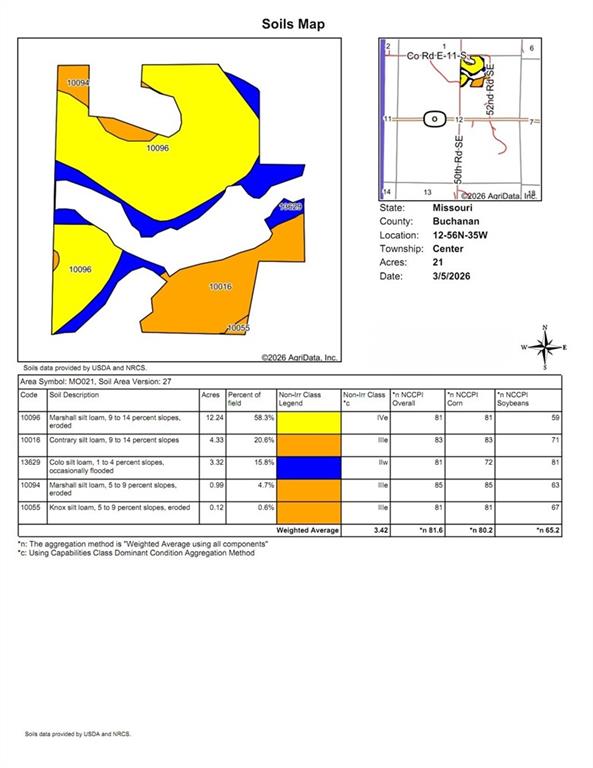 Located just 5 minutes from St. Joseph, this diversified 29± acre property in Buchanan County, MO offers a rare blend of productivity, accessibility, and scenic appeal. Situated within the highly sought after Mid Buchanan School District. This farm has great hard surface access along both the eastern and northern boundaries. Approximately 13± acres are currently in row crop production, with additional acreage in pasture. FSA mapping indicates strong potential to convert more acres to tillable ground, enhancing the farm’s income producing capacity. The property is open for the 2026 crop season, or the current owner is willing to lease back the tillable acres—providing immediate return for an investor. The farm features quality soils including Marshall, Contrary, Colo, and Knox silt loams, with an impressive NCCPI rating of 81.6, roughly 10 points above the county average. Portions of the cropland have been terraced, further supporting long term productivity and value. A standout highlight is the 4± acre stocked pond positioned near the center of the property. This beautiful water feature provides breathtaking views from multiple vantage points making this property a strong candidate for a forever home. Buyer to verify all building sizes and dimensions. Building #1: A steel frame, clear span structure measuring approximately 48' x 100'. This versatile building includes office space, partial concrete flooring (approx. 25%), and two oversized sliding doors (approx. 22'W x 13'H and 24'W x 13'H), along with additional access points—ideal for equipment storage, workshop use, or operational needs. Building #2: A traditional wood and metal hay barn measuring approximately 38' x 60', offering multiple functional areas: • 30' x 38' hay/equip. storage • 15' x 38' lean to • 15' x 38' livestock loafing/run Utilities • Electric service is available onsite. • Water service previously supplied by local water company (buyer to verify availability & connection)