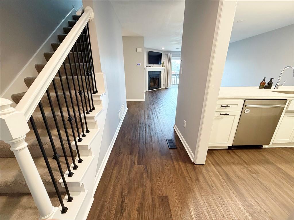 Beautifully updated 2-bedroom townhome in a prime Mission location, close to shopping, restaurants, and easy highway access. Enjoy low-maintenance living in a well-maintained community. The main level features a spacious living room with fireplace, a fully updated kitchen with quartz countertops and appliances that stay with the home, a convenient half bath, and a private balcony. All ceilings have been scraped and textured, with fresh interior paint and new carpet throughout. Upstairs you’ll find the vaulted primary suite with three closets and a large bathroom with double vanities. A second bedroom provides great space for guests or a home office. Washer and dryer also stay with the home. Rare two-car garage with extra storage space. Move-in ready with modern updates and a fantastic location. Come take a look at your new home!