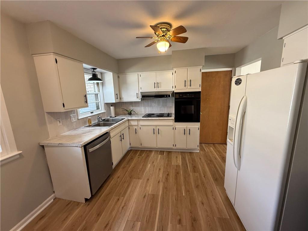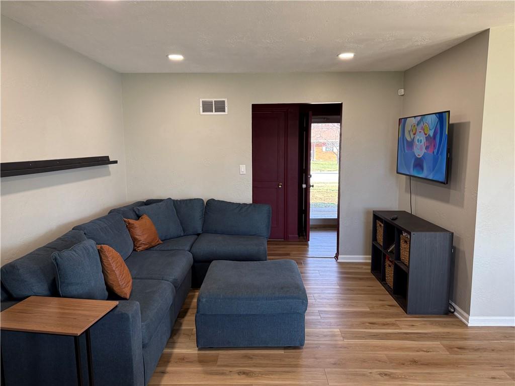 This classic corner ranch is ideally located in the heart of Blue Springs, within walking distance to local parks and downtown amenities. Enjoy outdoor living with a privacy-fenced backyard and covered patio, perfect for relaxing or entertaining. The inviting front porch provides a great space for seasonal décor or simply enjoying the shade. Inside, the home features a bright and open dining and great room combination, filled with natural light and highlighted by an oversized stone fireplace. The kitchen includes painted cabinetry, new luxury flooring, and updated light fixtures. The interior has been freshly painted within the last two years. Many new interior lights have been replaced. Recent updates provide peace of mind, including: New hot water heater (within 2 years) Roof approximately 7 years old HVAC approximately 8 years old Sewer line recently replaced with a 10-year warranty. Hardwood floors remain beneath the new flooring throughout the home. The full basement offers additional potential and is stubbed for a half bath. Laundry is conveniently located both in the basement and in the 3rd bedroom closet. The exterior features durable steel siding with a brick front, contributing to excellent energy efficiency and low utility costs. Oversized garage has a cedar closet. A wonderful opportunity to own a well-maintained home in a great location!