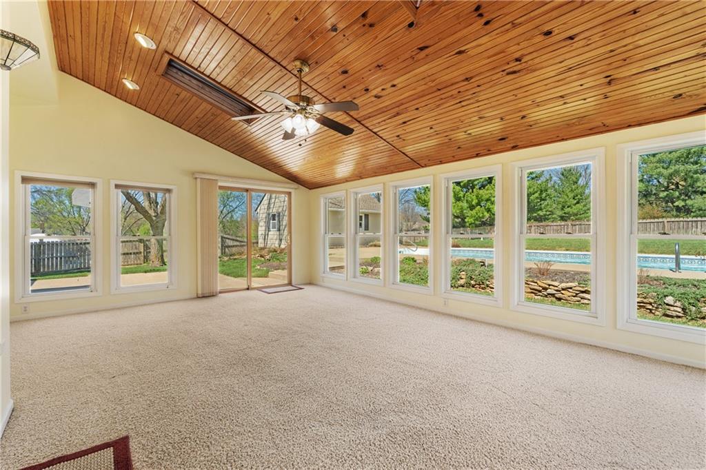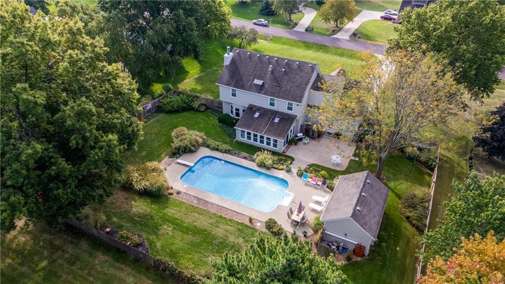 Tucked away in the desirable Harmony South neighborhood, this classic Colonial-style home offers a rare blend of space, comfort, and a peaceful one-acre setting. The main floor features a traditional layout with a formal dining room and a dedicated home office with built-ins just off the entry. The living room is warm and inviting with a bay window, brick fireplace, and custom built-ins, creating a perfect place to gather. The kitchen is designed with functionality in mind, offering abundant cabinetry, generous counter space, and granite countertops for everyday living and entertaining. Upstairs, the primary suite provides a private retreat with tray ceilings, a separate sitting area, and an ensuite bath complete with double vanities, vaulted ceilings, a soaking tub, separate shower, and skylight. Additional bedrooms are comfortably sized and offer flexibility for family or guests. The finished basement expands the living space and can easily serve as a recreation room, workout area, hobby space, or media room. A standout feature of the home is the bright all-weather porch, surrounded by windows and filled with natural light, making it the perfect spot to relax, watch the seasons change, or enjoy game days. The backyard is truly special, featuring an oversized saltwater pool, mature landscaping, fruit trees, and grapevines that produce annually. A patio extends the outdoor living space, and a convenient shed near the pool provides storage for equipment and supplies. Set in a quiet, established community known for its friendly atmosphere, this home also offers exceptional access to everything South Overland Park has to offer, including parks, shopping, healthcare, highways, and the Arboretum, along with highly regarded schools nearby. This property combines everyday comfort with a private, retreat-like setting in a location that makes daily life easy and enjoyable.