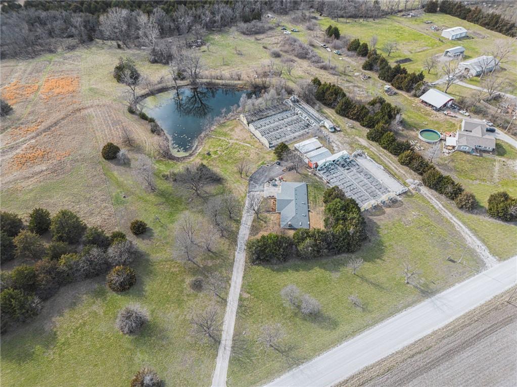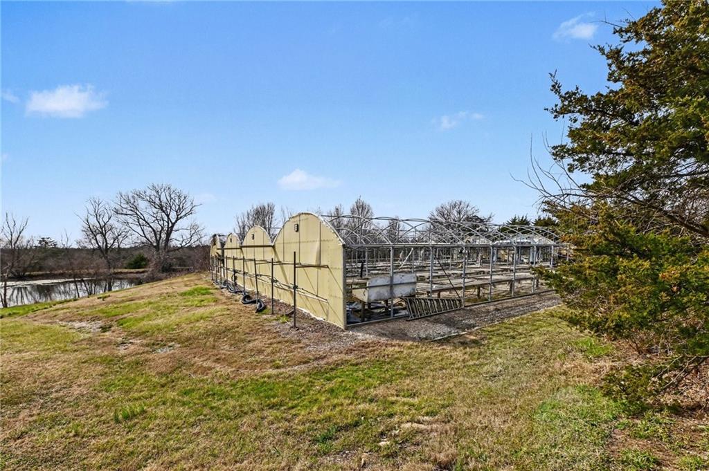 Beautiful 3-bedroom, 2.5-bath energy-efficient ranch home set on 19± picturesque acres offering the perfect balance of peaceful country living and convenient highway access. This well-maintained home features an inviting open floor plan designed for comfort and gathering. The gorgeous country kitchen with Granite counter tops is the heart of the home, complete with updated appliances, a breakfast bar, and an incredible kitchen island ideal for large family gatherings or smaller intimate meals. The spacious great room is sure to impress with its stone wood-burning fireplace with insert, built-in shelving, and large south-facing windows that flood the space with natural light while helping keep utility costs low. Energy efficiency is a key feature of this home, making it both comfortable and economical year-round. Step outside onto the covered front patio where you can enjoy beautiful sunrises and sunsets, listen to the rain, or relax to the sounds of birds and nature. The property offers plenty of room to spread out and enjoy the outdoors, including a spring-fed pond, several barns and outbuildings, and wide open acreage with endless possibilities. If garage space is a priority, this home delivers with a large, tandem 3-car garage featuring built-in storage shelves and plenty of room for vehicles, equipment, or workshop space. This unique opportunity includes 8 greenhouses along with two Morton buildings for additional storage or workspace. In recent years the sellers have scaled back the nursery operations, running the business with just the two of them, leaving tremendous opportunity for a new owner to grow and expand. Despite the quiet rural setting, the property offers excellent access to K-32, Highway 24-40 between Bonner Springs and Lawrence, and I-70, making it easy to reach nearby towns, shopping, and commuting routes. This exceptional property offers space, privacy, income potential, and convenience all in one remarkable package