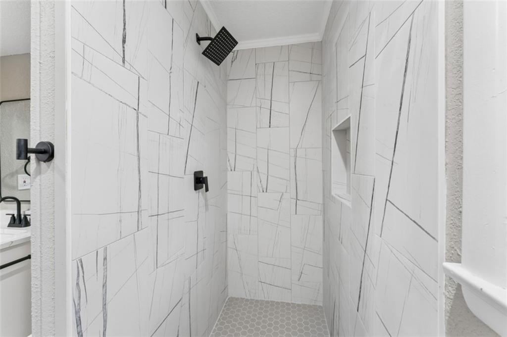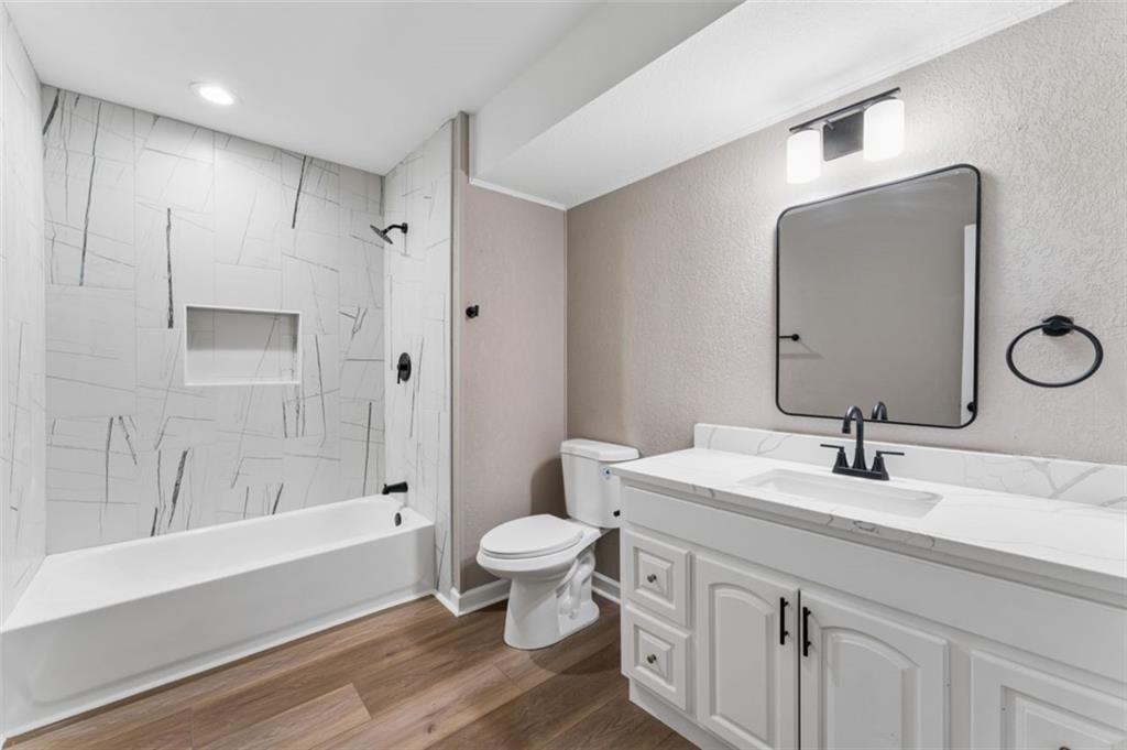 Beautifully remodeled 5 bedroom, 2.5 bath home offering over 3,500 finished square feet of living space. The main level features refinished hardwood floors, a spacious living area with a striking brick fireplace, and an open layout that flows into the fully updated kitchen with quartz countertops, custom cabinetry, stainless steel appliances, and subway tile backsplash. Sliding doors lead to a deck overlooking the backyard, perfect for relaxing or entertaining. The finished lower level provides over 1,400 additional square feet of flexible living space ideal for a family room, office, or guest area. Move-in ready with modern updates throughout and conveniently located near shopping, dining, and major highways.