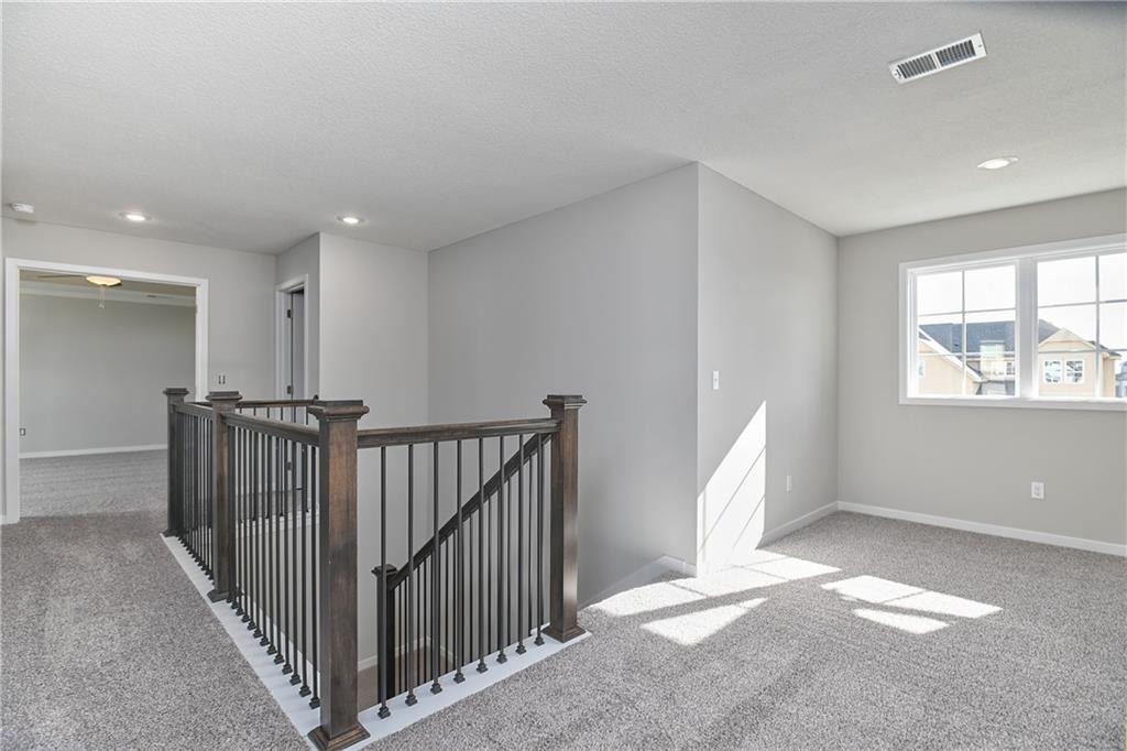 The popular Levi II by Prieb Homes is now available on a beautiful flat lot. The open-concept main floor features a spacious kitchen and breakfast area, a larger granite center island with ample seating. Kitchen offers soft close doors and drawers. Enjoy versatile living with a main floor flex room—perfect for a home office or 5th bedroom—plus a mud room with boot bench and entry closet. Upstairs, the expanded primary suite boasts a separate sitting area, larger walk-in closet for 2 different sections, and an upgraded primary bath with a freestanding tub. The laundry room has been enhanced with additional workspace, and the open loft with window provides extra living space. Located within walking distance to Lake Olathe, this home also offers access to neighborhood amenities including trails, a pool, and playground. Don’t miss your chance to own this upgraded and spacious home in a prime location!