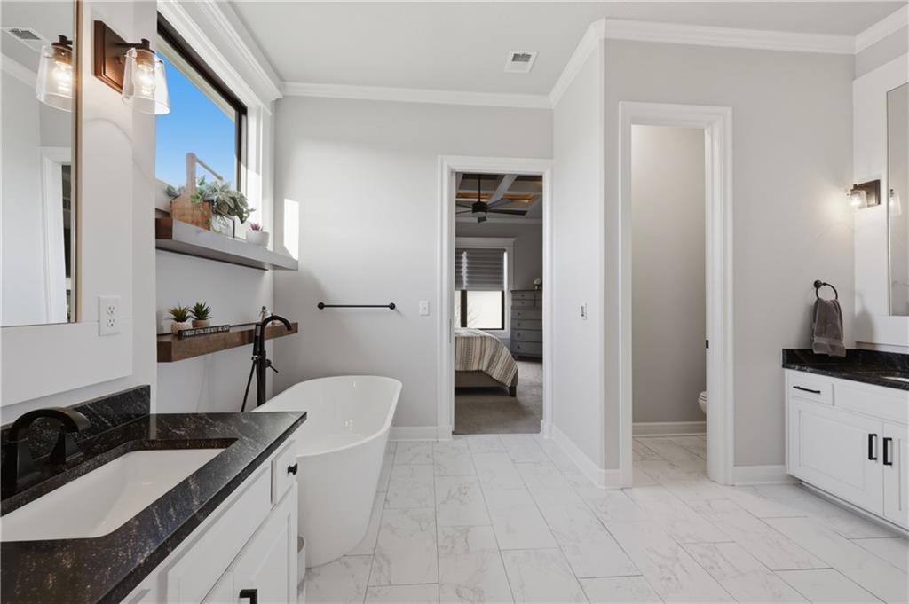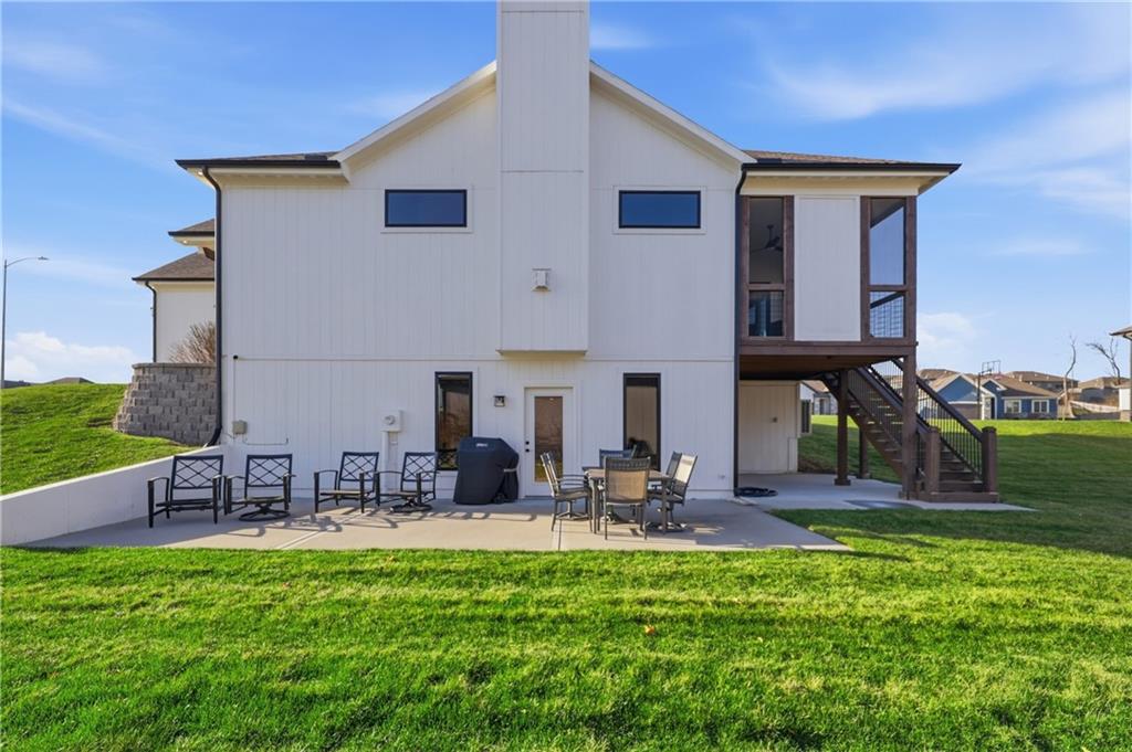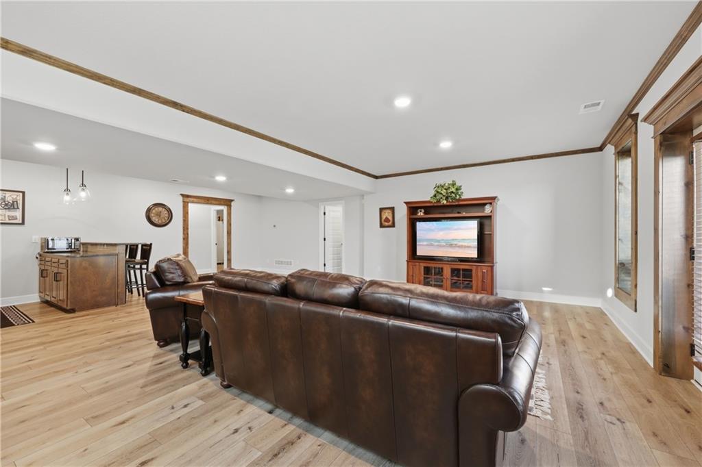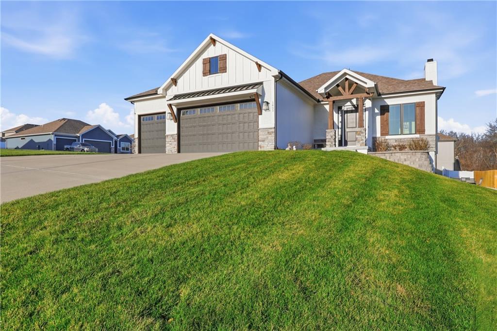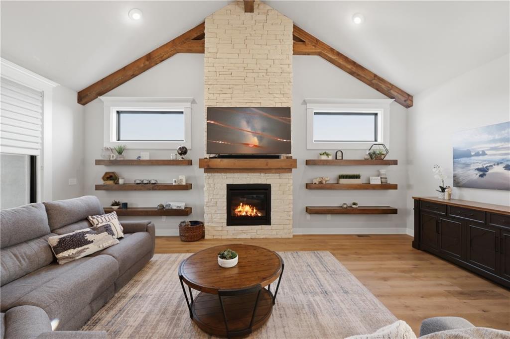 Beautiful custom-built, one-owner reverse 1.5 story offering quality craftsmanship and thoughtful upgrades throughout. This stunning home features soaring ceilings with exposed beams, creating a warm and inviting open floor plan. The spacious kitchen is equipped with high-end KitchenAid appliances, ample cabinetry, and flows seamlessly to an enclosed deck just off the kitchen—perfect for relaxing or entertaining. Enjoy the comfort of heated floors, custom blinds, tankless hot water, and dual-zoned HVAC for year-round efficiency. The main level offers generous living space while the finished walkout basement expands the home with additional living areas, bar, and plenty of room for guests or entertaining. This home includes 3 bedrooms and 4 bathrooms, providing space and privacy for everyone. You will appreciate the oversized 3-car garage featuring durable epoxy floors. Enjoy a lush, well maintained lawn made easy with a full ground sprinkler system. A rare opportunity to own a beautifully maintained custom home with premium upgrades and exceptional attention to detail.