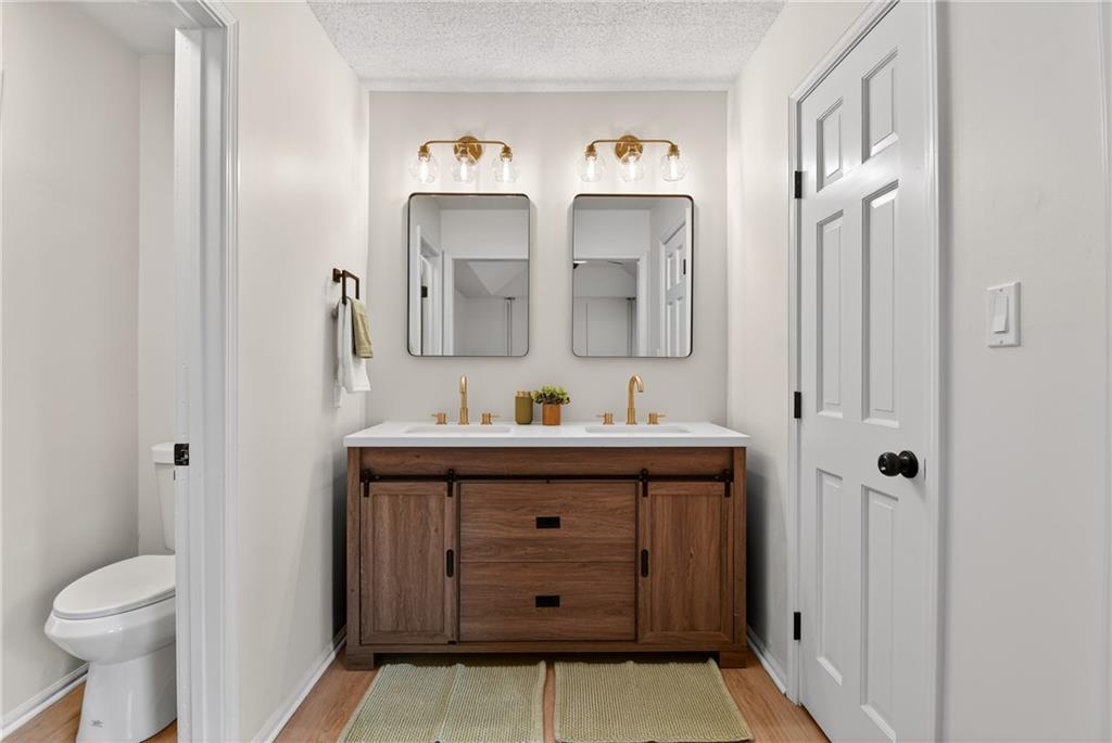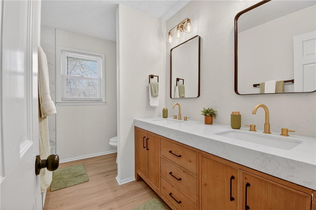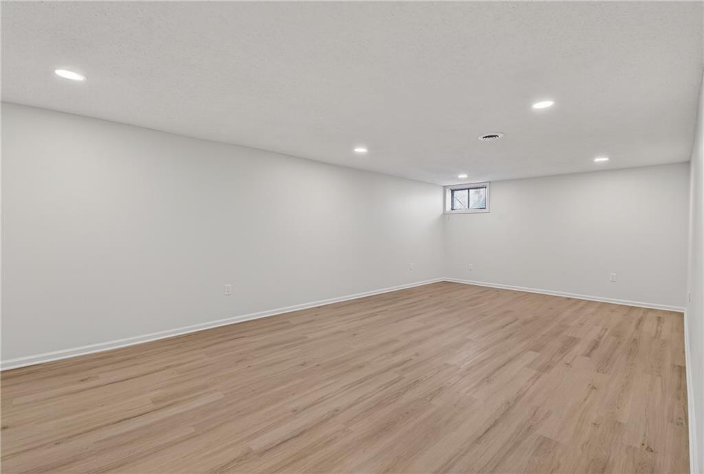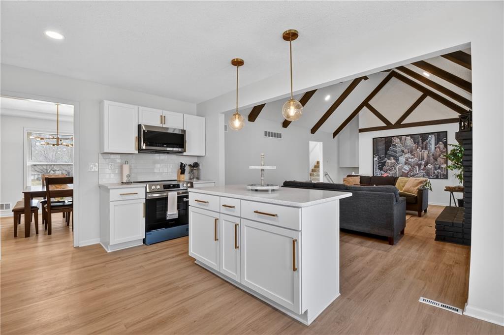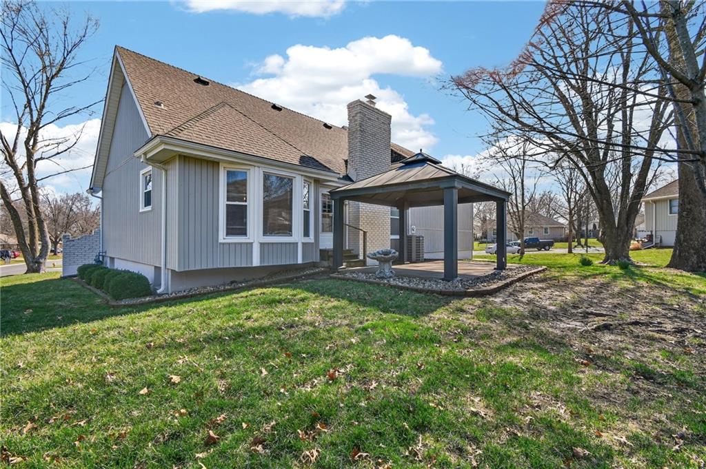 This home has been completely and beautifully remodeled with a design you are going to love, featuring bold accents and modern touches throughout. The kitchen highlights new cabinets, quartz countertops, a subway tile backsplash, and stainless-steel appliances. It is an entertainer's delight with an open concept, large central island, a breakfast eat-in space and formal dining room complete with a bold accent wall and overflow wine storage that shows as artwork. Black and gold fixtures add a stylish modern appeal, and the beautiful light fixtures throughout the home complete the updated look. You will love the foyer entrance with beautiful accent wall, built in storage and bench, and modern chandelier. The main level has a great formal room with gas starter fireplace, a vaulted ceiling, and walk out to a covered patio. Upstairs are three bedrooms and two full baths, including a HUGE primary bedroom. The ground level features a fourth bedroom on the same level as the garage, along with laundry and a half bath. The basement includes a third full bathroom and large finished space with unlimited possibilities. There is three hundred plus sq feet of unfinished storage space as well. A NEW HVAC in May 2023 will have you living in comfort for years to come. Exterior features including vinyl siding, thermal windows, a cute shed, and a large corner lot make this home a must see. Book your tour today!