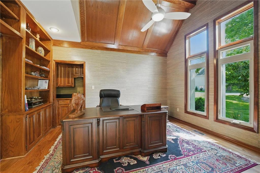 Welcome to this standout home in Tremont Manor where beautiful design and everyday comfort come together. This spacious 1.5 story offers 4 bedrooms and 4.1 bathrooms with a layout that flows effortlessly for daily living and hosting friends and family. The main level feels bright and welcoming with tall ceilings, large windows, and inviting gathering spaces. A charming sitting room, spacious eat in kitchen, and cozy family room with fireplace create the perfect setting for relaxing or entertaining. The dedicated office features a stunning paneled wood ceiling that adds rich character and warmth. Upstairs, a lofted living area offers flexible space for a second hangout zone or study area. The bedrooms throughout the home are generously sized, including bedroom three which includes an oversized bonus room perfect for a playroom, lounge, or creative studio. The walkout lower level is ready for entertaining. Enjoy a full second kitchen, custom theater room, additional living area, workout room, and a second fireplace that makes the space feel comfortable and inviting. There is also a second private office and extra storage tucked into the suspended garage area. Step outside to a peaceful backyard retreat featuring a screened in composite deck, open air deck space, and a walkout patio that leads to mature fruit trees and scenic creek views. It feels like your own private escape while still being close to everything Kansas City has to offer. This Tremont Manor home delivers space, style, and thoughtful details around every corner. Come see it in person and fall in love.