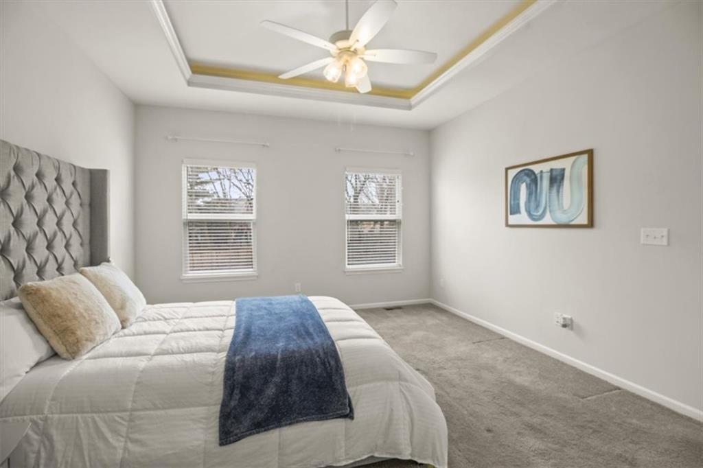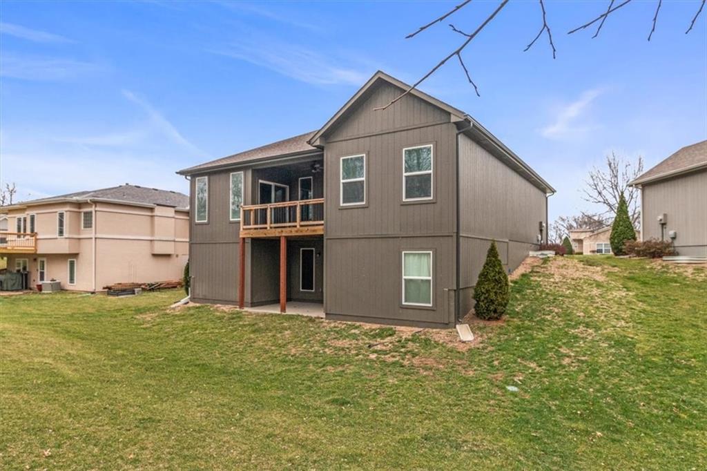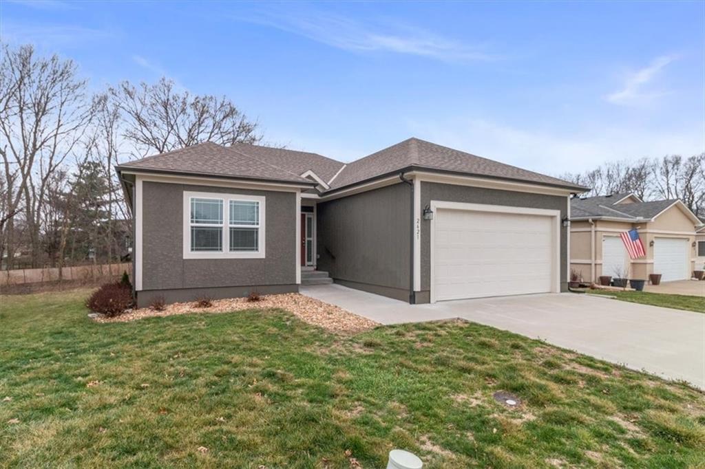 Welcome to your dream retreat in Blue Springs, where modern sophistication meets suburban tranquility. This stunning contemporary ranch immediately captivates with impeccable curb appeal, featuring a sleek exterior and an inviting front door. Step inside to an expansive open-concept great room, where soaring ceilings and a magnificent ten-blade farmhouse fan create an airy, upscale atmosphere. The living area, anchored by a cozy fireplace with a classic white mantel, flows seamlessly into a gourmet kitchen designed for the modern chef. You will love the rich custom cabinetry, gleaming granite countertops, and a sprawling center island—perfect for morning coffee or hosting vibrant gatherings. High-end stainless appliances and a spacious pantry ensure this kitchen is as functional as it is beautiful. The main-floor primary suite serves as a sanctuary, boasting a tray ceiling, plush carpeting, and an abundance of natural light. It leads into a spa-like ensuite featuring a dual-sink vanity and a massive walk-in closet. Practicality is a priority here, with a dedicated main-level laundry room conveniently located off the kitchen. For those who love the outdoors, the covered composite deck offers a peaceful vantage point overlooking a lush yard that adjoins serene greenspace, while the walk-out basement provides endless potential for a future recreation room or gym. Nestled in a quiet area within the highly-rated Blue Springs School District, this home offers more than just a place to live—it provides a lifestyle. Residents enjoy fantastic community amenities including a sparkling swimming pool, clubhouse, and stress-free living with provided lawn maintenance and snow removal. Just minutes from local parks and premier shopping, this move-in-ready gem is the perfect blend of luxury and convenience.