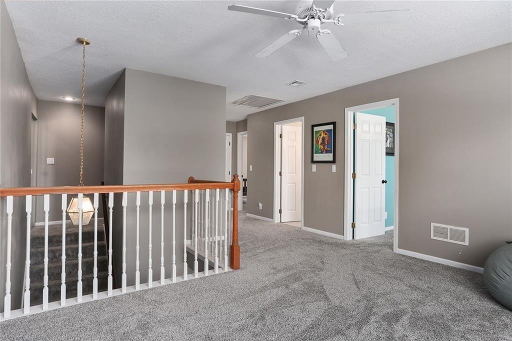 Upstairs Hallway! Door to the left is the 2nd Bedroom, moving to the right the full bath, then last door 3rd bedroom and a look into the spacious loft area. The door knob on the far right of picture is the laundry closet