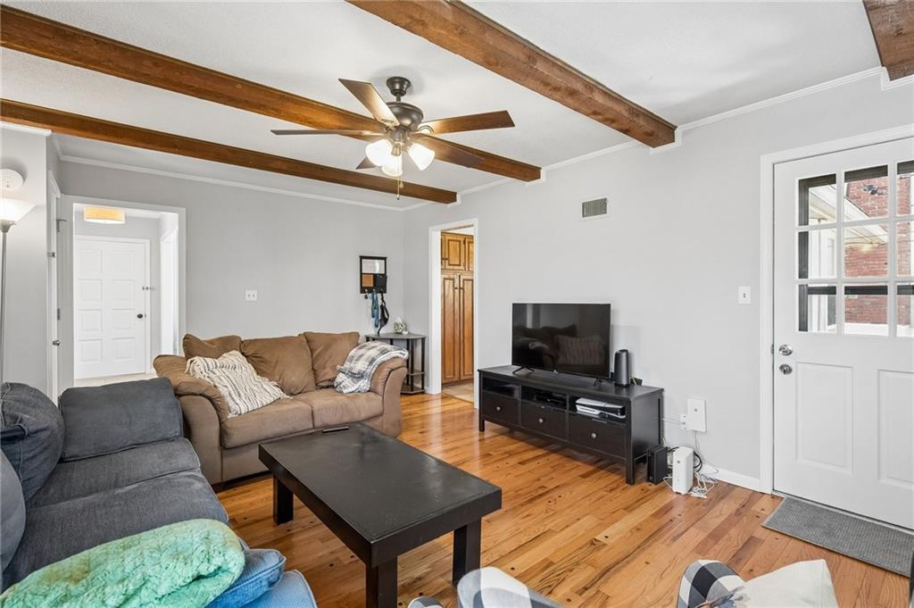 Spacious 4 bed 2.5 bath. Main level has beautiful hardwoods and exposed beams in family room with built ins and fireplace! Stylish eat in kitchen and formal dining area as well as laundry room and half bath all on main level. Full basement and oversized garage provide plenty of storage space