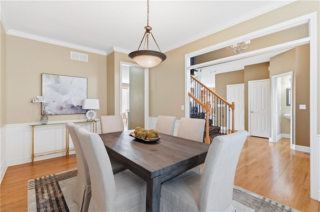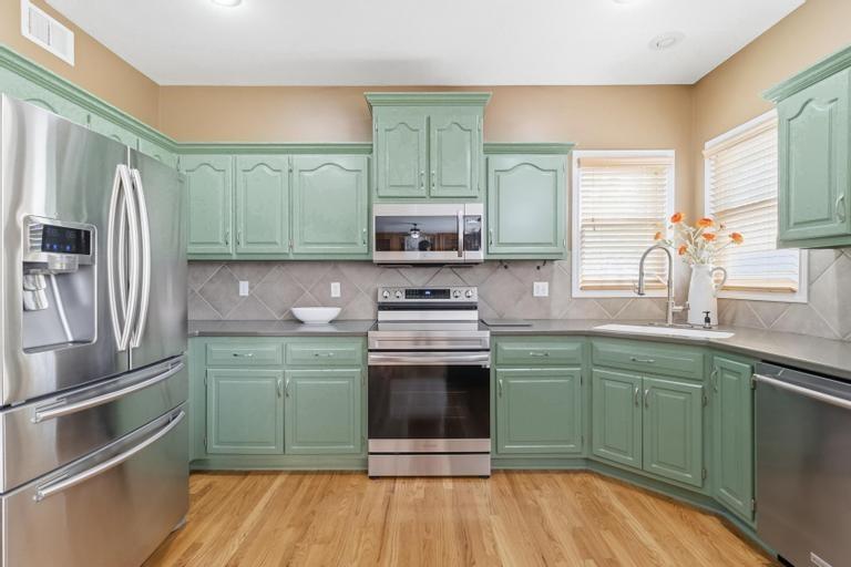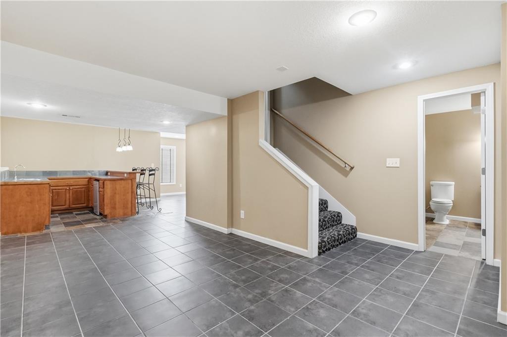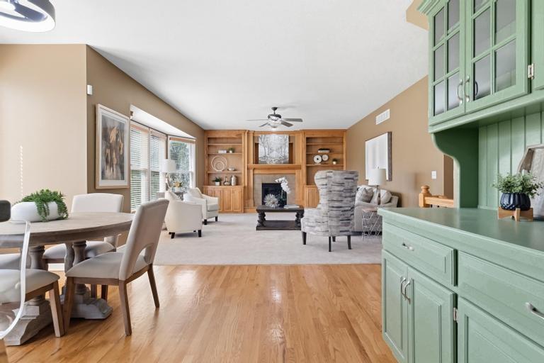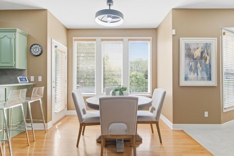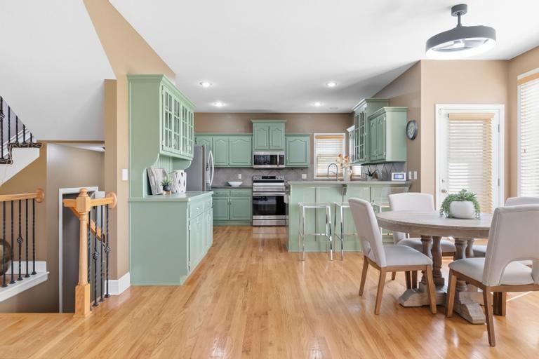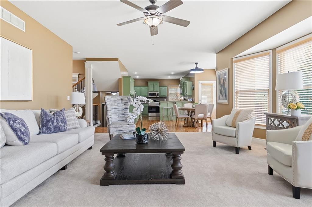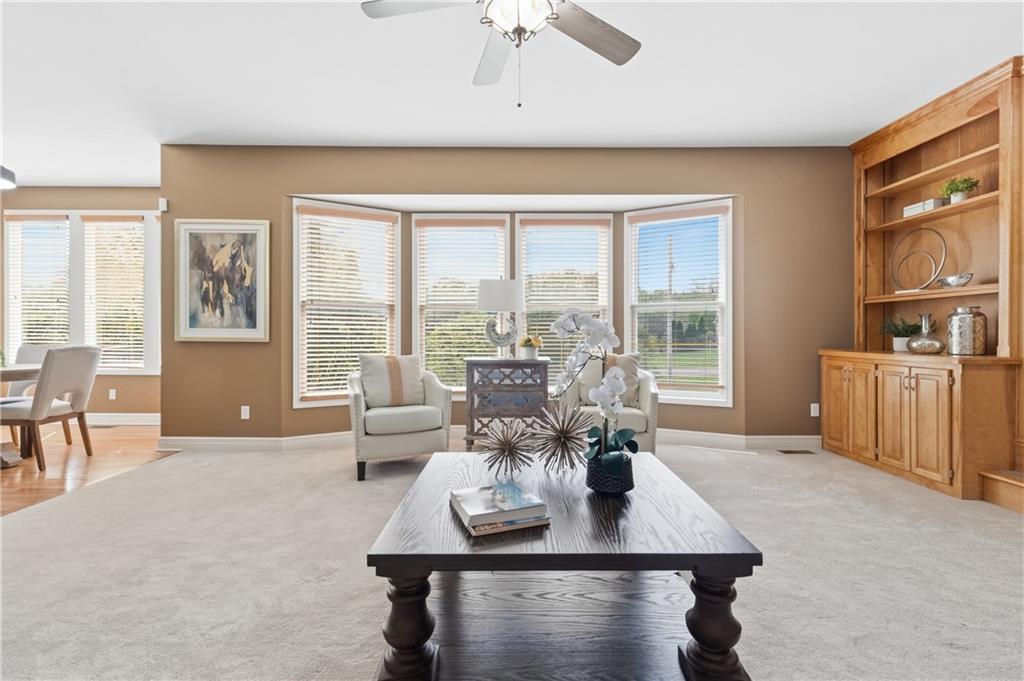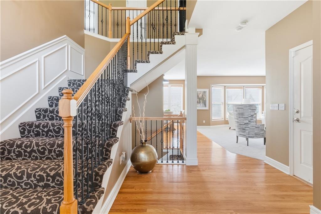 This meticulously maintained home is a great value in this sought after neighborhood! Welcoming entry with curved staircase. Home features hardwood floors in entrance, dining room, kitchen and breakfast room. The spacious great room offers built ins and a cozy gas fireplace. Kitchen boasts painted cabinets, SS appliances and great flow for everyday living. The primary suite features a sitting room, walk in closet, walk in shower and a bath with a jacuzzi tub. Secondary bedrooms offer large walk in closets. Convenient second floor laundry. The W/O lower level is filled with natural light and includes a wet bar and office space. Enjoy treed backyard with a deck and stamped concrete patio. Neighborhood amenities include walking trails, stocked pond, play area, and community pool, all just minutes from the elementary and middle schools. Home is surrounded by a 400 acre nature preserve with lakes, paved trails and abundant wildlife. Located in award winning Blue Valley Schools and convenient to shopping, dining, parks and quick highway access.