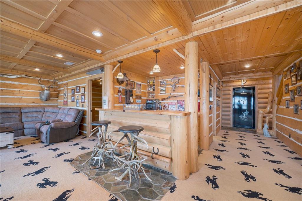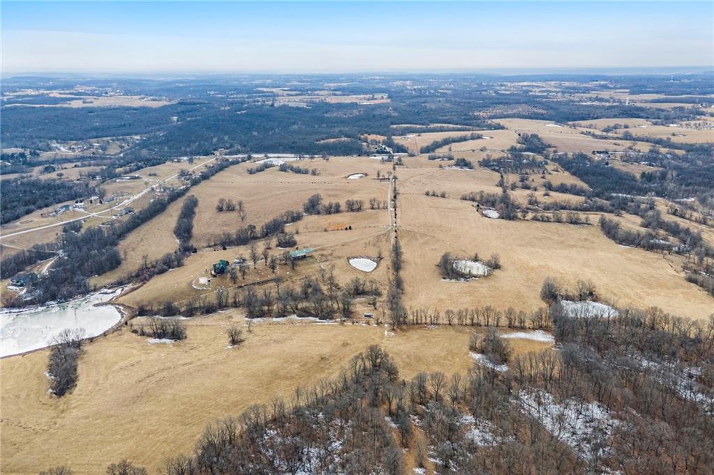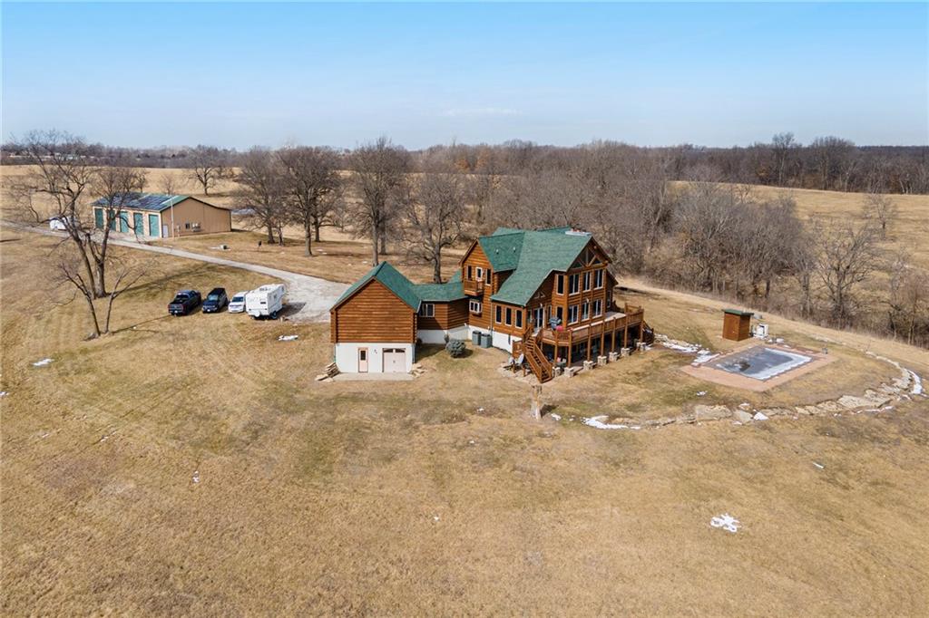 STUNNING CUSTOM LOG HOME located on 67+/- acres. Property has a 40x98 OUTBUILDING & lean to w/solar panels. PASTURE & TIMBER for your horses! This RURAL RETREAT offers loads of RECREATIONAL OPPORTUNITIES for you and your family! The 4 bedroom 4.5 bath home offers an OPEN PLAN perfect for entertaining! CHEF'S KITCHEN features HUGE ISLAND, granite tops, CUSTOM CABINETS w/roll outs, pantry, dining space & more! SOARING CEILINGS & so many windows to take in the VIEWS! Main level primary suite w/SITTING ROOM & BEAUTIFUL STONE FIREPLACE! Don't miss the spacious laundry and mud room space for convenience. The upper level has 2 SECONDARY BEDROOMS with their own PRIVATE BATHS, walk in closets and balconies. The LOFT SPACE overlooks the EXQUISITE GREAT ROOM, STONE FIREPLACE and WALL OF WINDOWS! Finished walk out LL has the 4th bedroom & full bath, 16x8 SAFE ROOM, bonus room, REC ROOM W/3RD stone fireplace and WET BAR and 2 storage spaces. RELAX and watch the SUNSETS & WILDLIFE from the low maintenance deck overlooking the SALT WATER IN GROUND POOL & LAKE! This is a ONE OF A KIND private retreat that has been meticulously maintained 30 minutes from Kansas City.
