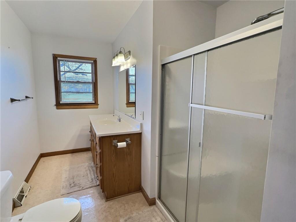 Bathroom with vanity and a stall shower