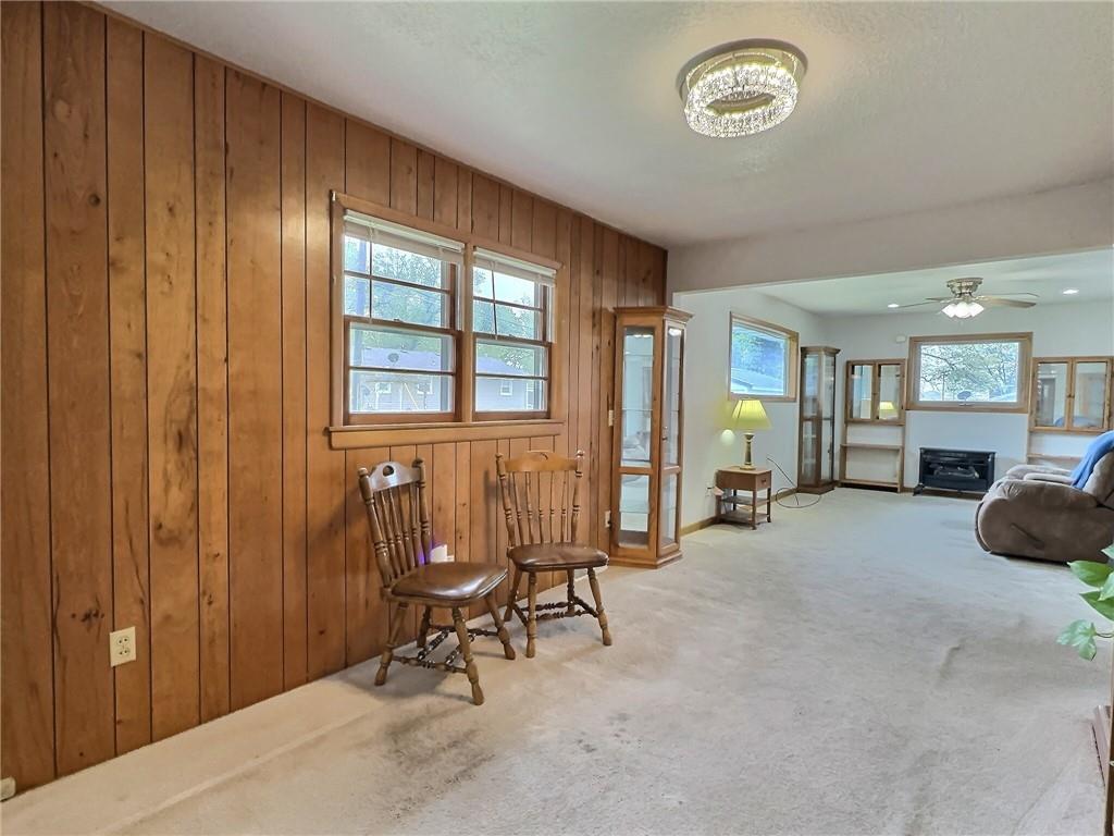 Sitting room with wooden walls, light carpet, a ceiling fan, and a fireplace