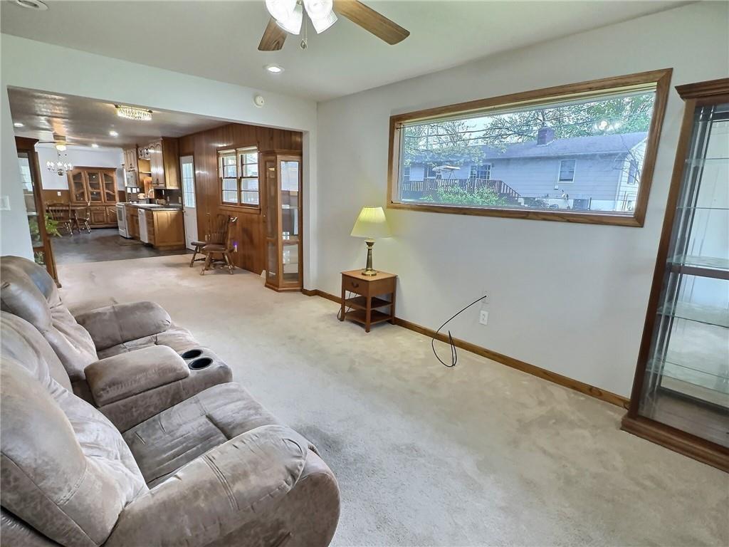 Living area featuring light colored carpet, a ceiling fan, recessed lighting, and wood walls