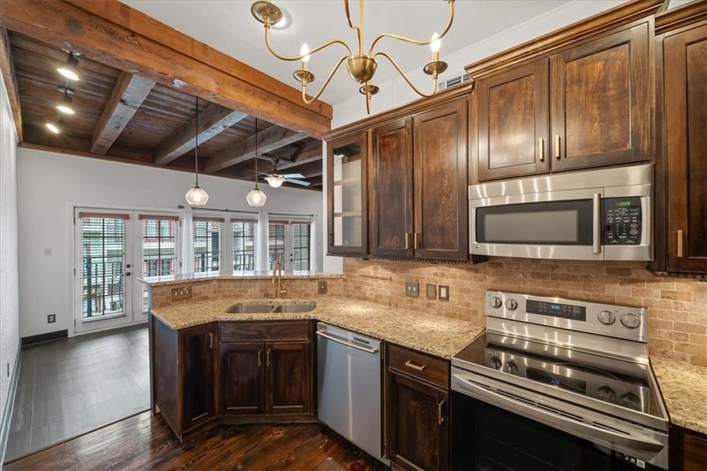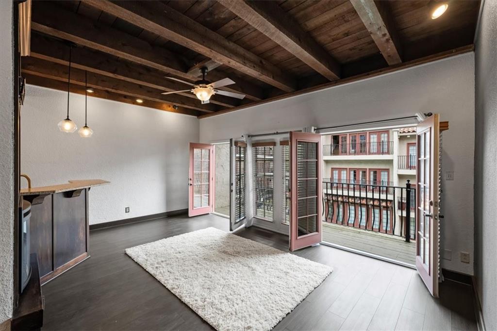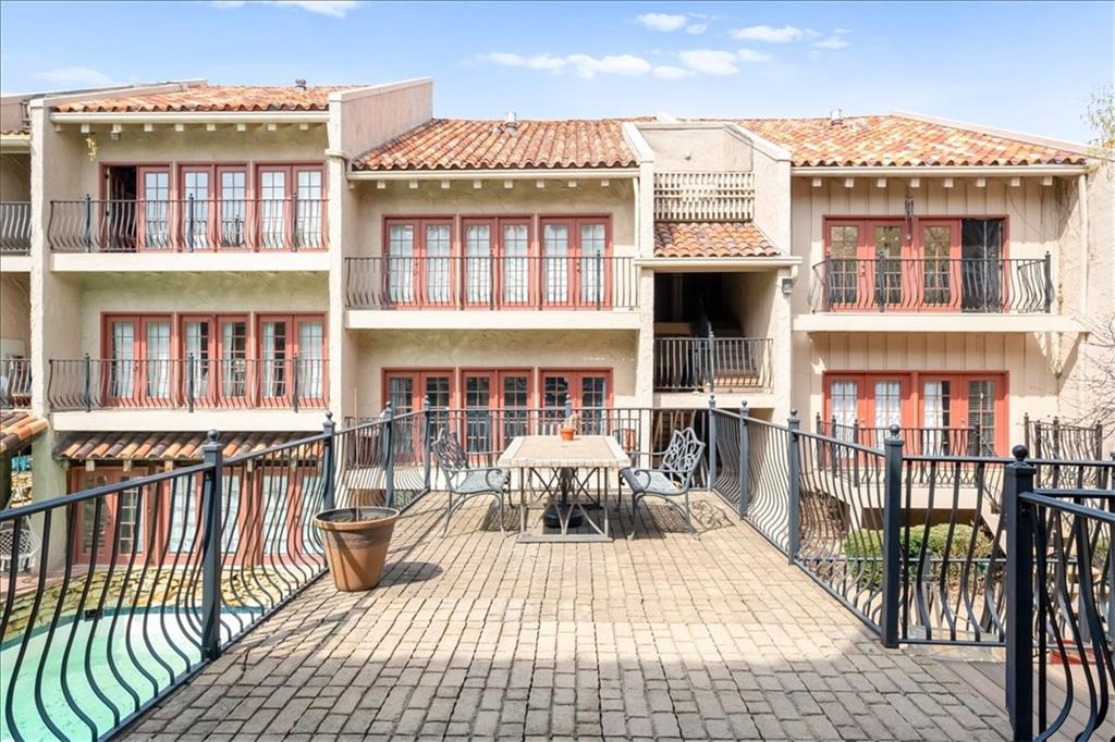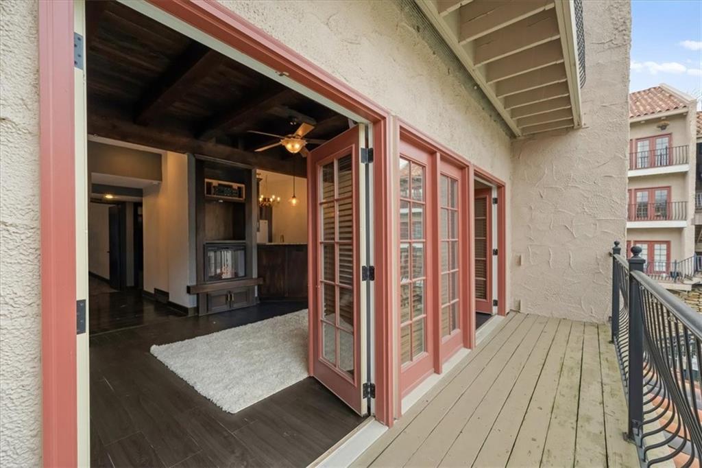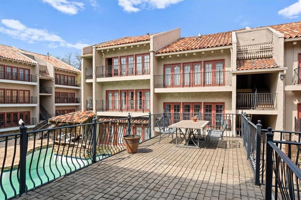 Bella Condominiums offers a lifestyle-focused living experience just moments from the Country Club Plaza. This charming Spanish-style community is centered around a resort-style pool, creating a relaxed, low-maintenance setting in a highly desirable location. This second-floor unit features true single-level living with a blend of character and thoughtful updates throughout. Interior highlights include exposed beams, wood floors, and an electric fireplace that anchors the main living space. The updated kitchen is equipped with modern finishes, ample cabinetry, and all appliances remain, including the in-unit washer/dryer combo. A standout feature of the home is the double French door entry leading to a covered deck with views overlooking the community pool—offering a seamless extension of the living space and a great spot to unwind. The unit includes two bedrooms with flexible use, along with an updated bathroom featuring quality finishes. One gated off-street parking space is included. Residents of Bella enjoy secured access and amenities such as a clubhouse, fitness center, poolside entertaining areas, and maintained grounds—ideal for a lock-and-leave lifestyle. Move-in ready and perfectly positioned near premier shopping, dining, and entertainment, this is an excellent opportunity to enjoy comfortable, convenient living near the Plaza.
