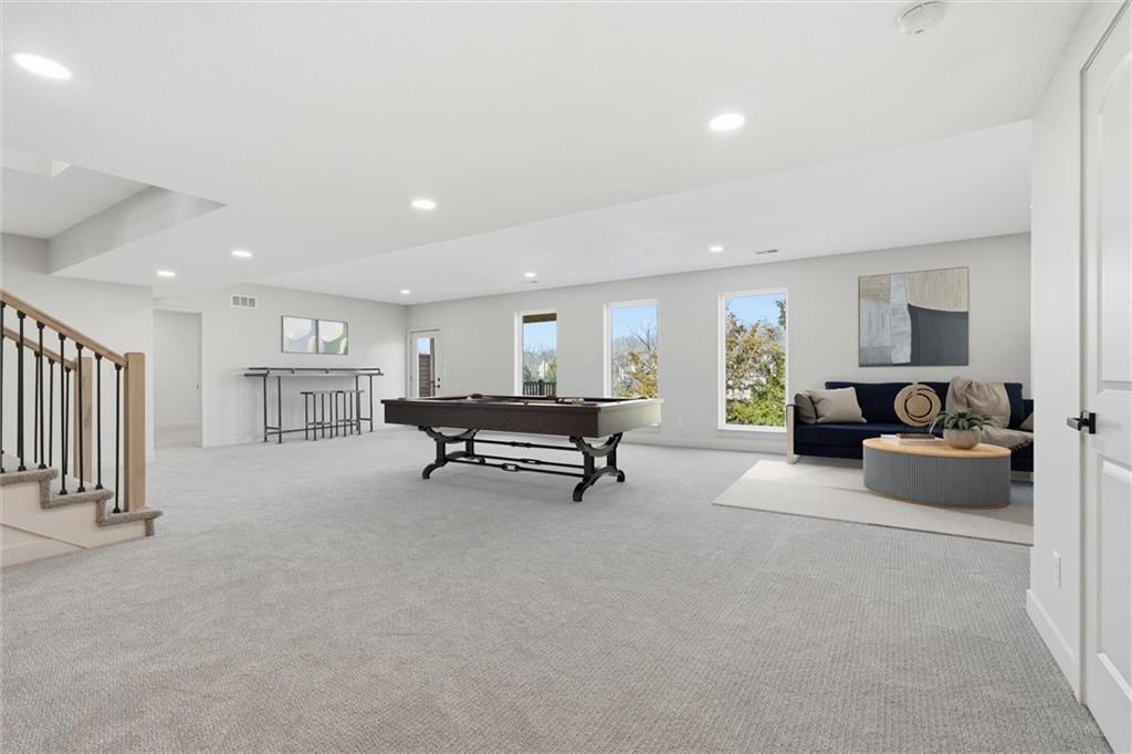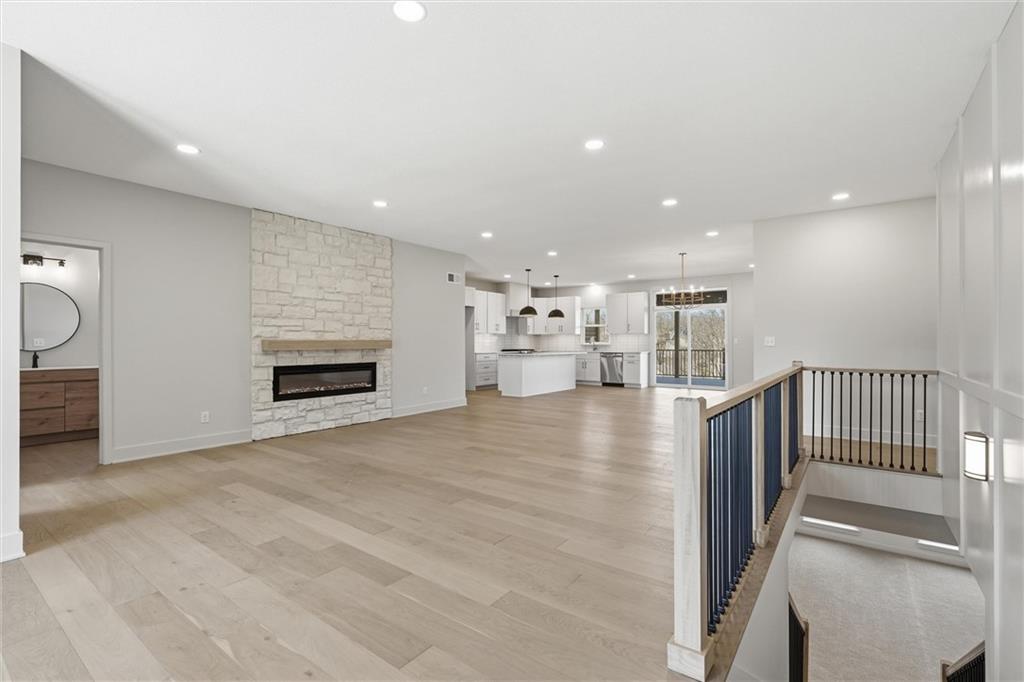 Stunning reverse 1.5 story NEW BUILD located in the desirable Fritchie Bluffs neighborhood featuring an open floor plan and thoughtful design. The main level offers two bedrooms including the spacious primary suite with spa like bathroom featuring soaking tub and an oversized walk-in closet accessible to the laundry room. Second main level bedroom could also serve as the perfect office with tons of natural light. Convenient mud room located off the three-car garage for an ideal drop zone for bags and shoes. The living room with stone fireplace opens up to the dining area and kitchen showcasing an 8-foot island, large walk-in working pantry with floating shelves, and a dedicated coffee bar. Three additional bedrooms and two full baths are located on the lower level all featuring HUGE walk-in closets, perfect for families or multigenerational living. The bright and inviting lower level features a wall of massive windows and is an entertainers dream with endless opportunities to make additional spaces into a theatre room, gym, or game room. Lower level also offers a dry bar area making entertaining a breeze! Walk out to your HUGE covered deck off each level thoughtfully constructed with maintenance free composite decking which overlooks a private, tree-lined backyard with stunning panoramic treetop views, perfect for relaxing in your quiet personal retreat. Additional highlights include a flat driveway, south-facing orientation, and a prime location close to award winning Lee's Summit schools, shopping, parks/trails, and Legacy Park Fields and Community Center! This is truly a rare opportunity to own a new construction home at an exceptional value for the area!