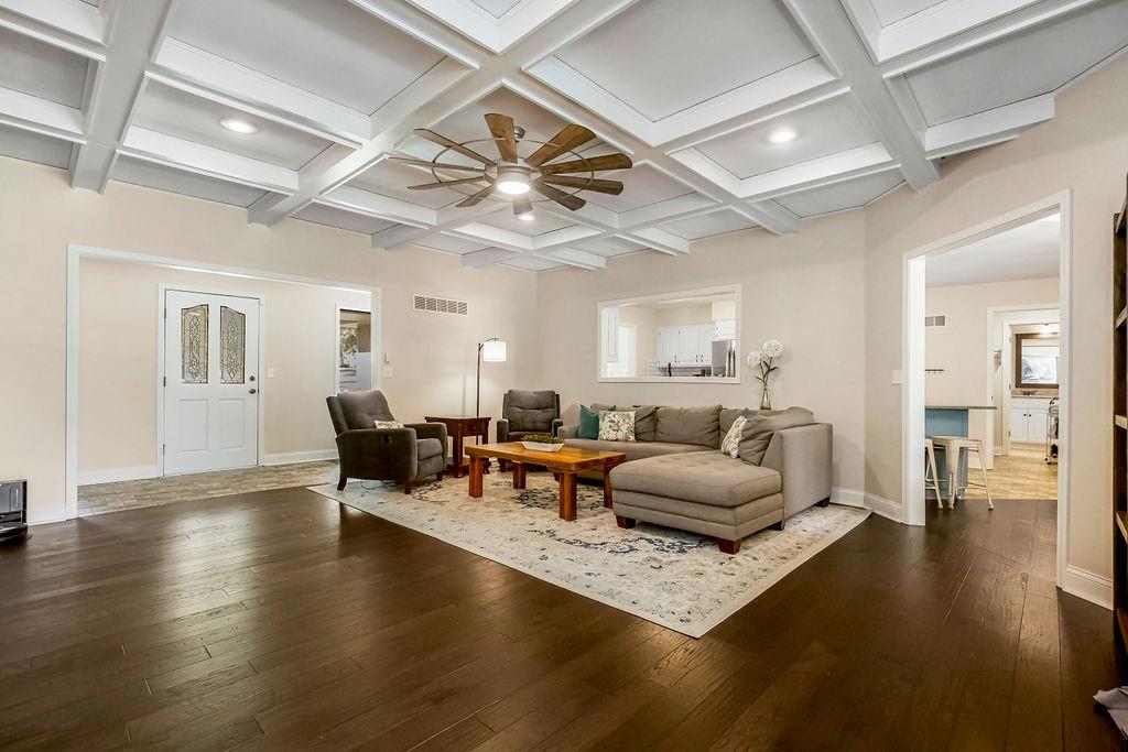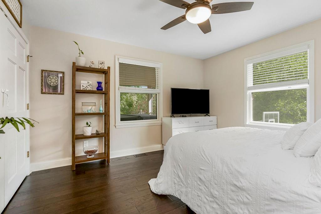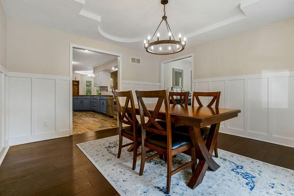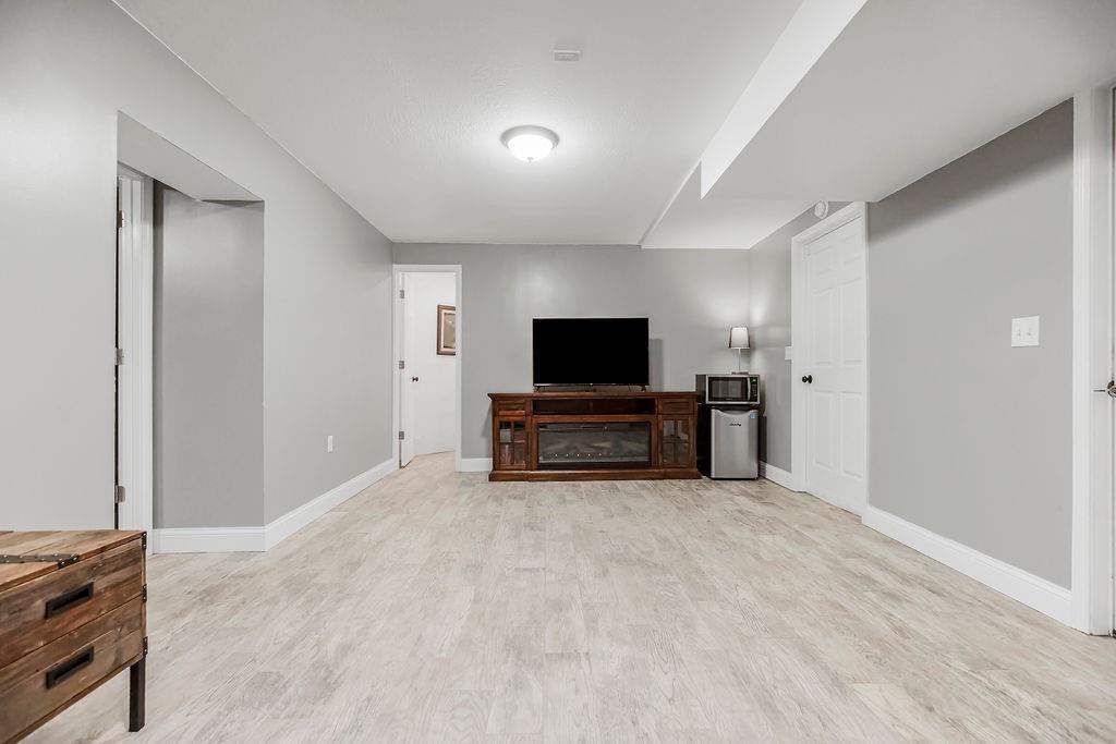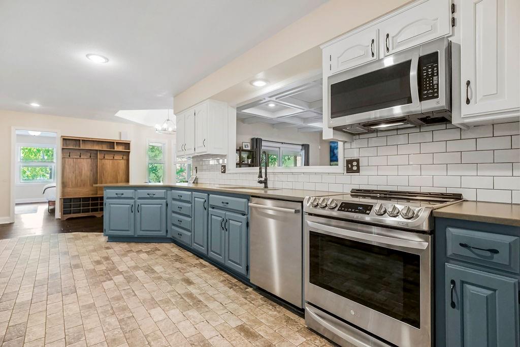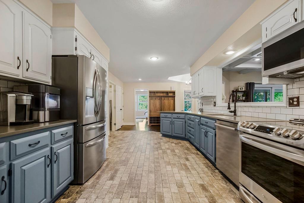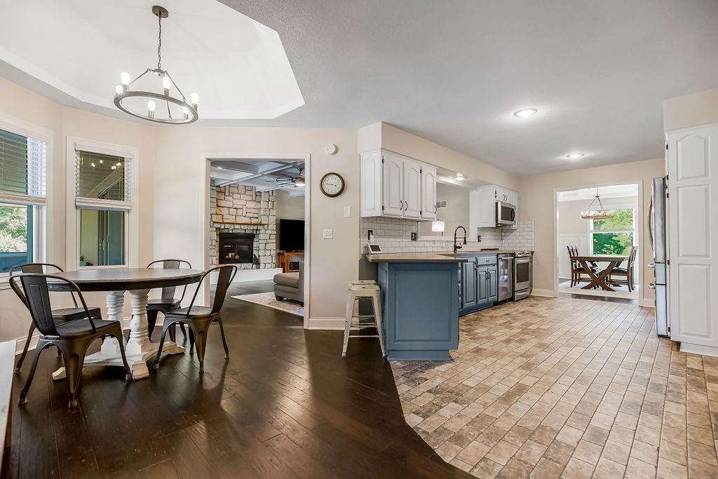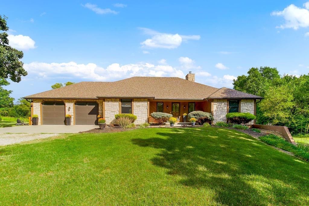 With over $50,000 in updates over the past several years and priced $15,000 UNDER a November 2025 appraisal value, this exquisitely renovated true ranch home set on 17.35 acres is a DREAM! Located within the Basehor-Linwood School District, this property is a nature lover's paradise, featuring abundant wildlife, two stocked ponds, scenic trails, and a creek with a bridge. The main level showcases a formal dining room, a spacious living room with beamed ceilings and a wood-burning fireplace, an updated kitchen with quartz countertops, new backsplash, updated flooring, new stainless-steel appliances, a pantry, and a cozy breakfast nook. Adjacent to the kitchen is the master suite with a walk-in closet, dual vanities, shower, and laundry room. For added privacy, there are two additional bedrooms and a full updated bath on the opposite side of the house. The lower level includes a family room, 4th bedroom, and half bath, with access to the garage/workshop, making it ideal for potential separate living quarters. The lower tandem garage workshop is equipped with AC and can accommodate 3 cars (additional 2-car garage on main level), with ample storage space available. The fenced backyard features a generously sized covered patio perfect for entertaining, relaxing in the hot tub, and enjoying the company of hummingbirds. With custom finishes throughout and recent updates that include a freshly painted interior, scraped ceilings, flooring, kitchen renovations, fixtures, and electrical/lighting, this home offers an absolutely tranquil setting just outside the city limits, where you can revel in the soothing sounds of nature.