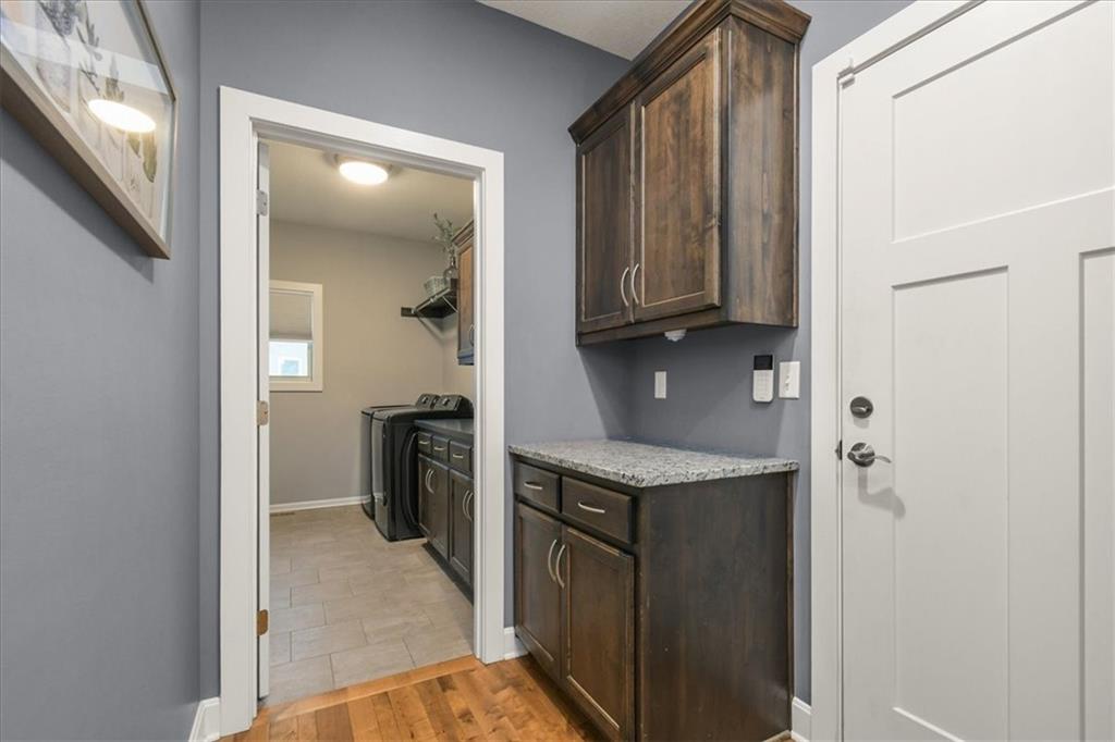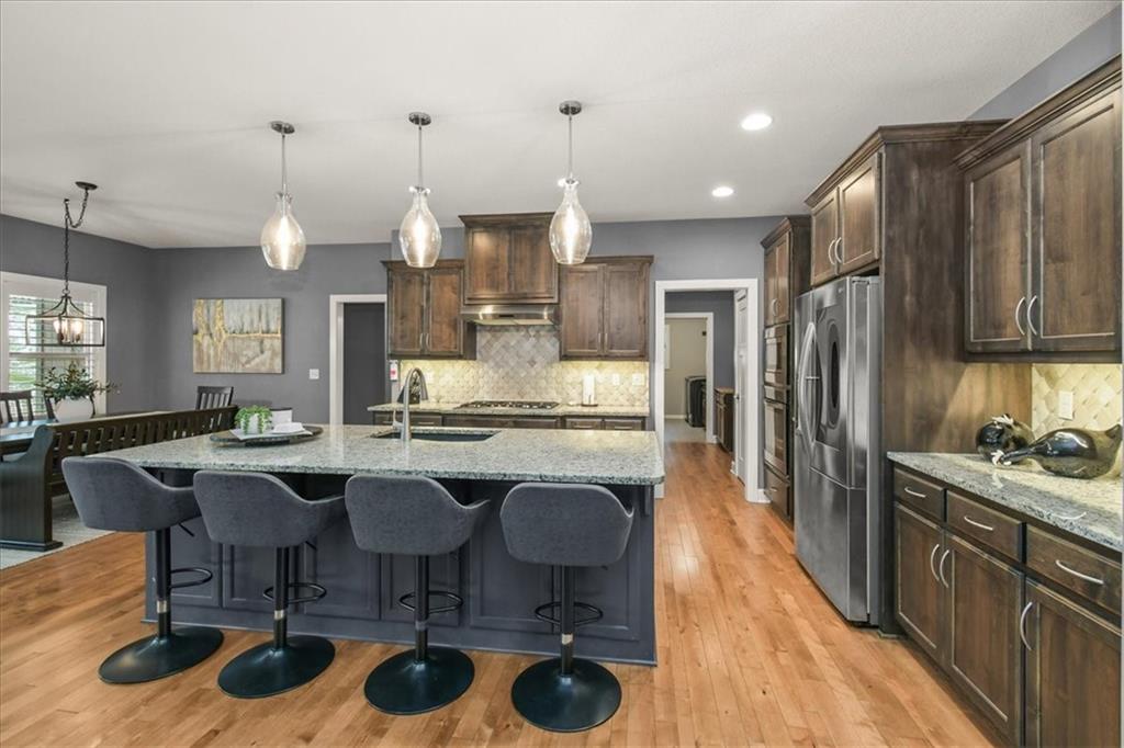 Prepare to be absolutely wowed by this ranch-style architectural masterpiece, a turnkey property where contemporary design meets luxurious, comfortable living. The home immediately impresses with its stunning façade of textured stucco and stacked stone accents, setting a sophisticated tone from the curb. Step inside onto gleaming hardwood floors that guide you through the expansive, open-concept design, flooded with natural light from oversized windows, most accented with custom plantation shutters. The heart of the home is the gourmet kitchen, a true chef's dream, showcasing rich, dark wood cabinetry equipped with soft close cabinets throughout, sleek granite countertops, and a show-stopping dark gray center island with seating—perfect for hosting and entertaining. Transition from the kitchen to the bright dining area and the spacious living room, anchored by a magnificent corner stone fireplace for cozy evenings. Retreat to the main floor private sanctuary in the primary suite, an oasis of calm with a stylish blue accent wall and an elegant tray ceiling that adds grandeur. The spa-like en-suite boasts a sleek double vanity with crisp white cabinetry, a glass-enclosed walk-in shower, and leads into a custom walk-in closet with ample built-in organization. Adding to the home's impressive functionality is a main-floor laundry room with gorgeous dark wood cabinetry, offering maximum convenience, complemented by a central vacuum system. For outdoor enjoyment, step onto the covered back patio, ideal for al-fresco dining or relaxing with a ceiling fan overhead. Below, the vast, unfinished basement presents a phenomenal opportunity to customize and expand—a blank canvas for adding a future home gym, theater, or additional living space to create your ultimate dream home. This is more than a home; it's an uncompromising quality lifestyle awaiting its new owner in a coveted community with excellent highway access for a convenient commute.