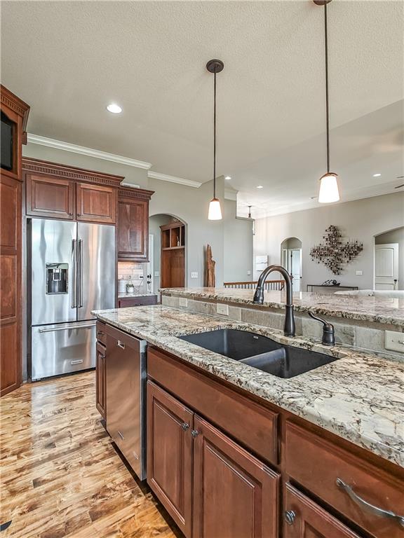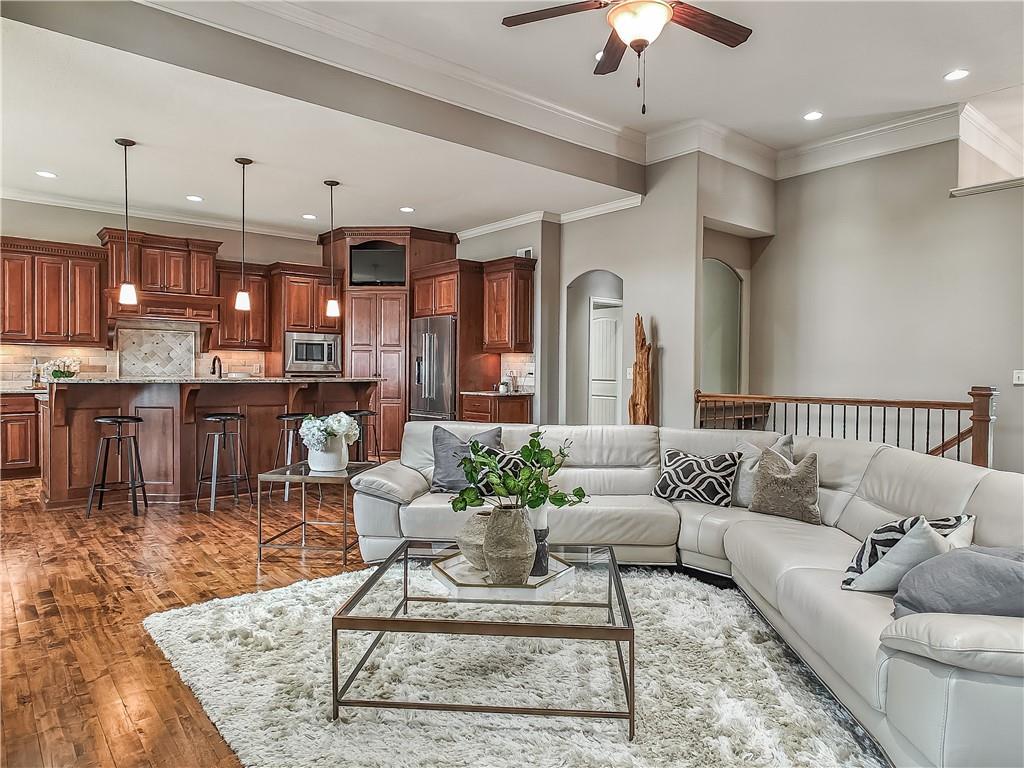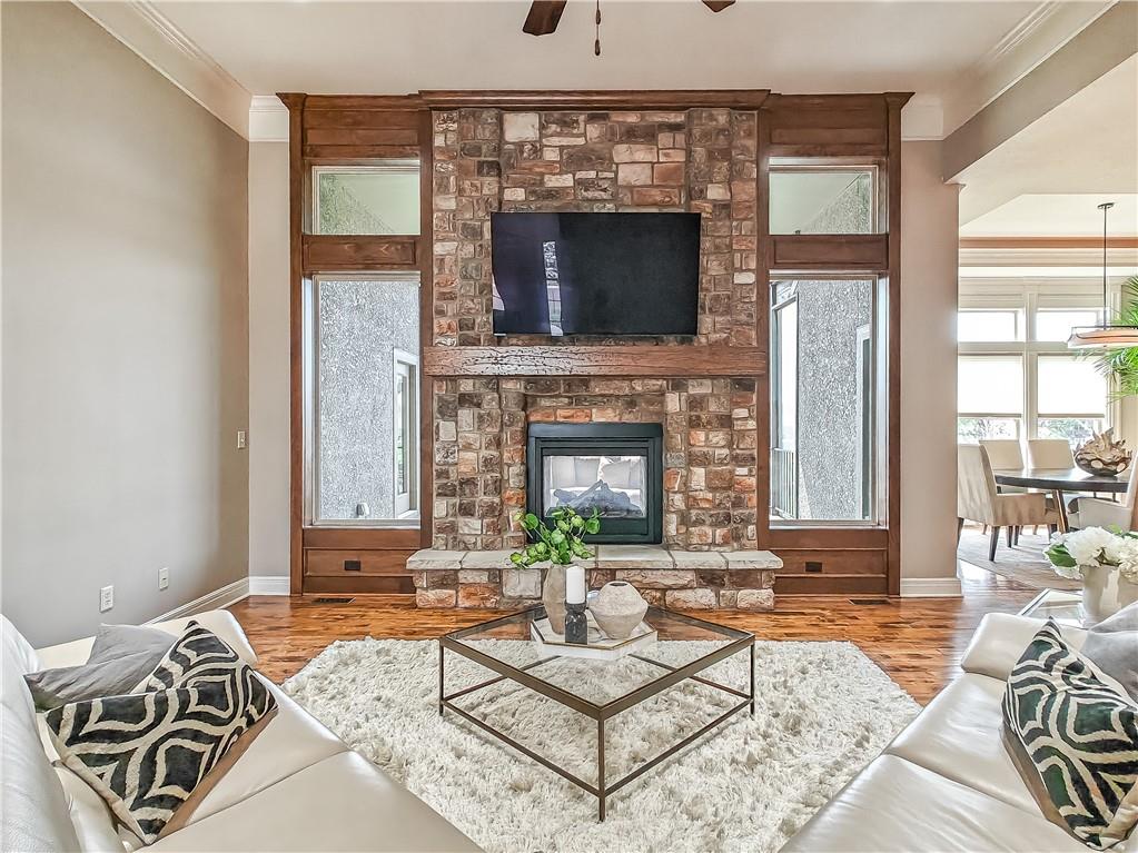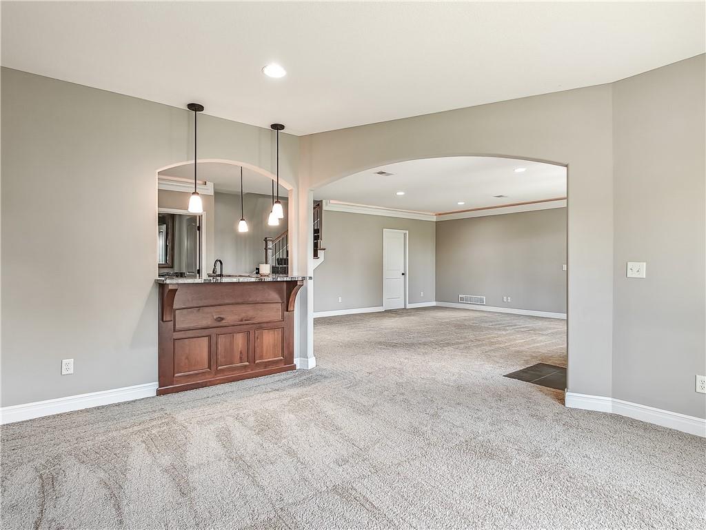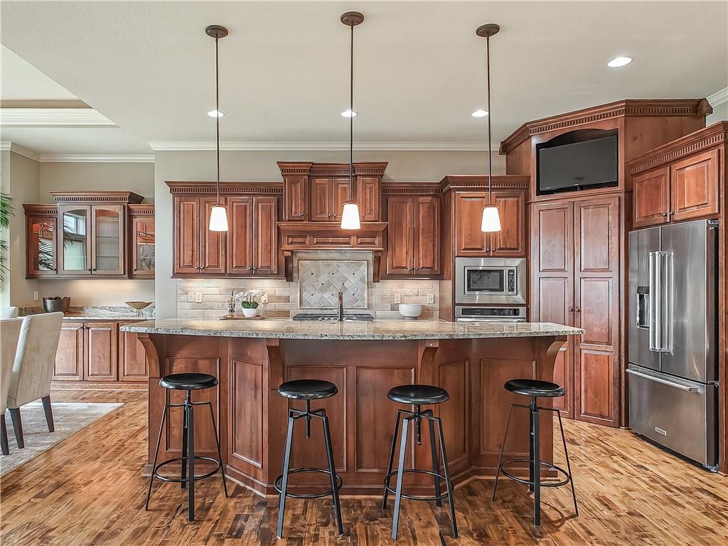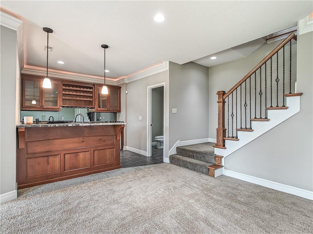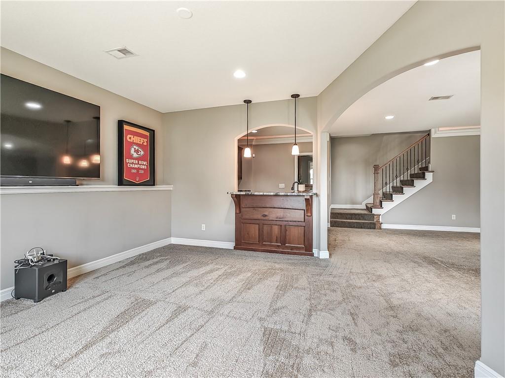 Sensational walk-out reverse 1.5-story in sought-after Polo Fields, offering the perfect blend of open living, thoughtful design, and exceptional functionality. The expansive great room welcomes you with rich hardwood floors and a striking see-through direct vent fireplace, creating a warm connection between the living and entertaining spaces. The open layout flows seamlessly into the kitchen and dining area—ideal for both everyday living and hosting. The kitchen is a true centerpiece, featuring a large island, granite countertops, stainless steel appliances, and a spacious walk-in pantry. A conveniently located laundry room with utility sink sits just off the kitchen for added ease. This meticulously maintained home shines with a massive finished walk-out lower level designed for entertaining and versatility. Enjoy two separate rec spaces, a stylish wet bar with granite countertops, and a convenient half bath. Two additional bedrooms with a full bath provide the perfect setup for guests, family, or flexible living needs, plus abundant storage throughout. Step outside to relax or entertain on the private screened-in covered deck, or take in the outdoors from the lower-level patio—both offering peaceful, usable outdoor living spaces. Additional highlights include: • All stucco exterior for timeless curb appeal • Walk-out lower level • Instant hot water system • Storm shelter for peace of mind • Sprinkler system • Oversized 3-car garage with heaters and high-intensity lighting—perfect for hobbies, projects, or extra storage This home truly delivers space, comfort, and quality in one of the area’s most desirable communities.