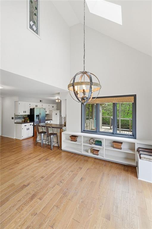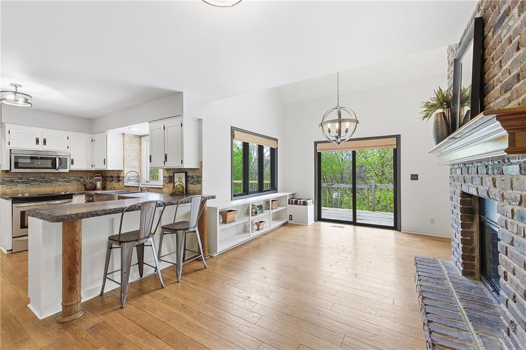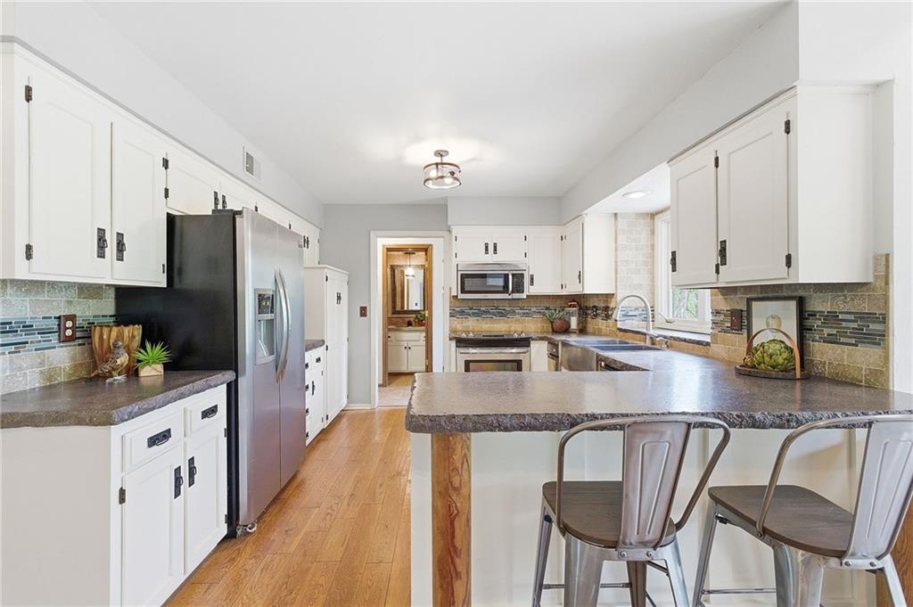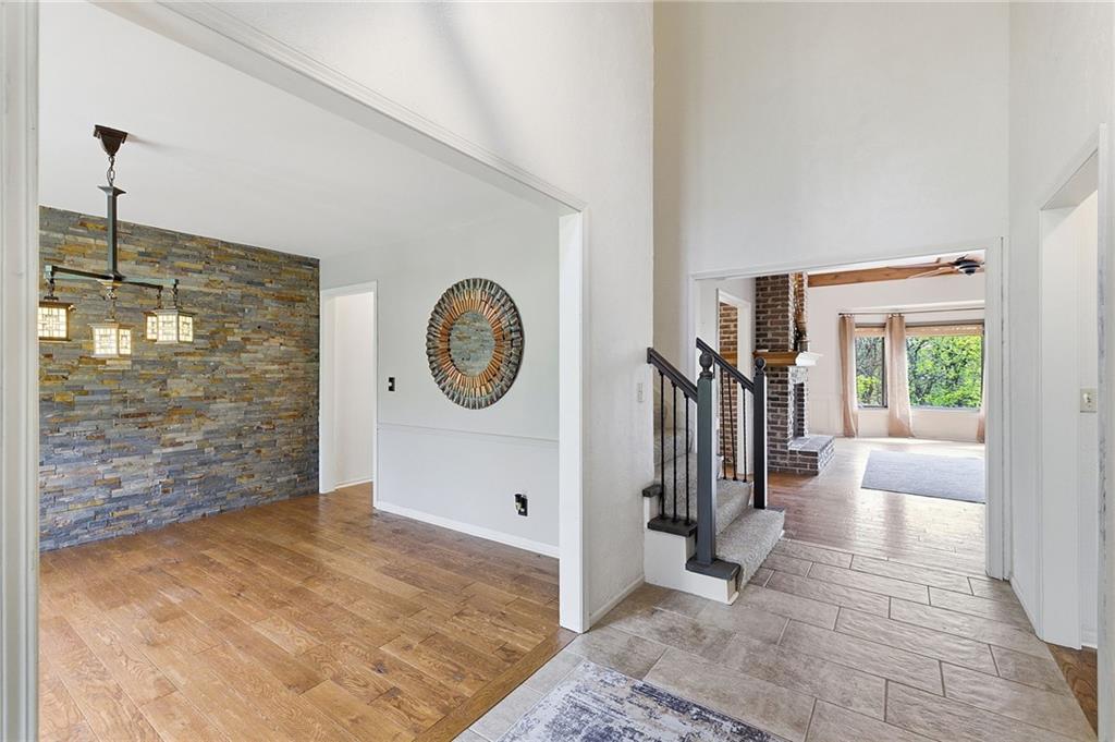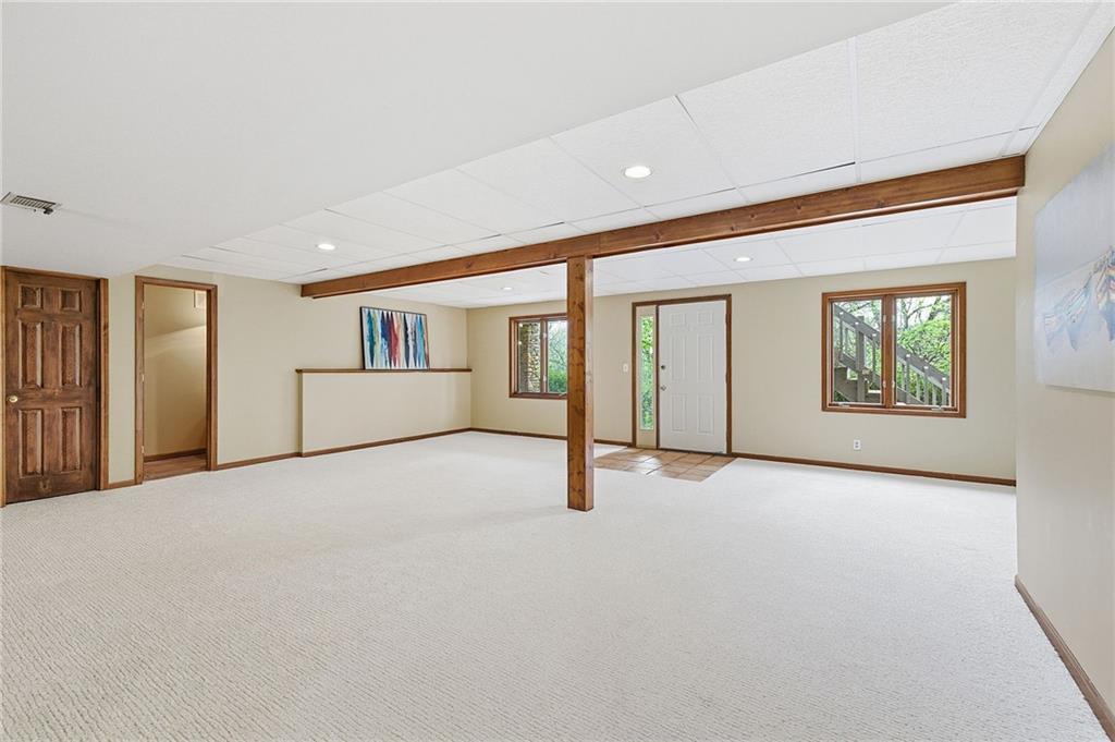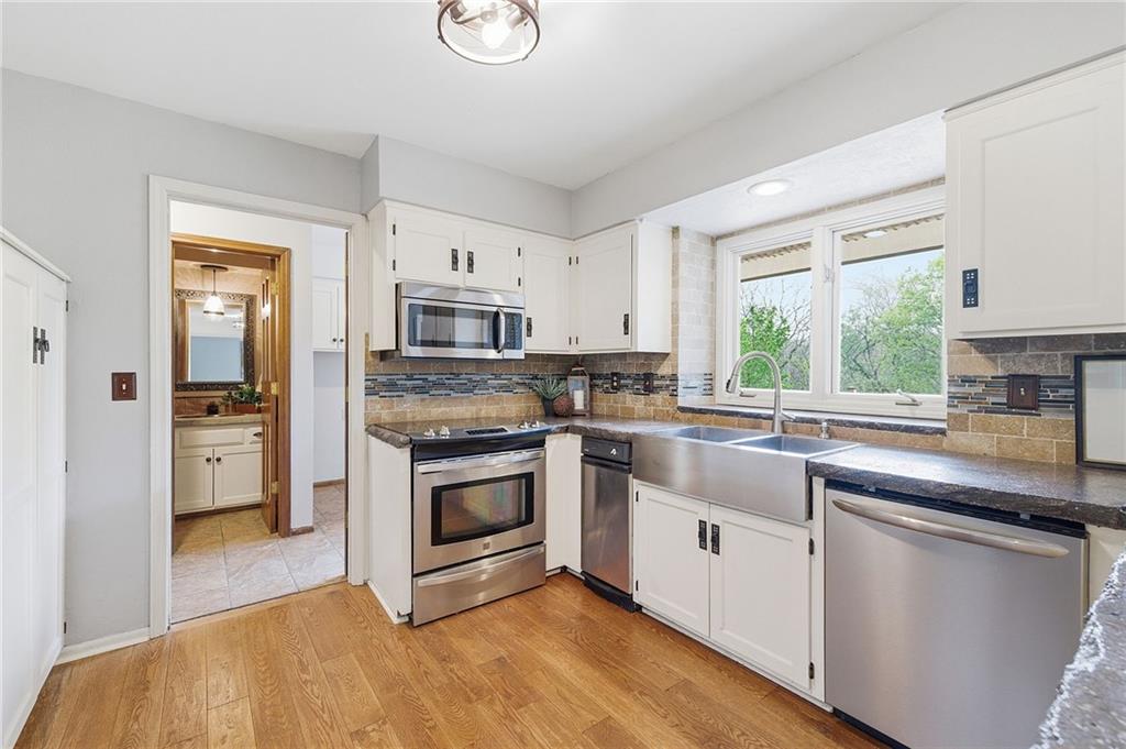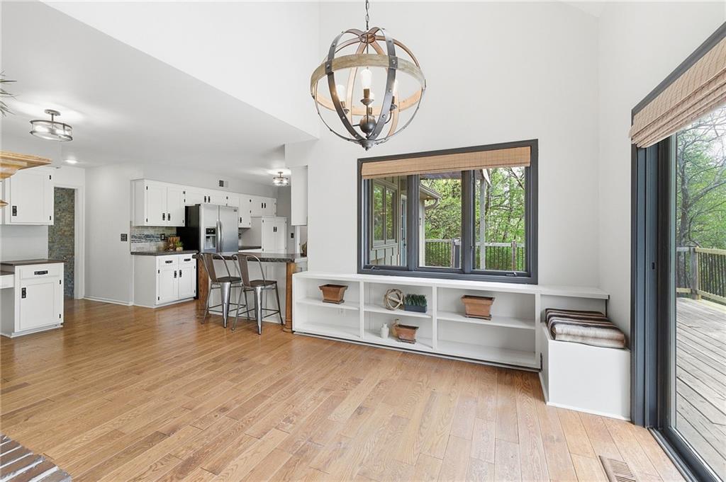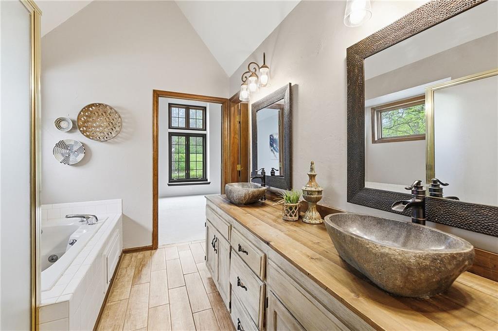 Nestled on a sprawling 1.24 acre wooded lot this stunning 1.5-story home offers the perfect blend of natural serenity, wildlife and sophisticated living. The main level is a host’s dream, featuring a formal dining room, a sunny breakfast area for casual mornings, a cozy hearth room, and large great room all flow together to create the perfect environment for entertaining. Imagine cozy evenings anchored by the fireplace or mornings on your private deck overlooking a peaceful creek and mature trees. The home features a spacious main floor primary suite, while the second level is thoughtfully designed with three large bedrooms, including one complete with its own private bath and walk-in closets. To maximize productivity and versatility, the upper level also includes a dedicated office space, offering an ideal setup for working from home or a quiet study library.The living space extends into a massive walk-out finished basement, providing the perfect footprint for a media room or recreation hub. Beyond the main home, the property is a dream for the hobbyist, featuring a large pole barn perfect for a workshop or additional storage. Located in the award-winning Blue Valley School District, this is a rare opportunity to own a private acreage retreat that perfectly balances grand entertaining with a peaceful, wooded escape. Welcome Home! Taxes and SqFt per county record. Room sizes approx. No preferences or limitations or discrimination because of any of the protected classes under Fair Housing.