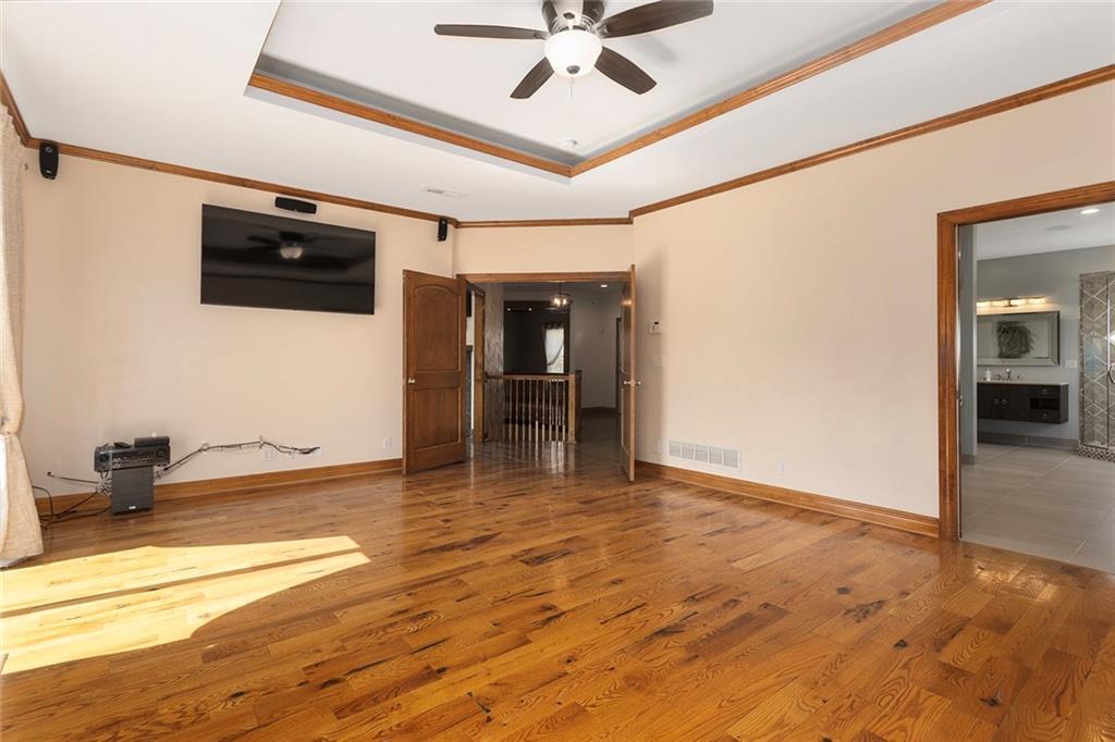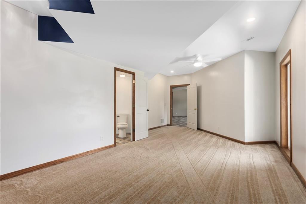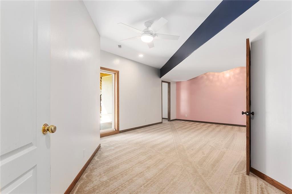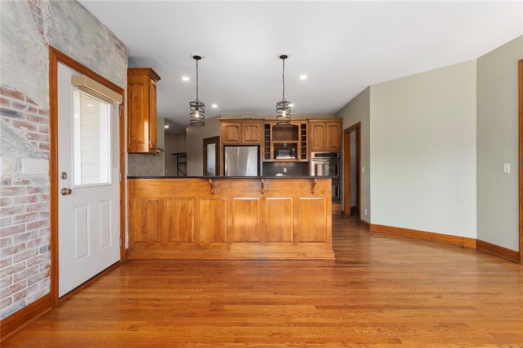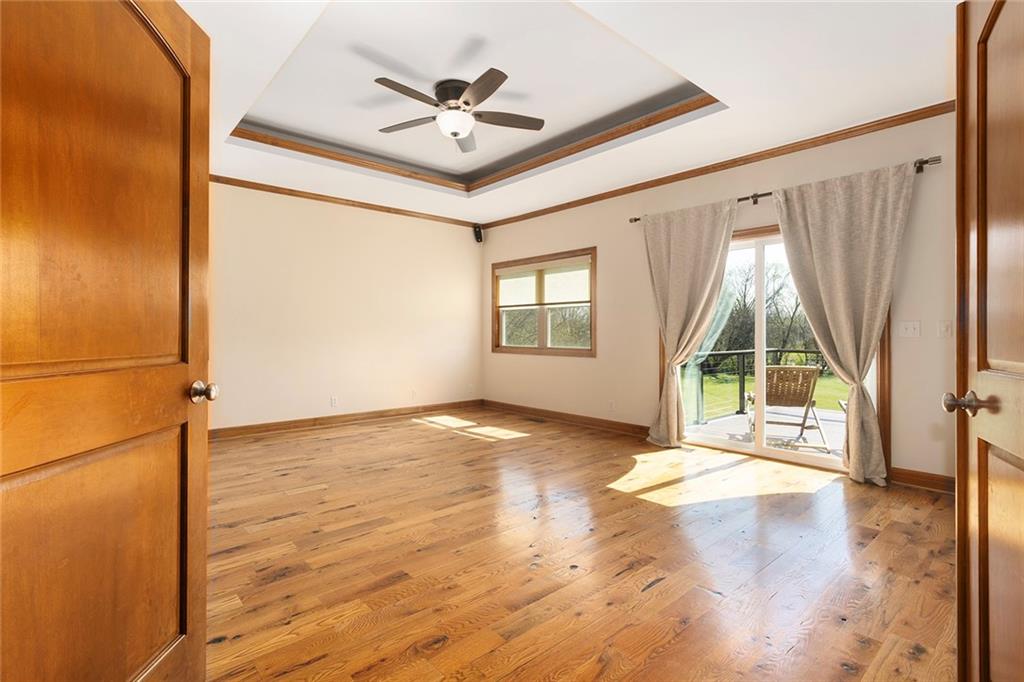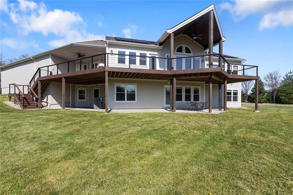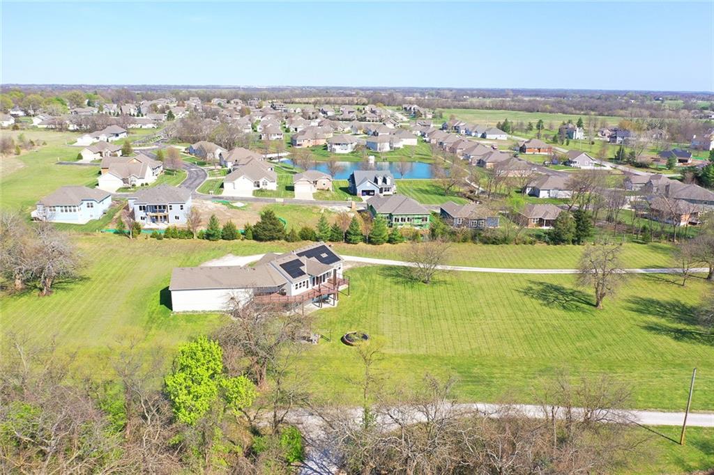 RARE 4-ACRE RETREAT JUST MINUTES FROM KANSAS CITY! Discover the perfect balance of privacy, space, and convenience with this exceptional reverse 1.5-story home tucked away in a picturesque, tree-lined setting. Offering nearly 4 acres of serene landscape, this property delivers a true country-living experience without sacrificing access to top-rated schools, shopping, and city amenities. Designed for both comfort and functionality, this home showcases vaulted ceilings, expansive living spaces, and an abundance of natural light. The main level provides effortless living, while the walkout lower level expands your options with a private 4th bedroom featuring its own exterior entrance—ideal for guests, multi-generational living, or a private office suite. Outdoor living shines with a wraparound deck, perfect for entertaining or simply enjoying the peaceful surroundings under a canopy of mature trees. Car collectors, hobbyists, or those needing extra space will love the oversized 3-car garage with extended bays and doors, plus a rare 4th garage on the lower level—offering unmatched flexibility. Thoughtfully updated throughout, with major improvements in the past 2–3 years including new hardwood floors, custom plank tile, updated lighting and fans, exterior stone accents, upgraded stair finishes, deck enhancements, and a fully finished lower level. Additional updates in progress add even more value. Don't forget the advantage of low energy bills due to the energy efficient living with Solar Panels. **Please note Solar Panels are paid for and there is no financial burden transferred to the buyer, just the savings. Opportunities like this—with acreage, upgrades, and location—are few and far between. This is the one buyers have been waiting for.