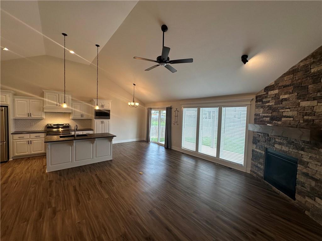 This home has just had a HUGE PRICE REDUCTION and is of amazing value! Welcome to this stunning ranch/reverse 1.5-story home, where thoughtful design and modern finishes come together seamlessly. The open-concept living room, kitchen, and breakfast area make a striking first impression with soaring cathedral ceilings, luxury vinyl plank flooring, and expansive windows that bathe the space in natural light. The kitchen is both stylish and functional, featuring upgraded granite countertops, a beautiful tile backsplash, painted cabinetry, and stainless steel appliances. Just off the kitchen, the breakfast area opens to a covered patio through sliding glass doors. The living room provides the perfect spot to relax, with a gorgeous fireplace. The primary suite is complete with vaulted ceilings, box bay windows overlooking the backyard, and lush carpet floors. The en suite bath offers a double vanity, a beautifully tiled walk-in shower with a built-in niche and granite bench, and a walk-in closet. Two additional bedrooms with generous closet space, a second full bathroom, and conveniently located laundry complete the main level. The builder-finished basement extends the living space with a fourth bedroom featuring a large egress window, a third full bathroom, and an expansive family room and recreation area—ideal for entertaining or relaxing. Situated on a generous corner lot, the home also features a large patio with both covered and uncovered areas, perfect for hosting BBQs or enjoying time outdoors. Notable upgrades include an irrigation system, buried downspouts, enhanced landscaping, a vertical garage door opener, and an expanded patio.