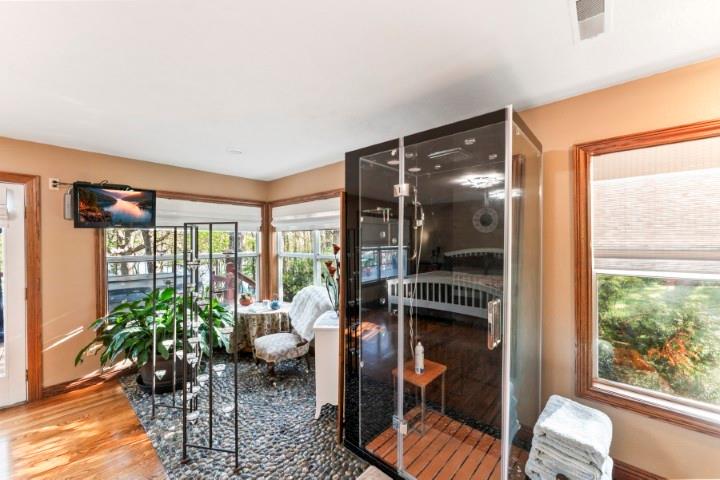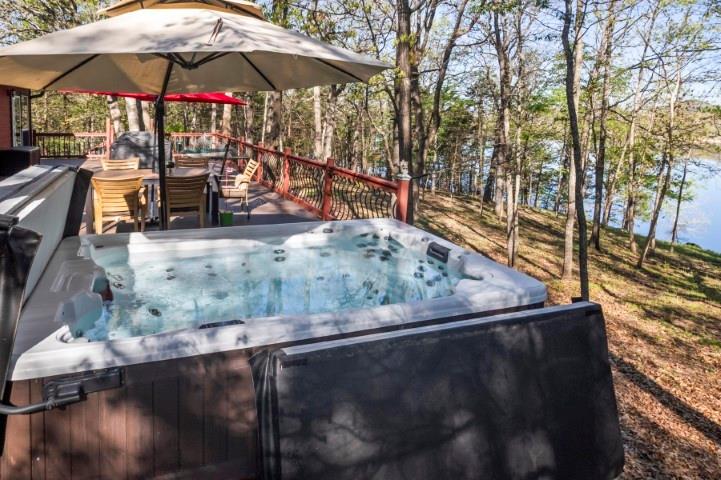 Boat slip and PWC deck INCLUDED. Beautiful lakefront home in the heart of the Ozarks with incredible main channel views and a peaceful, private setting. This 1,540 sq ft home features a spacious lakeside 1000sq. ft. deck with hot tub, plus a 10'x26' boat slip with 6000lb. lift just a short 2-minute walk away. Inside, you'll find cherry cabinets, granite countertops, wood floors, custom finishes, and a cozy wood-burning fireplace. The large master suite offers deck access, a walk-in closet, and a newer rain/steam shower. Enjoy wooded privacy, fire pits, wildlife, and a quiet neighborhood with a convenient boat launch nearby. The property includes four lots with over 400 feet of lake frontage, plus an additional buildable lakefront lot and two lots across the road--one with a 30'x40' insulated shop/garage featuring two overhead doors, two walk-in doors, four windows, and is wired for 110 and 220 volts, with an additional 30-amp 110-volt RV outlet outside. Well-maintained home, with recent septic service and a current Corp vegetation permit.