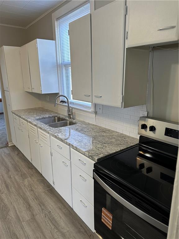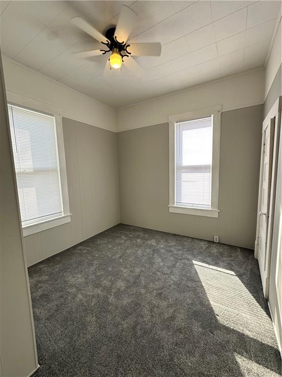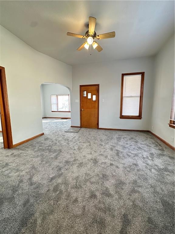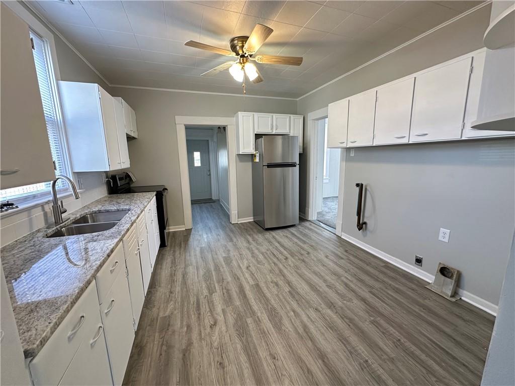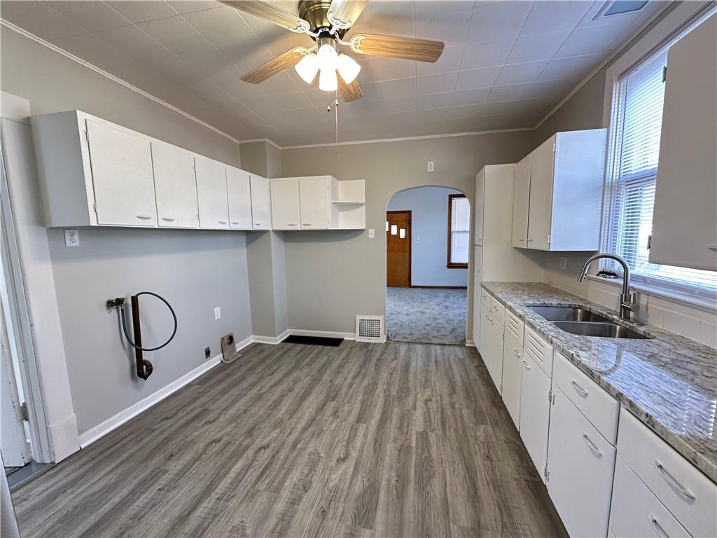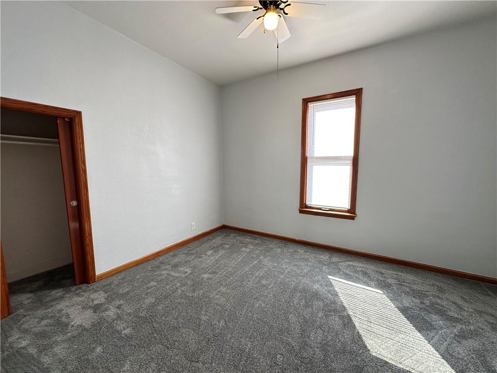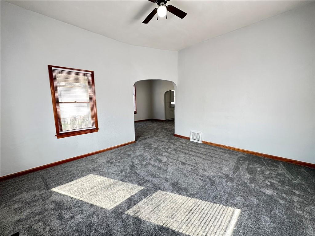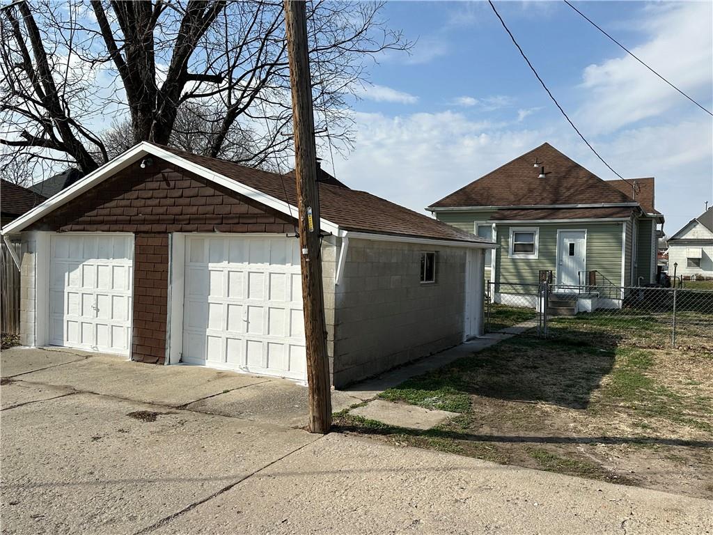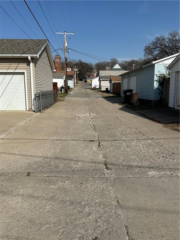 Move-in ready home featuring a fantastic covered front porch with beautiful views of the Carnegie Library grounds—perfect for relaxing on mild evenings and warm summer days. This charming home offers two bedrooms sharing one bathroom, with fresh paint and updated flooring. The large, open kitchen boasts solid surface countertops and new stainless steel appliances that stay with the home. Full unfinished basement with easy access and tons storage space. Newer 220 amp panel box. Paved alley access leads to a detached 2-car garage, providing plenty of off-street parking. Level, fenced backyard and maintenance free vinyl siding.