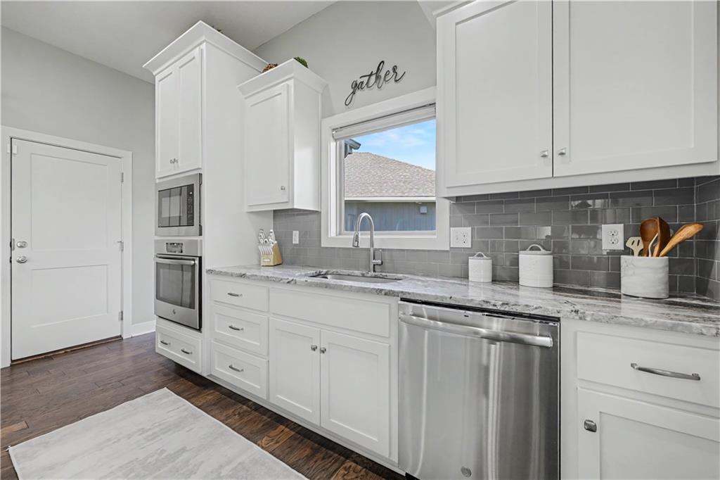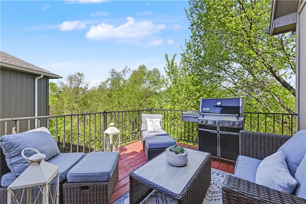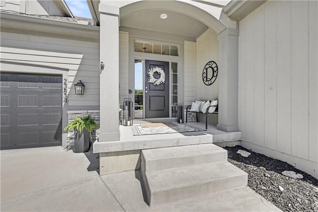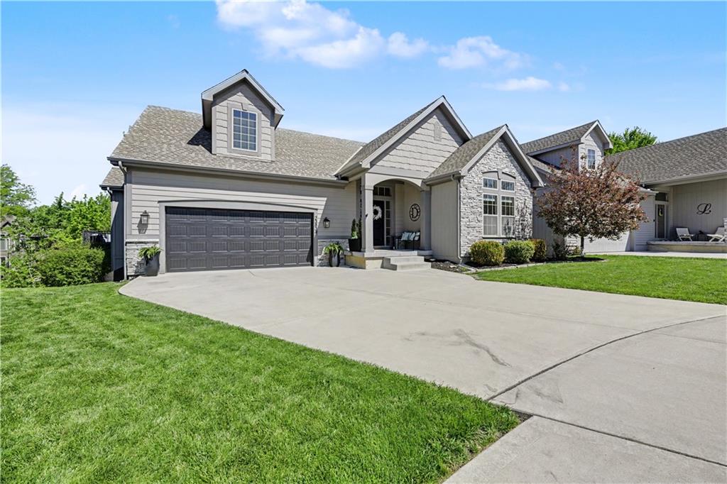 GORGEOUS reverse 1.5 story home on an amazing Cul De Sac in the heavily sought after Arbor Woods in Olathe with wonderful curb appeal! Beautiful gourmet kitchen with huge eat in granite island, with walk in pantry, hardwood floors, and stainless steel appliances. Lovely deck off conveniently located off kitchen - overlooking the beautiful treed view- great for grilling and entertaining! Spacious Master BR with ensuite with vaulted ceiling, carpet, shower, double vanities with granite tops, walk through closet, laundry and another bedroom/office all on main floor. Lower level has HUGE family room with wet bar, with third large bedroom with full bath, and large storage.