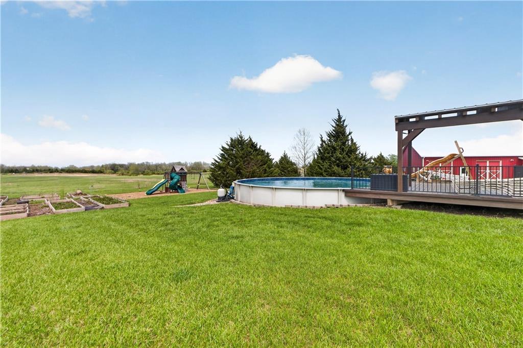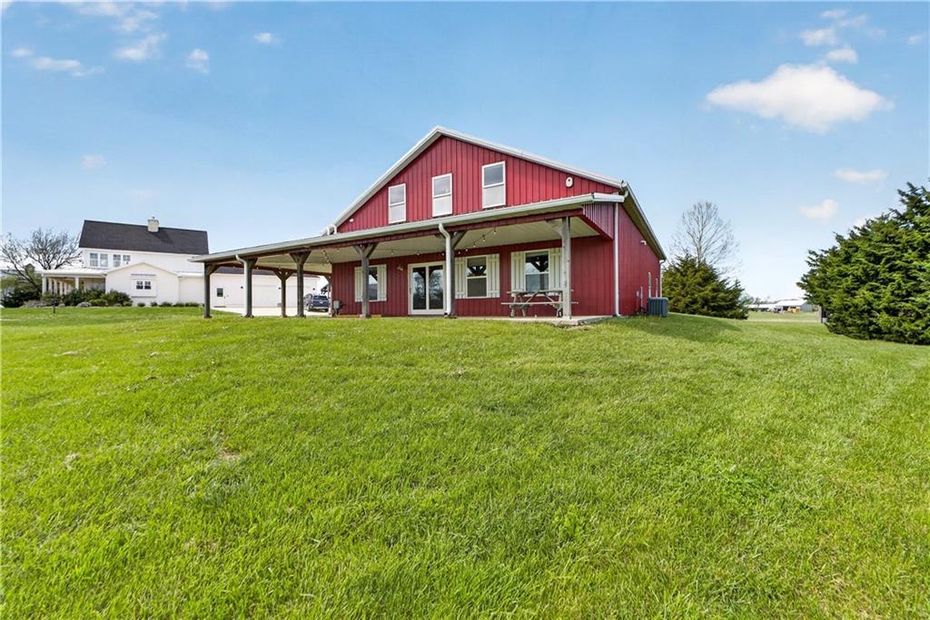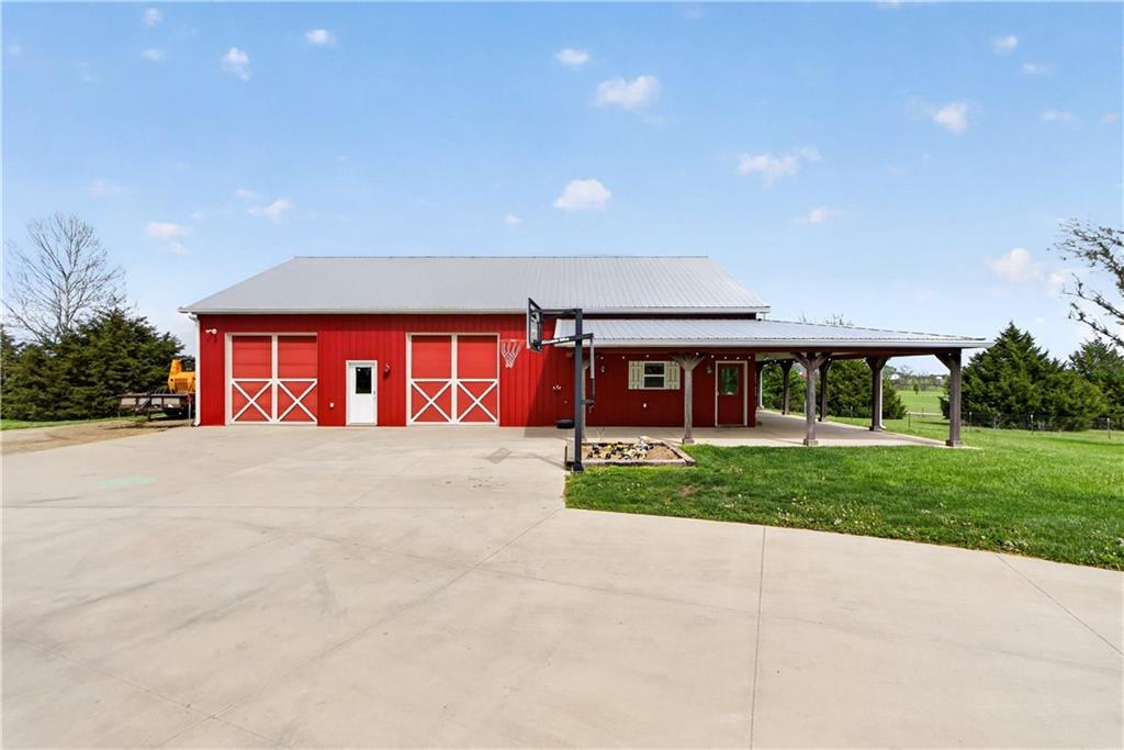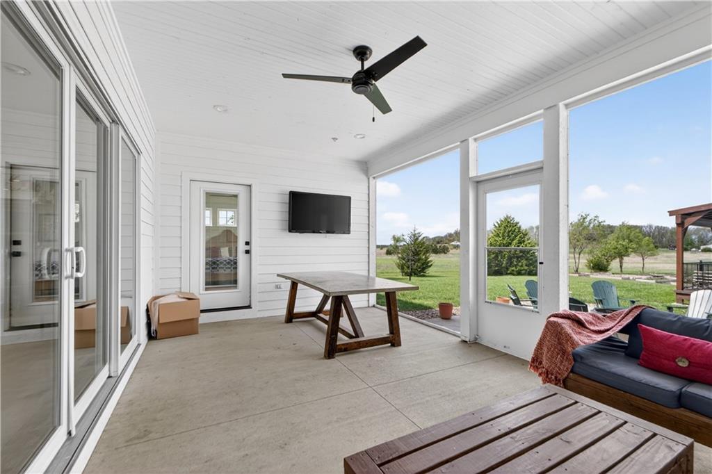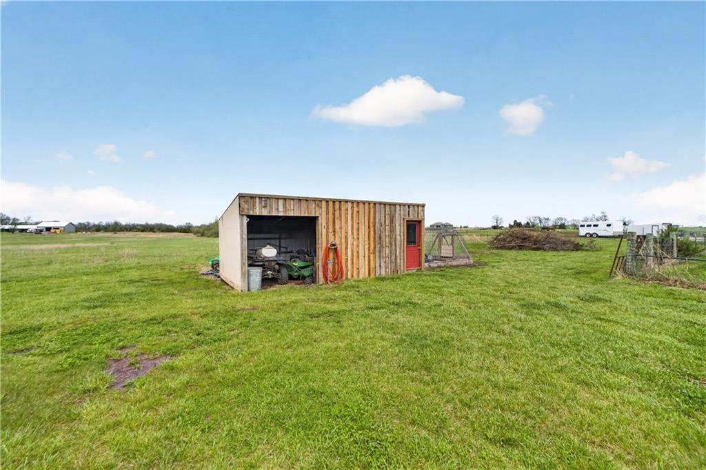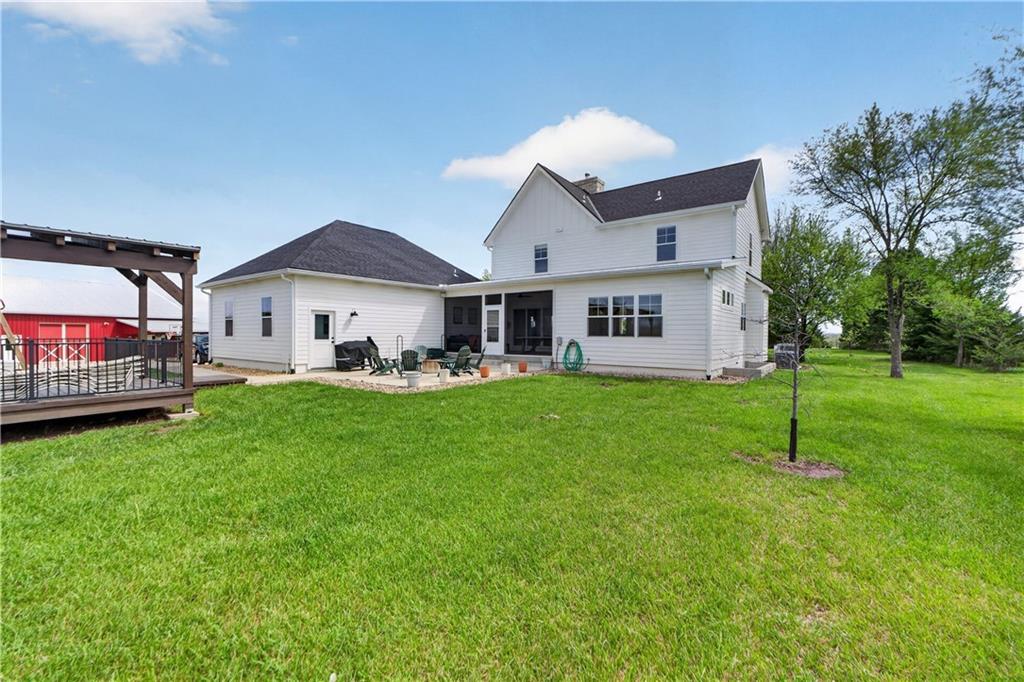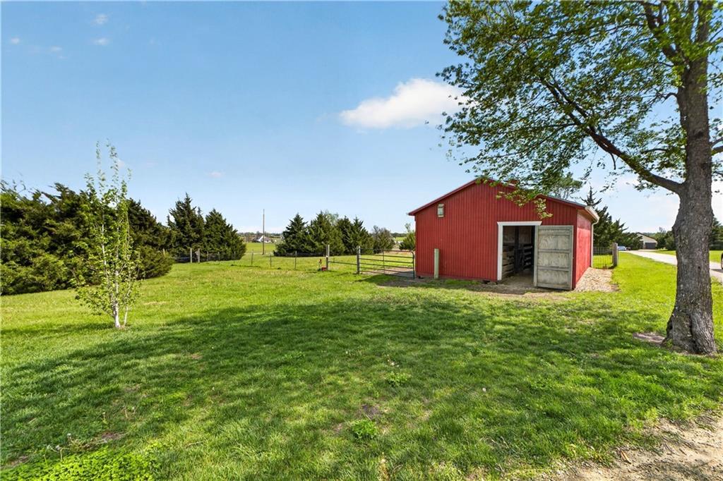 10 acres on blacktop — a rare blend of modern comfort and full-function hobby farm living. Built in 2020 as the sought-after builder’s personal residence, this open-concept home offers 6 bedrooms, 3.5 baths and 4,032 total sqft with thoughtful finishes throughout. Main living features include a dramatic two-story great room with abundant windows, wide-plank white oak engineered floors, a see-through fireplace between the dining room and living room, and a chef-ready kitchen flowing to living and entertaining spaces. The primary suite is conveniently located on the main level and opens to a large screened porch that, together with the dining room, leads out to an expansive concrete patio — ideal for indoor-outdoor living. Two oversized bedrooms upstairs include vanities/sinks plus a full upstairs bath; three additional bedrooms are located below grade. Practical comforts: main-level and basement laundry, an oversized two-car garage, and a large finished six-sided concrete storm shelter. Outdoor and outbuilding amenities are built for hobby farmers, equestrians, and weekend hosts. Approximately 2.5 acres are fenced and improved with a horse barn that has power and water. The back 5 acres serve as productive hay pasture. The 2,400 sqft barn/shop includes a 1,600 sqft insulated, heated & cooled shop space with two overhead doors and a full bath, plus an 800 sqft one-bedroom apartment with kitchen/living area, full bath, W/D hookups and a wraparound covered porch — perfect for rental income, guest quarters, or on-site help. Additional property highlights: chicken coop with power, water and indoor/outdoor access; raised-bed garden area with water run; a 33-ft above-ground pool with deck and awning for summer entertaining; and abundant acreage for riding, gardening, or expansion. Location is exceptional — just one mile from the new elementary school in the award-winning Basehor-Linwood School District.