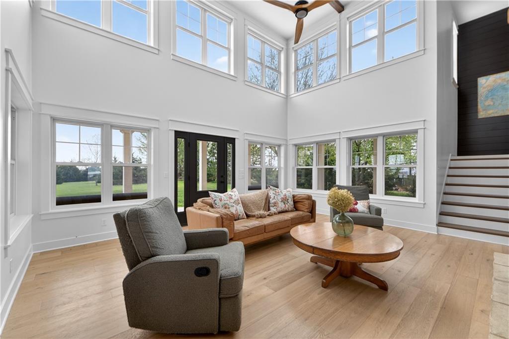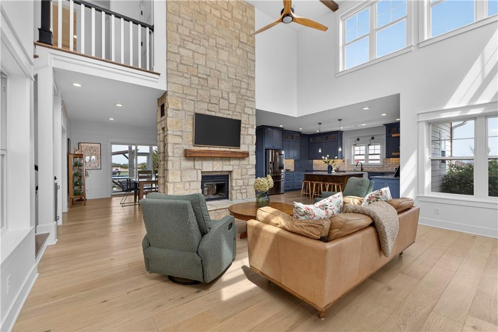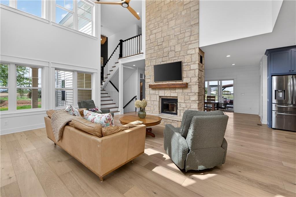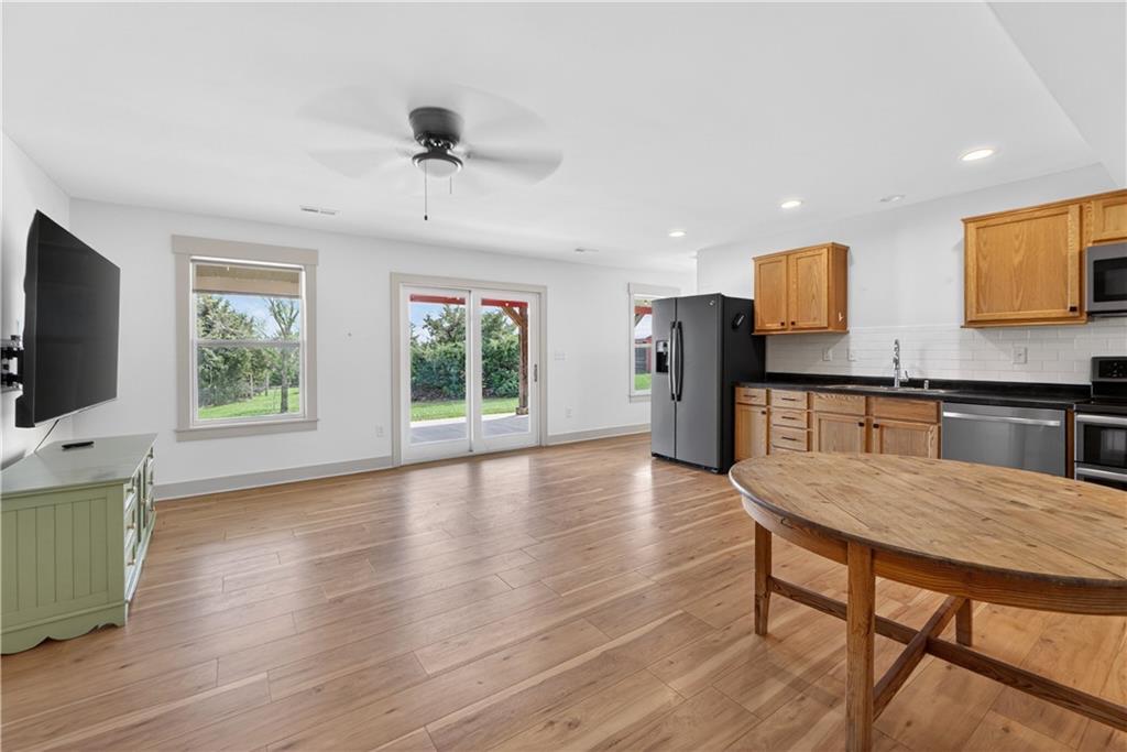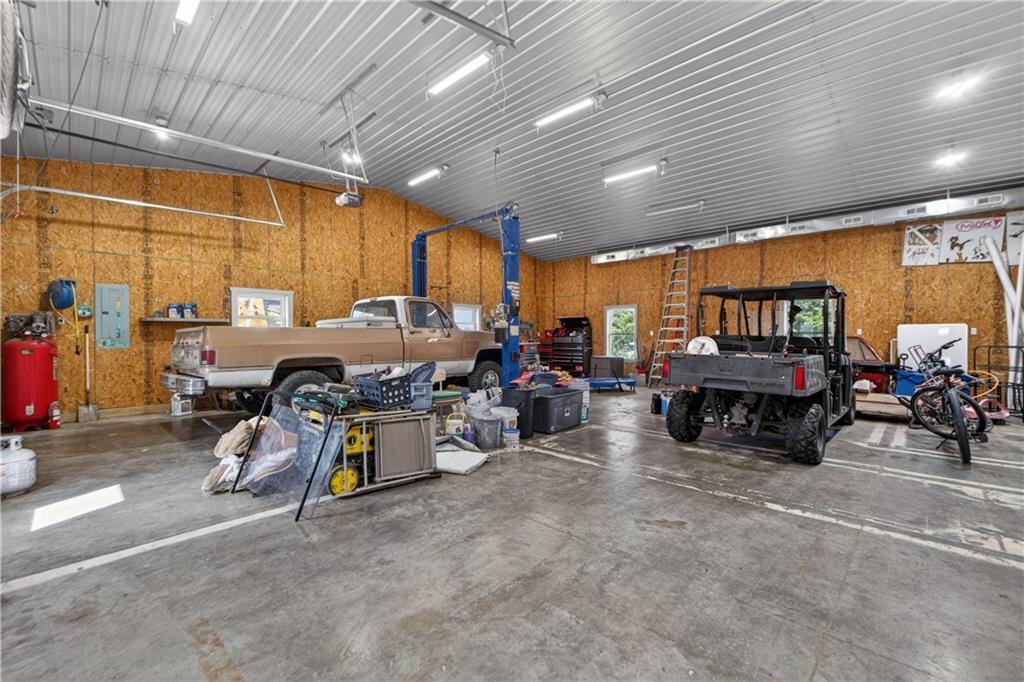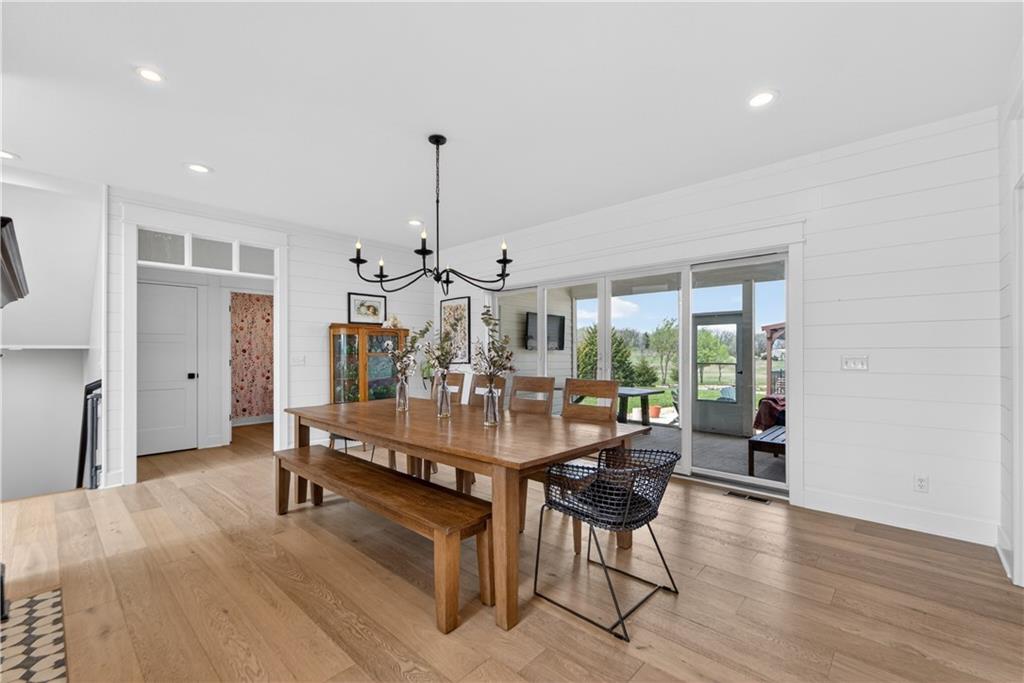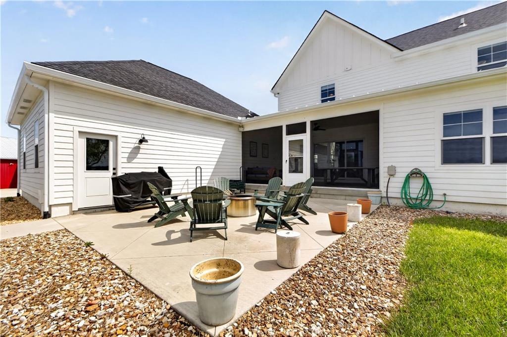 10 acres on blacktop — a rare blend of modern comfort and full-function hobby farm living. Built in 2020 as the sought-after builder’s personal residence, this open-concept home offers 6 bedrooms, 3.5 baths and 4,032 total sqft with thoughtful finishes throughout. Main living features include a dramatic two-story great room with abundant windows, wide-plank white oak engineered floors, a see-through fireplace between the dining room and living room, and a chef-ready kitchen flowing to living and entertaining spaces. The primary suite is conveniently located on the main level and opens to a large screened porch that, together with the dining room, leads out to an expansive concrete patio — ideal for indoor-outdoor living. Two oversized bedrooms upstairs include vanities/sinks plus a full upstairs bath; three additional bedrooms are located below grade. Practical comforts: main-level and basement laundry, an oversized two-car garage, and a large finished six-sided concrete storm shelter. Outdoor and outbuilding amenities are built for hobby farmers, equestrians, and weekend hosts. Approximately 2.5 acres are fenced and improved with a horse barn that has power and water. The back 5 acres serve as productive hay pasture. The 2,400 sqft barn/shop includes a 1,600 sqft insulated, heated & cooled shop space with two overhead doors and a full bath, plus an 800 sqft one-bedroom apartment with kitchen/living area, full bath, W/D hookups and a wraparound covered porch — perfect for rental income, guest quarters, or on-site help. Additional property highlights: chicken coop with power, water and indoor/outdoor access; raised-bed garden area with water run; a 33-ft above-ground pool with deck and awning for summer entertaining; and abundant acreage for riding, gardening, or expansion. Location is exceptional — just one mile from the new elementary school in the award-winning Basehor-Linwood School District.