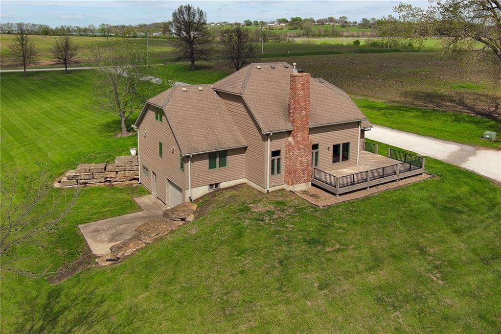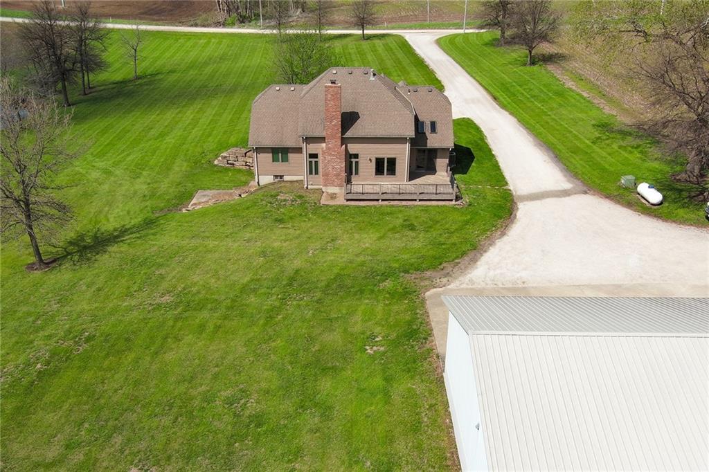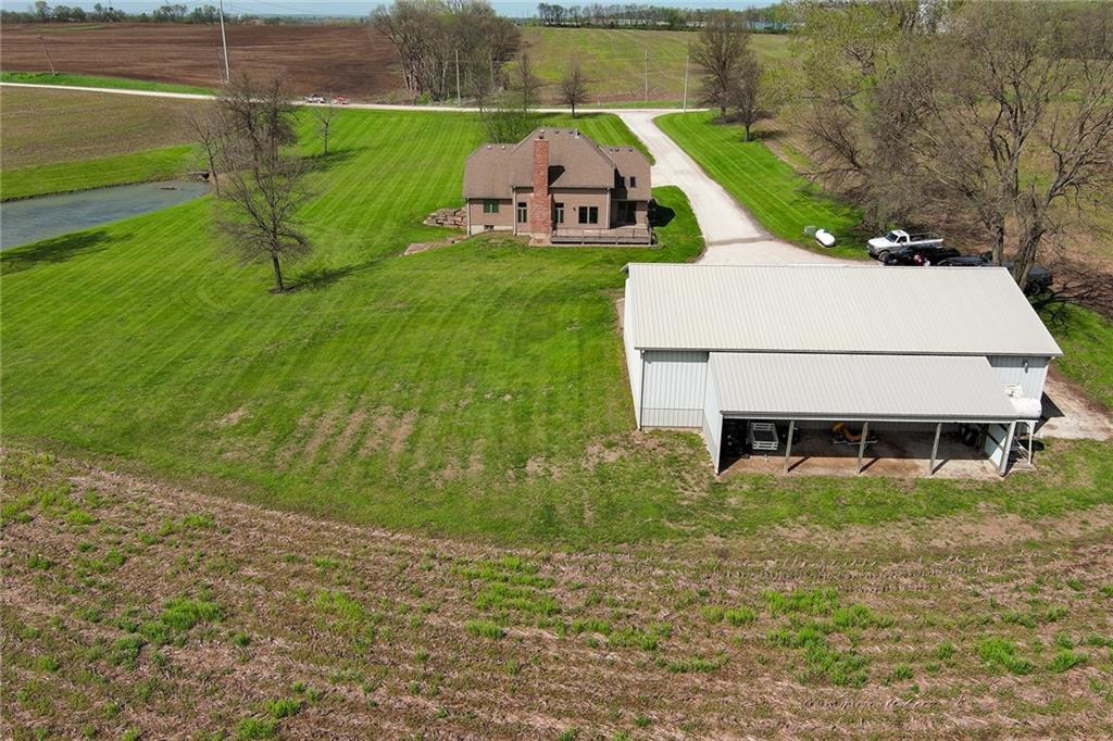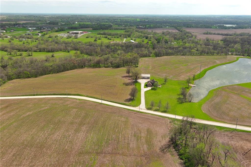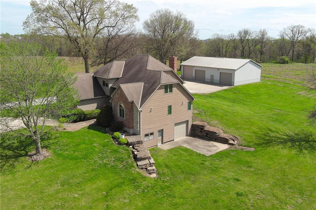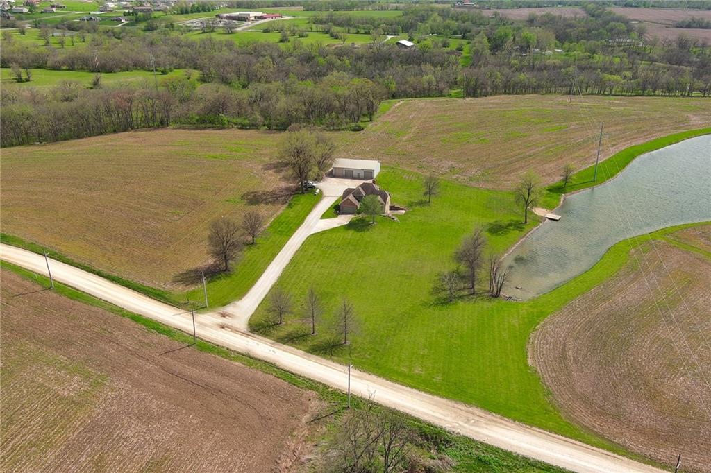 Escape to the peace of the countryside in this custom built home on 24 acres. A fully stocked pond with Bass, Crappies, Perch, Bluegill, and Catfish provides the perfect place to relax while watching the sun set. The entry opens to a large great room with heat circulating wood burning fireplace and 13' ceilings with beautiful crown moulding. There are two dining areas (one is currently being used as an office). The kitchen has many cabinets, pantry, island with cooktop, Granite countertops, tile backsplash, and wood floor. The primary suite is large and includes the following amenities - a double vanity, shower, whirlpool tub, linen closet, and walk-in closet. The two upstairs bedrooms are generous size with a shared bathroom. There is an office that could be converted into another bedroom/play area/craft room - the options are endless. There is a storage area above the garage off one of the bedrooms. The finished walk-out lower level has so much to offer with large family room, gym/exercise room (could be converted into a bedroom), full bath (with walk-in closet for guests), storage area (16.11x11.6), and 3rd car garage (14.3x11.2). The home was remodeled in 2008 with new vinyl siding, windows, roof, granite countertops, & refinished hardwood floors. The 60x40 outbuilding includes 100amp electrical service, insulated interior, concrete floor, water, radiant heat, pegboard/workbench, large overhead door for RV, & BONUS - 9,000 lb vehicle lift. There is a lean-to (40x12.6) on the back of the outbuilding. Located just a little under 10 minutes from I-70, this property offers the perfect balance of rural privacy and convenient access to town and Kansas City. Inspections welcome but selling "AS IS". The two gas tanks on the East side of the outbuilding are not staying.