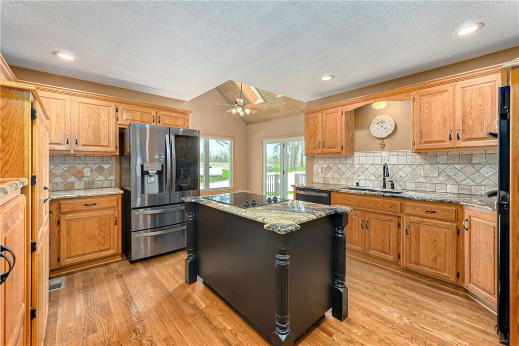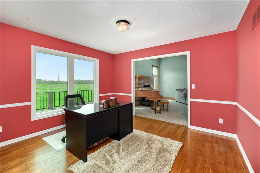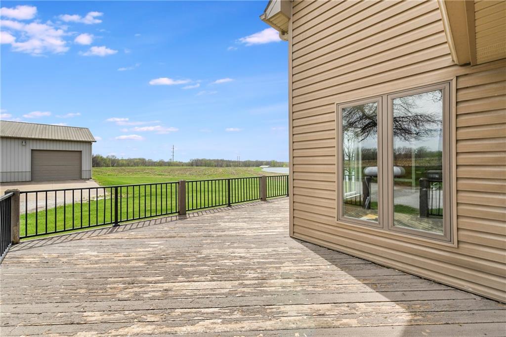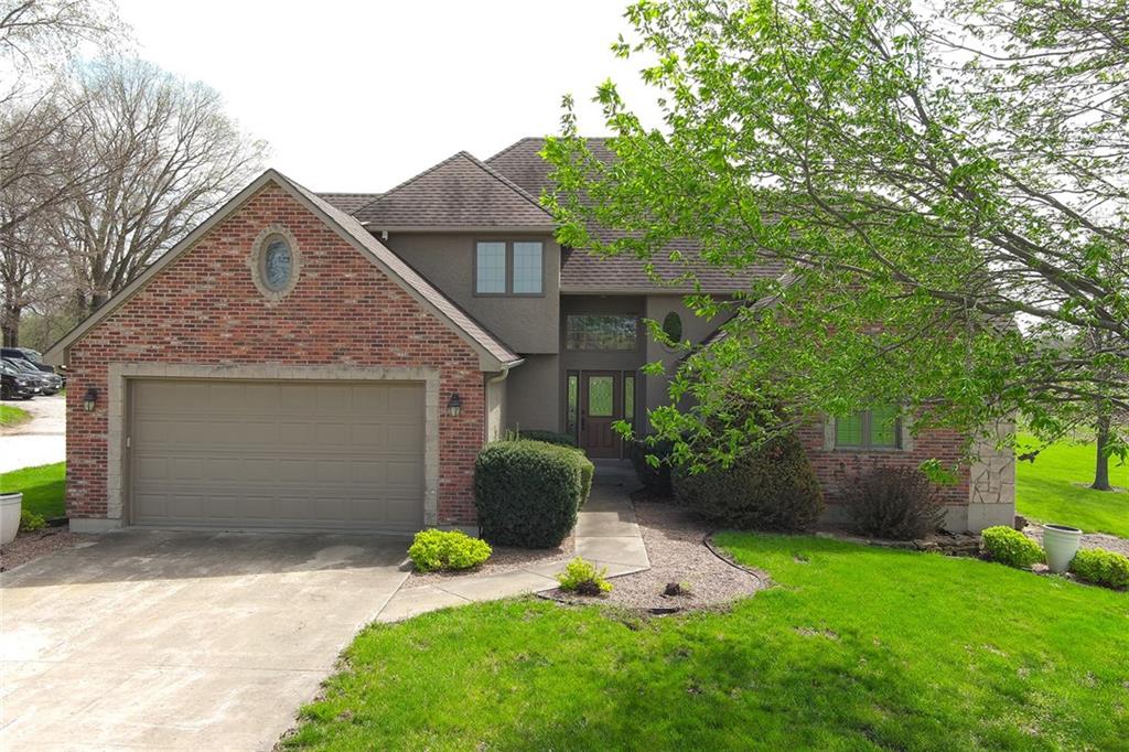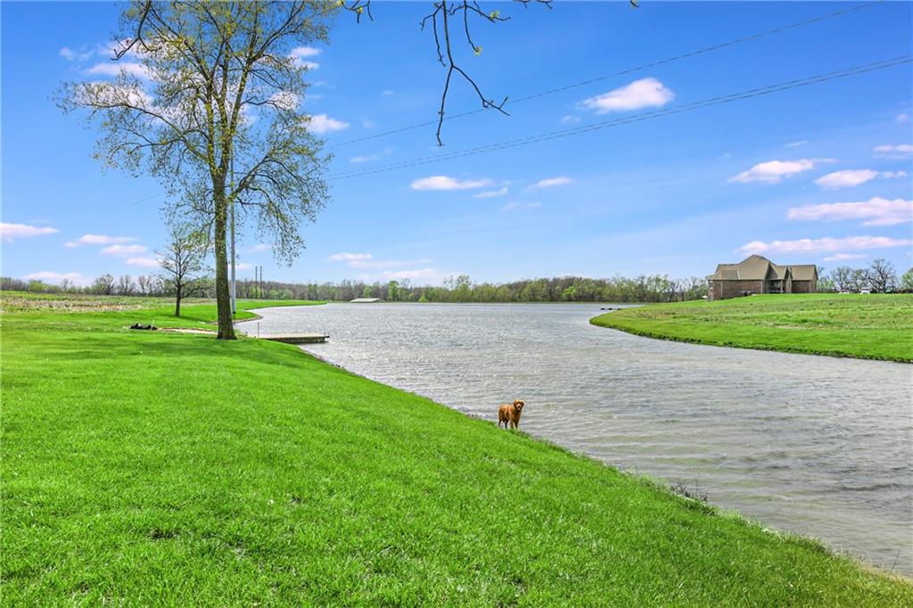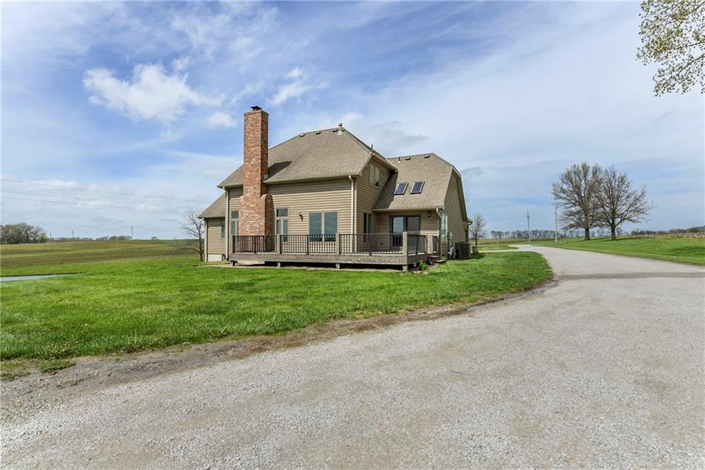 Escape to the peace of the countryside in this custom built home on 24 acres. A fully stocked pond with Bass, Crappies, Perch, Bluegill, and Catfish provides the perfect place to relax while watching the sun set. The entry opens to a large great room with heat circulating wood burning fireplace and 13' ceilings with beautiful crown moulding. There are two dining areas (one is currently being used as an office). The kitchen has many cabinets, pantry, island with cooktop, Granite countertops, tile backsplash, and wood floor. The primary suite is large and includes the following amenities - a double vanity, shower, whirlpool tub, linen closet, and walk-in closet. The two upstairs bedrooms are generous size with a shared bathroom. There is an office that could be converted into another bedroom/play area/craft room - the options are endless. There is a storage area above the garage off one of the bedrooms. The finished walk-out lower level has so much to offer with large family room, gym/exercise room (could be converted into a bedroom), full bath (with walk-in closet for guests), storage area (16.11x11.6), and 3rd car garage (14.3x11.2). The home was remodeled in 2008 with new vinyl siding, windows, roof, granite countertops, & refinished hardwood floors. The 60x40 outbuilding includes 100amp electrical service, insulated interior, concrete floor, water, radiant heat, pegboard/workbench, large overhead door for RV, & BONUS - 9,000 lb vehicle lift. There is a lean-to (40x12.6) on the back of the outbuilding. Located just a little under 10 minutes from I-70, this property offers the perfect balance of rural privacy and convenient access to town and Kansas City. Inspections welcome but selling "AS IS". The two gas tanks on the East side of the outbuilding are not staying.