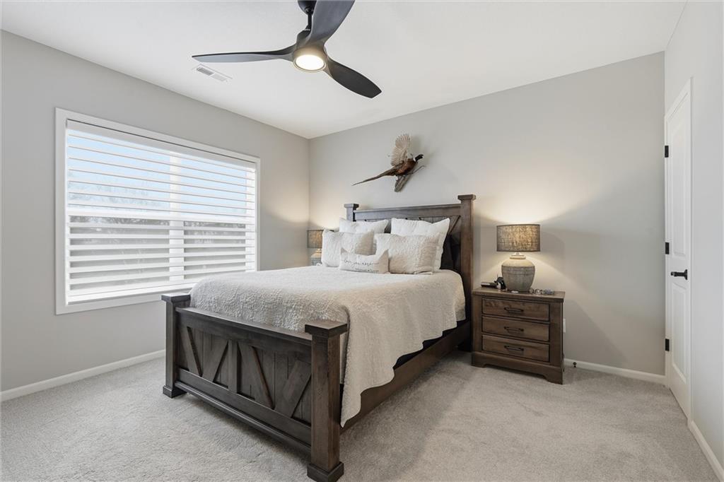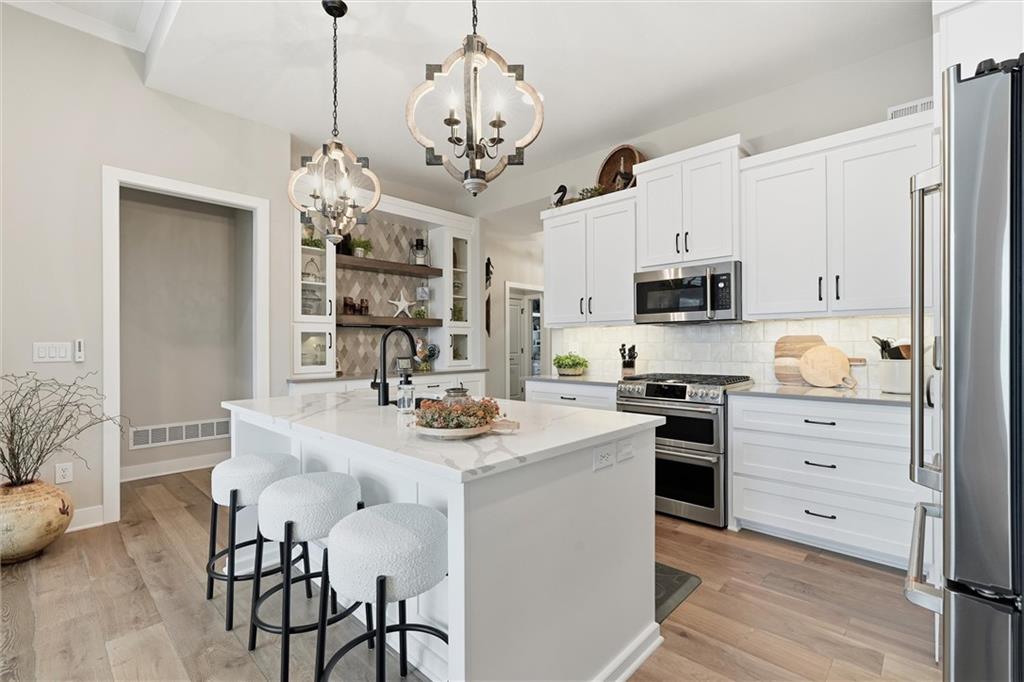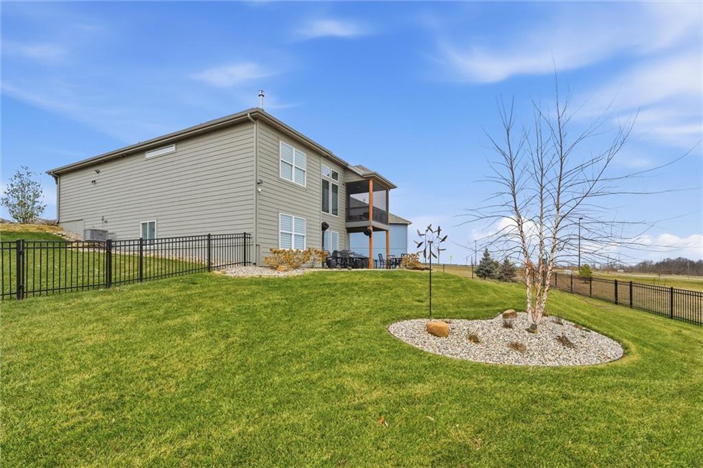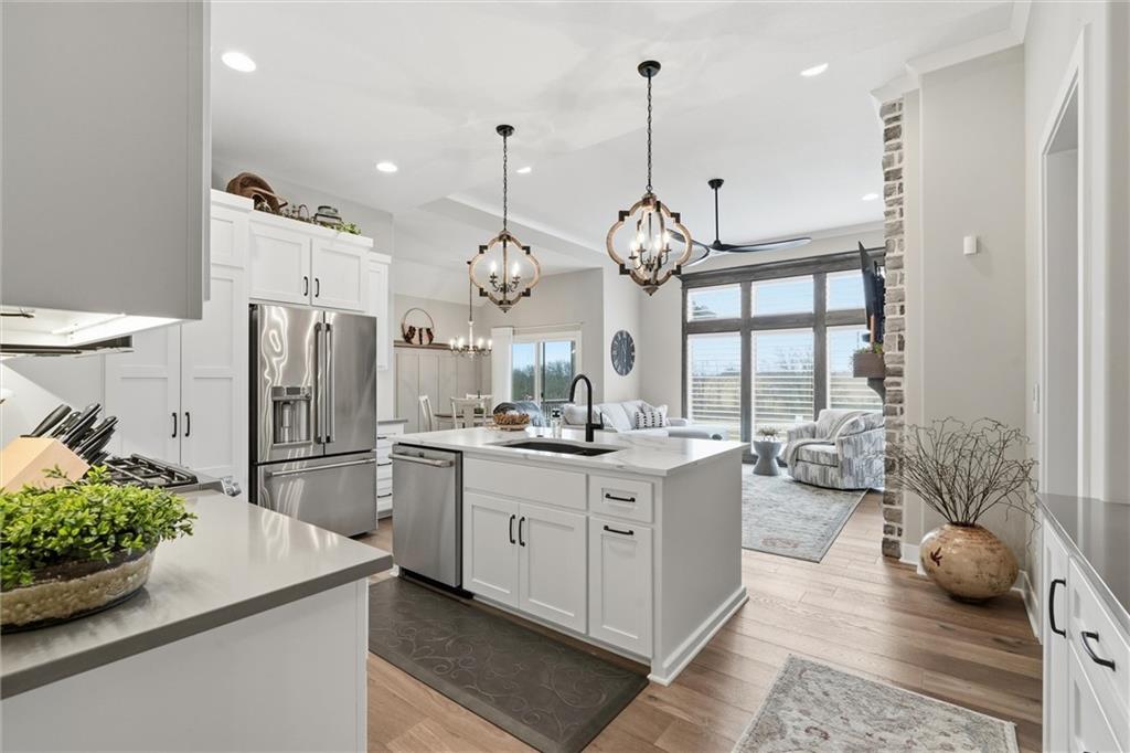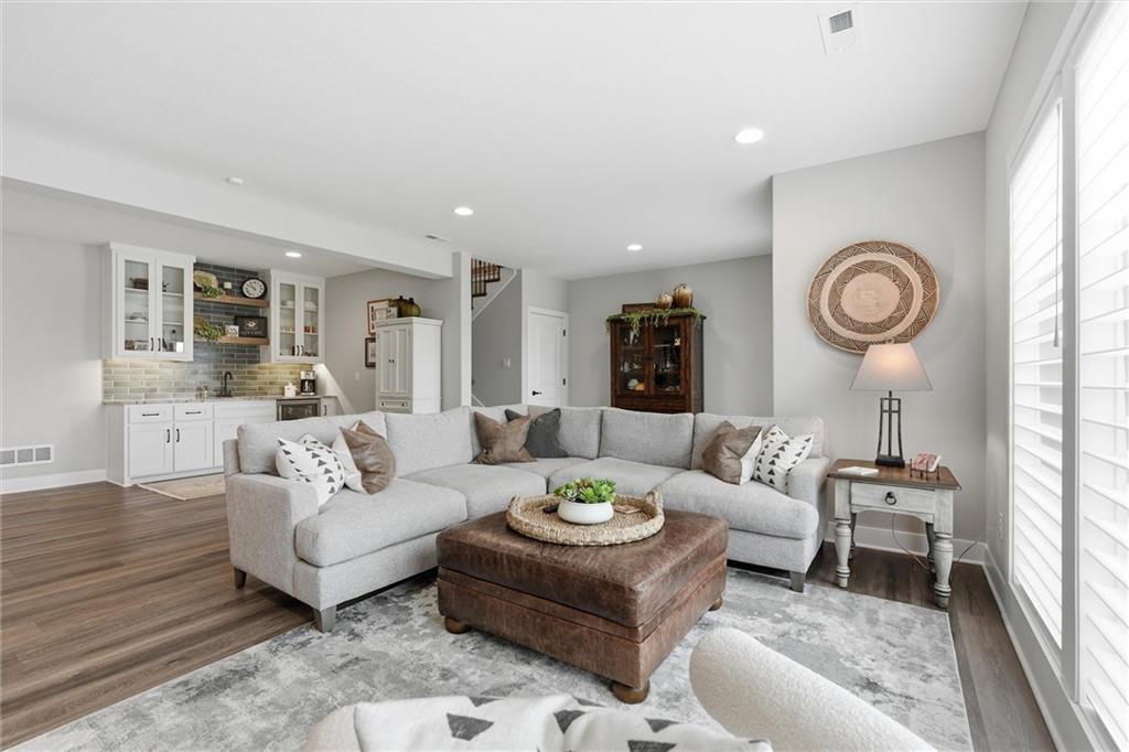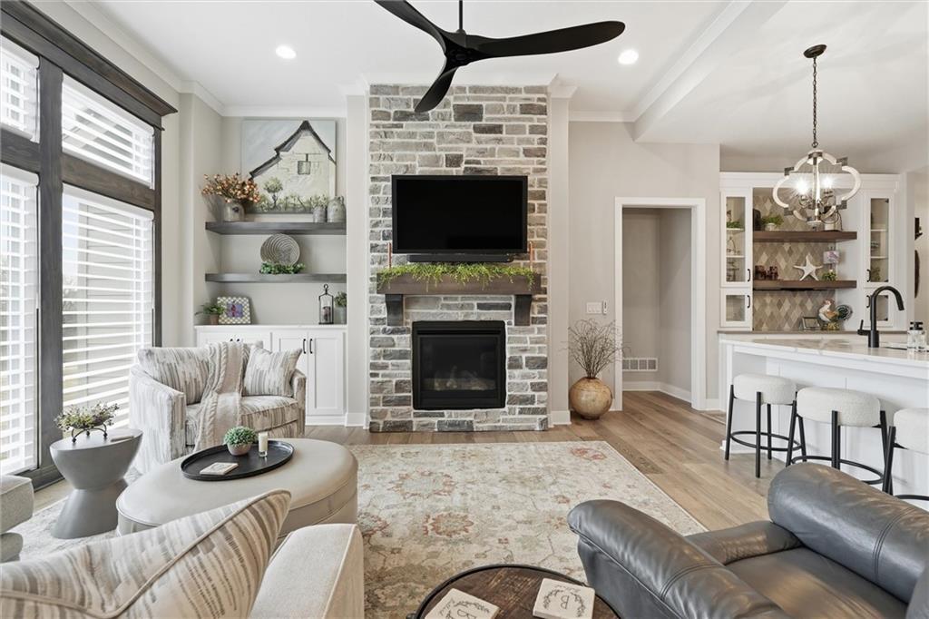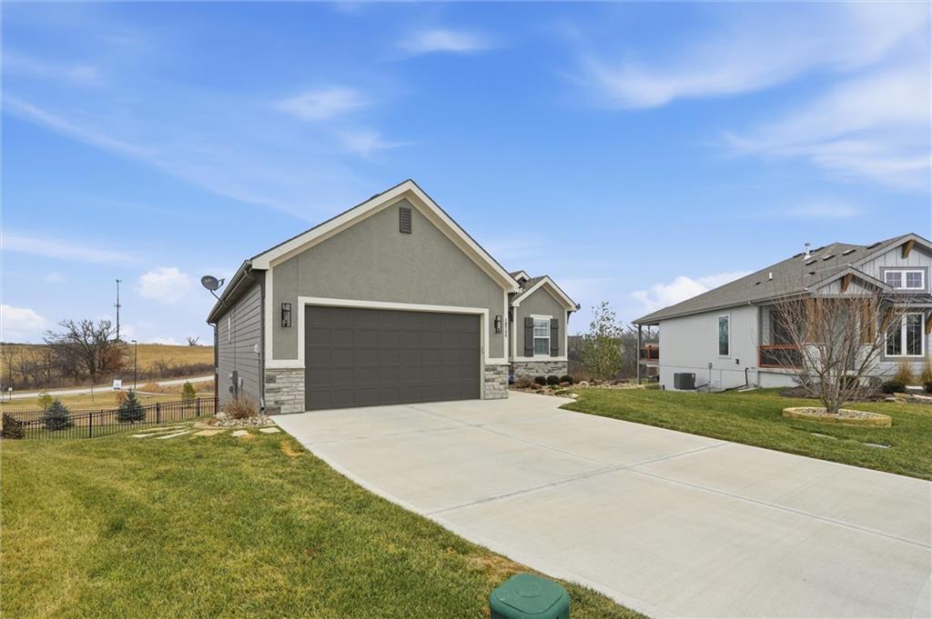 Tucked into desirable Phase 1 of Cadence Villas, this exceptional home offers a premium setting backing to green space with a nearby walking trail—providing privacy without sacrificing access to the outdoors. The walkout lower level extends seamlessly to a beautifully landscaped backyard featuring natural rock walls, mature trees, curated plantings, and designed pathways. Enjoy year-round outdoor living from the screened-in deck, extended patio, and fully fenced yard. Inside, the home is loaded with upgrades that enhance both style and function. The exterior features durable horizontal lap siding and a full-house Zip System for efficiency and weather protection. Interior highlights include upgraded lighting, board and batten accent walls, an oak picture shelf in the dining area, and a striking stone fireplace. The kitchen is equipped with high-end GE Café smart appliances, including a dual fuel range, convection microwave, dishwasher and French door refrigerator—ideal for entertaining. Additional features include 42” soft-close cabinetry, a Silgranite sink, matte black fixtures, and a built-in buffet with tile to the ceiling. Comfort continues with an ADT security system, premium window treatments, upgraded ceiling fans, and enhanced low-voltage wiring. Storage is maximized with custom closets, a Gladiator garage system, basement shelving, and a lit workbench. The garage also includes a 50-amp RV plug. Additional upgrades include hardwood flooring on the main level, LVP in the basement, upgraded carpet, enhanced bath cabinetry, elongated toilets, and a termite protection system. A rare opportunity to own a beautifully upgraded home in one of Cadence Villas’ most desirable locations. HOA dues are $650/year plus $200/month.