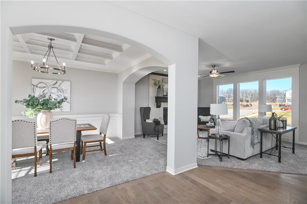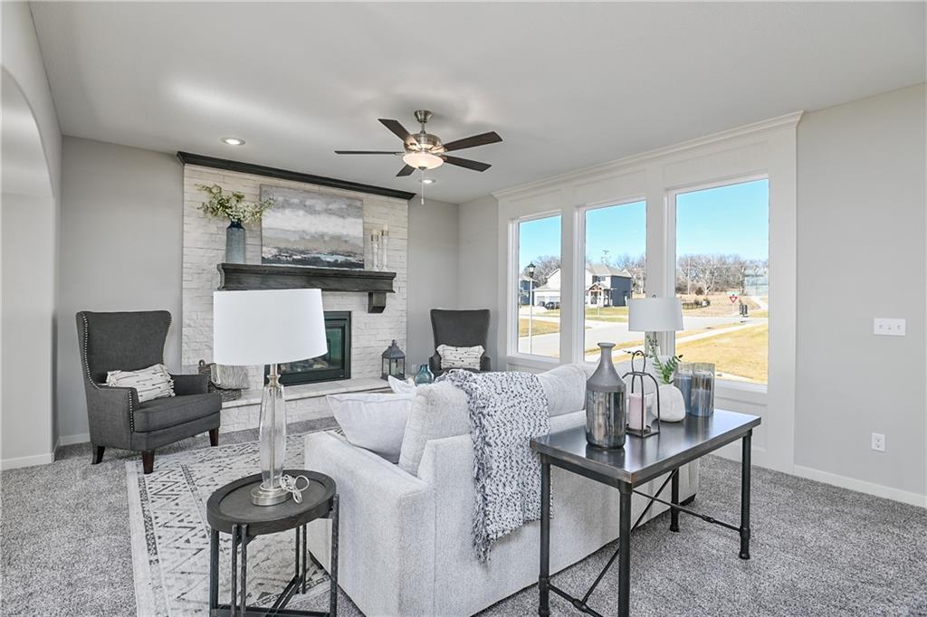 The Levi II offers an exceptional blend of space, style, and functionality with expanded square footage and upgraded finishes throughout. The enlarged kitchen and breakfast area feature custom cabinetry, granite countertops, a large center island with seating, tile backsplash, upgraded faucet, walk-in pantry, and stainless steel appliances—perfect for everyday living and entertaining. Hardwood floors extend through the entry, kitchen, breakfast area, and mud room. A versatile main-level flex room with closet and wood-paneled ceiling provides ideal space for a home office or fifth bedroom. The mud room includes a boot bench and entry closet, while the great room is anchored by a stone direct-vent fireplace with wood mantle. The primary suite is a true retreat, offering a separate sitting area, vaulted ceiling, expanded walk-in closet, and spa-like bath with granite countertops, soaking tub, and walk-in tile shower. All bedrooms feature vaulted ceilings. Upstairs highlights include a loft area with built-in bookshelves, a hallway window for added natural light, and a spacious laundry room with custom cabinetry and granite countertop. Tile flooring is featured in all bathrooms and the laundry room, with Berber carpet on the stairs. Enjoy outdoor living on the covered patio with a full sprinkler system. Located in Prairie Farms, residents enjoy neighborhood amenities including walking trails, pool, playground, and convenient walking distance to Lake Olathe. Photos are of actual home.