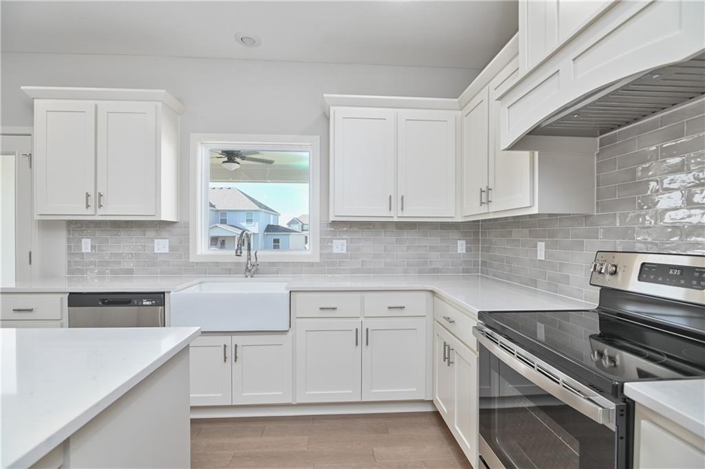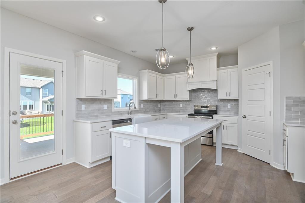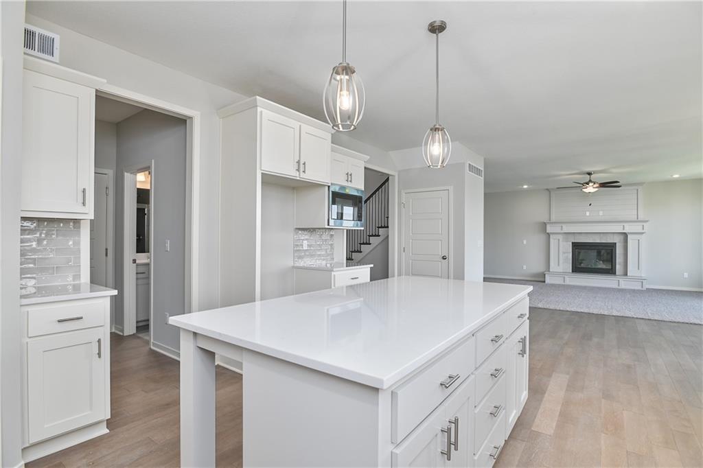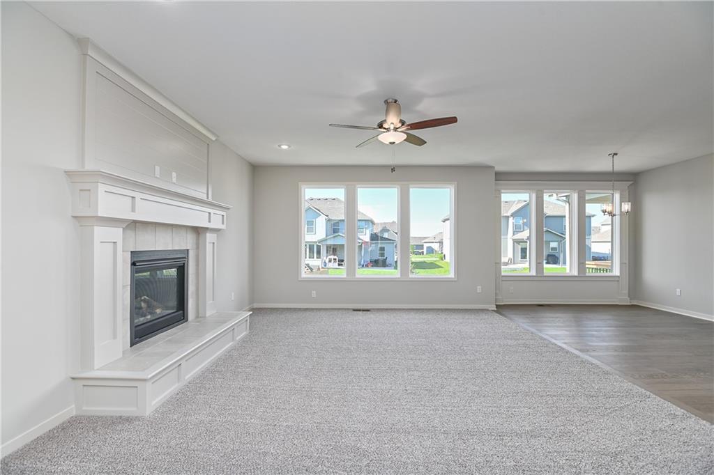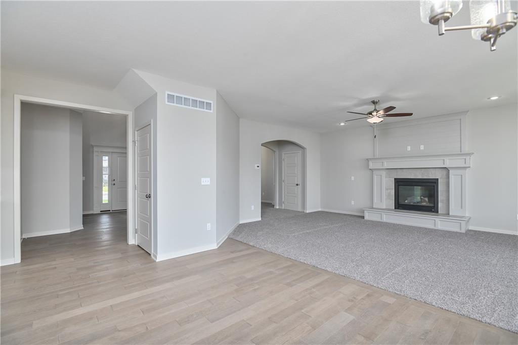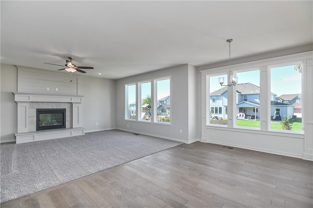 Popular Harlow 5 | 5 Bedrooms | 4 Baths | 3-Car Garage | Prairie Farms This stunning 2-story Harlow 5 home offers 5 bedrooms, 4 baths, and a spacious 3-car garage in the highly sought-after Prairie Farms community. From the moment you enter, you’ll be impressed by the beautiful turned staircase and gleaming hardwood floors. The formal dining room features built-in cabinetry on both sides and flows seamlessly into a bright, open great room with a cozy fireplace and abundant natural light. The adjacent dining area and chef’s kitchen are an entertainer’s dream—highlighted by hardwood floors, granite countertops, a large center island, apron-front sink, painted custom cabinets with soft-close doors and drawers, upgraded hardware, stainless steel appliances, built-in microwave, and a generous walk-in pantry. A main-level bedroom with a closet offers flexibility as a guest suite, office, playroom, craft space, or more. Upstairs, the luxurious owner’s suite boasts a spa-like bathroom with double granite vanities, tile floors, a free-standing soaking tub, and a walk-in tiled shower. A spacious walk-in closet connects directly to the conveniently located laundry room. Two secondary bedrooms share a Jack & Jill bath, each with its own private vanity. A fourth upstairs bedroom features its own private bath and walk-in closet. Additional highlights include a huge unfinished basement with abundant storage potential, an in-ground sprinkler system, and more. Community amenities include a large swimming pool, cabana, playground, and walking trails. Plus, Prairie Farms is adjacent to the newly renovated Lake Olathe, offering paddleboarding, fishing, hiking, and more—making this a perfect place to call home! Photos are of actual home.