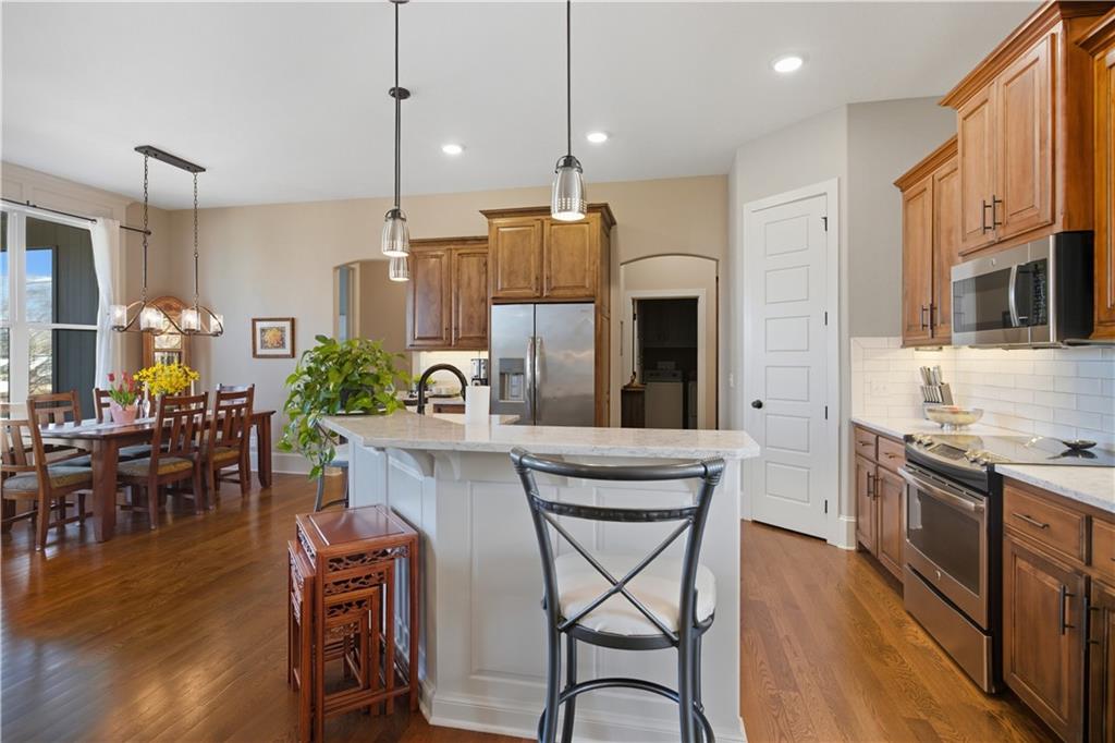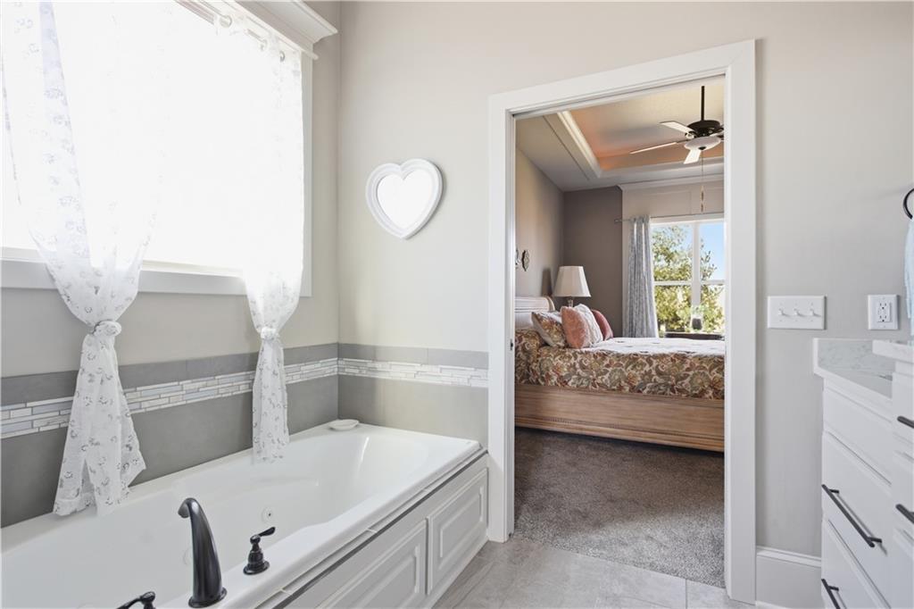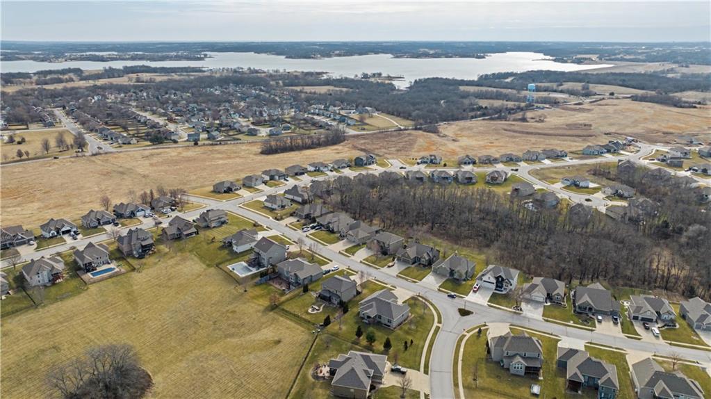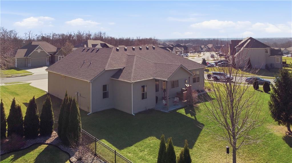 Former model home in highly desirable Greyhawke at the Lake! This spacious 4-bedroom, 3-bath residence offers an open and airy floor plan with tall 6-panel doors, large closets, and quality finishes throughout. The main level features three bedrooms, including a private primary suite with dual vanities, a jetted tub, a tiled glass walk-in shower, and a private water closet. Hardwood floors flow through the great room, dining area, and kitchen, and a gas fireplace anchors the living space perfect for both everyday living and entertaining. The finished daylight basement provides flexible space for recreation, guests, or hobbies. Step outside to enjoy the covered patio overlooking a beautifully landscaped corner lot that adjoins green space and includes an in ground sprinkler system. A security system and internal antenna streaming system are added bonuses. The three car attached garage offers plenty of room for vehicles, storage, or lake gear. Recent updates include a new roof and gutters for added peace of mind. Located just minutes from Smithville Lake and Paradise Pointe Golf Complex, with easy access to top-rated Smithville schools and Northland amenities, this home delivers space, comfort, and an unbeatable location.