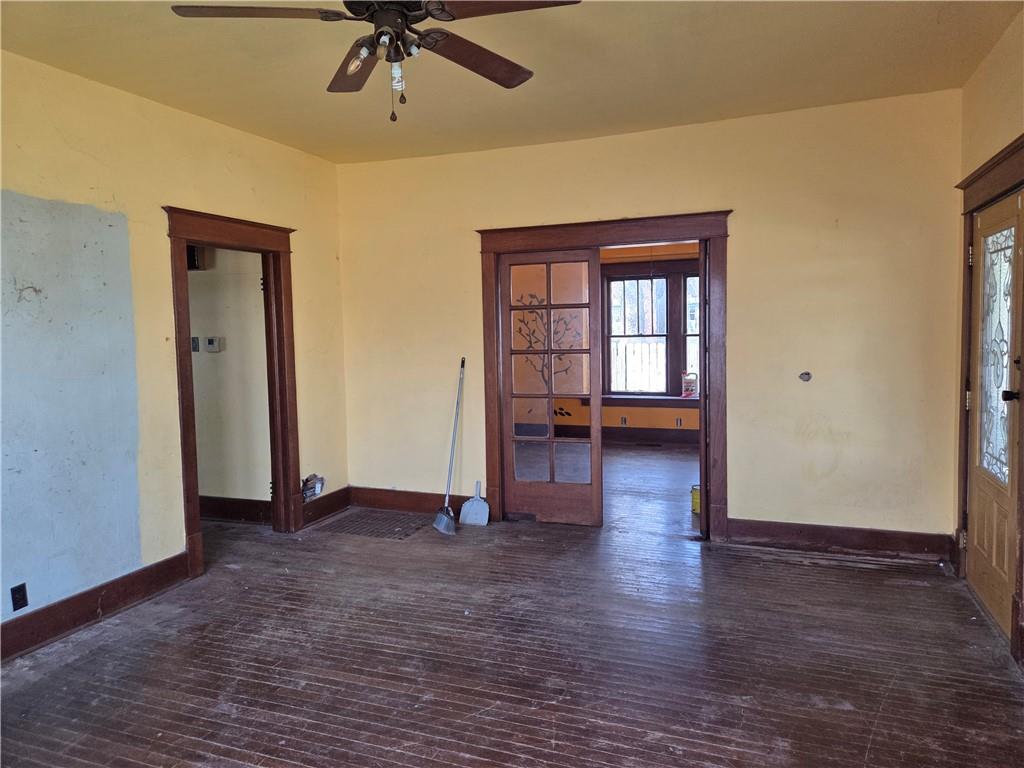 Room featuring wood-finish flooring, a two-pane window with dark wood trim and security bars, and a multi-pane glass-inset door