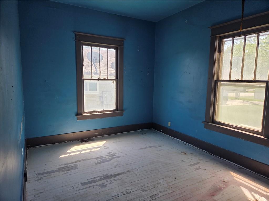 Room featuring two windows with wood trim, blue wall paint, and wood flooring