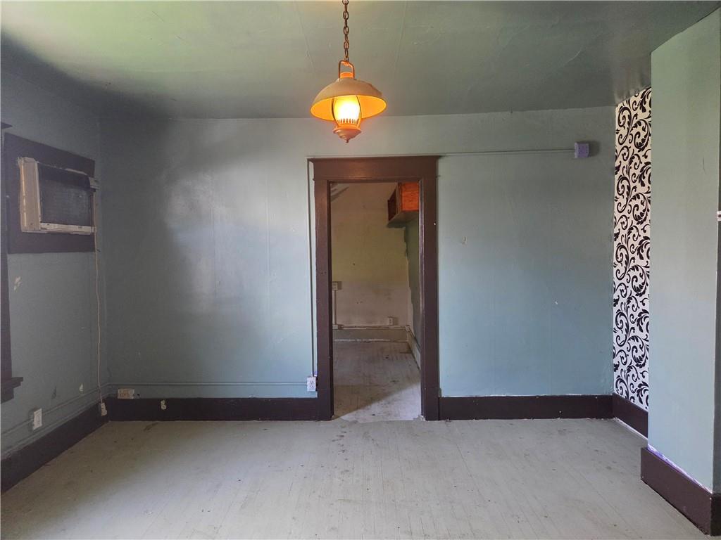 Room featuring a window with dark wood trim, a built-in air conditioning unit, and a suspended ceiling light fixture