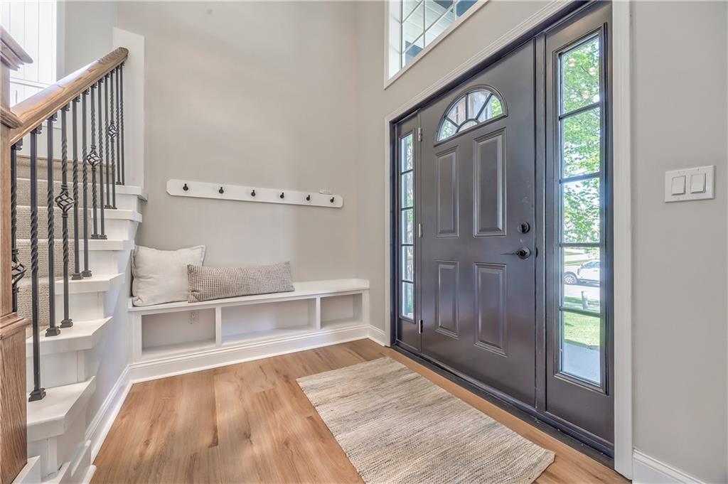 Entryway featuring built-in bench seating with cubby storage, coat hooks, and durable wood-finish flooring