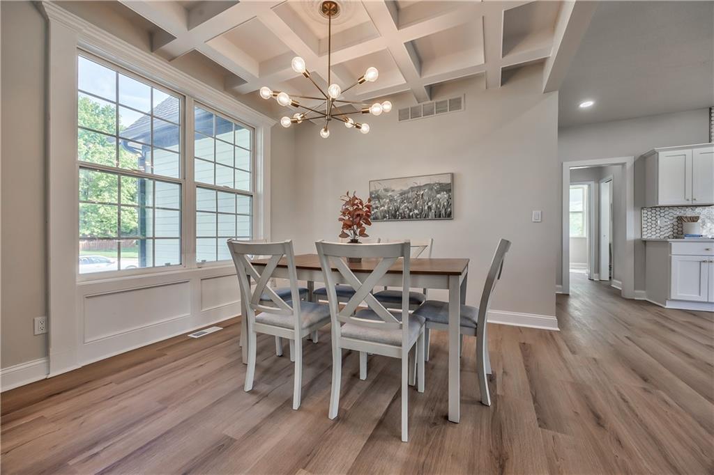 Dining area featuring wood-finish flooring, a coffered ceiling, a contemporary chandelier, and large pane windows