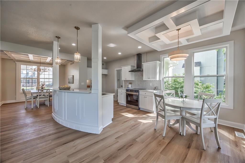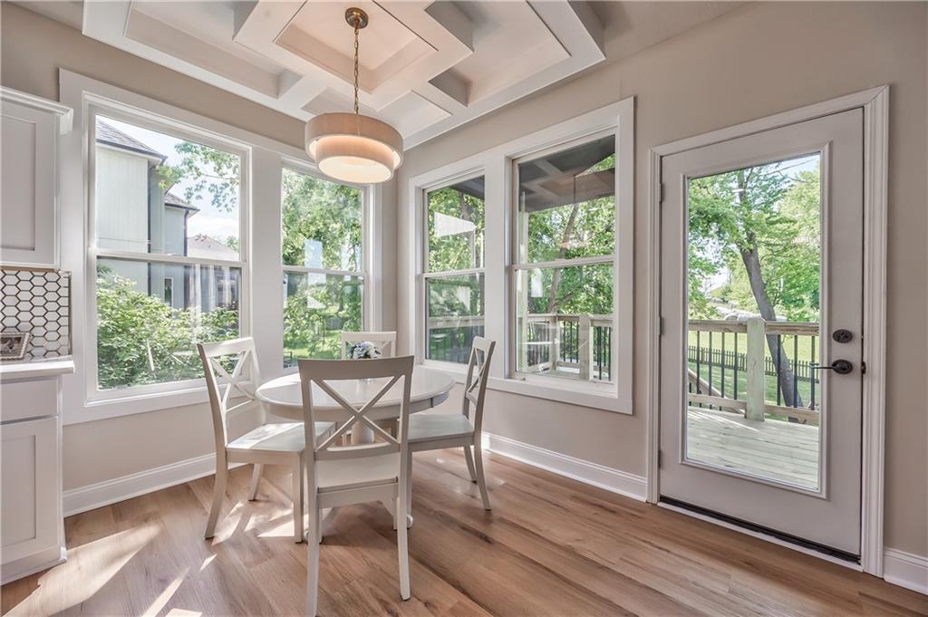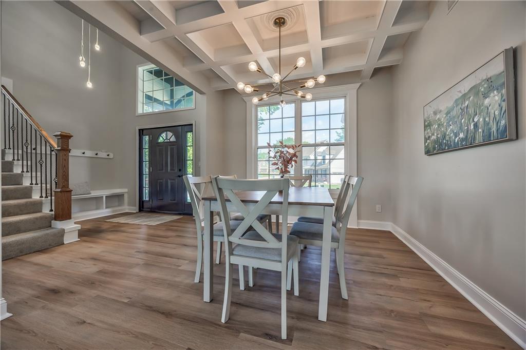 Breakfast nook featuring a coffered ceiling, a contemporary drum pendant light, and wood-finish flooring