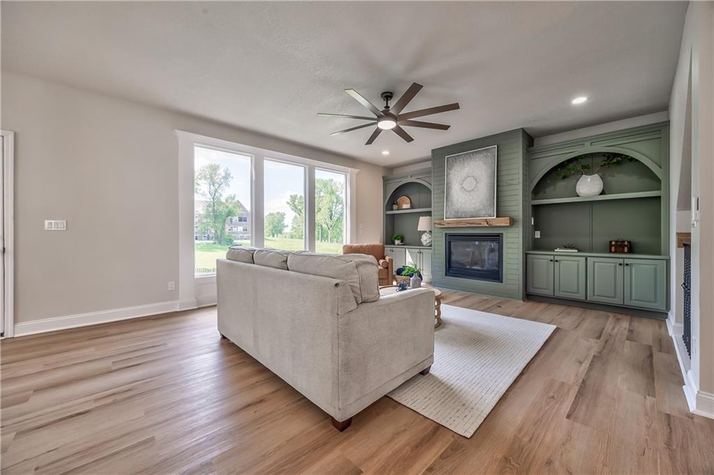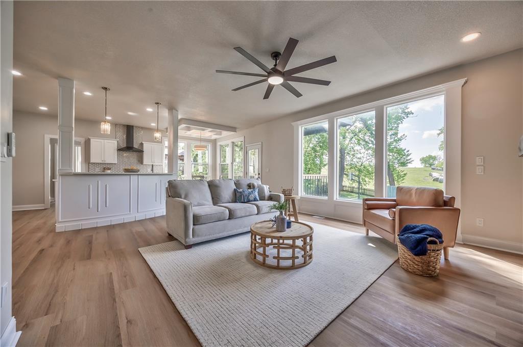 Spacious living area featuring wood-finish flooring, a contemporary ceiling fan, and large windows providing abundant natural light