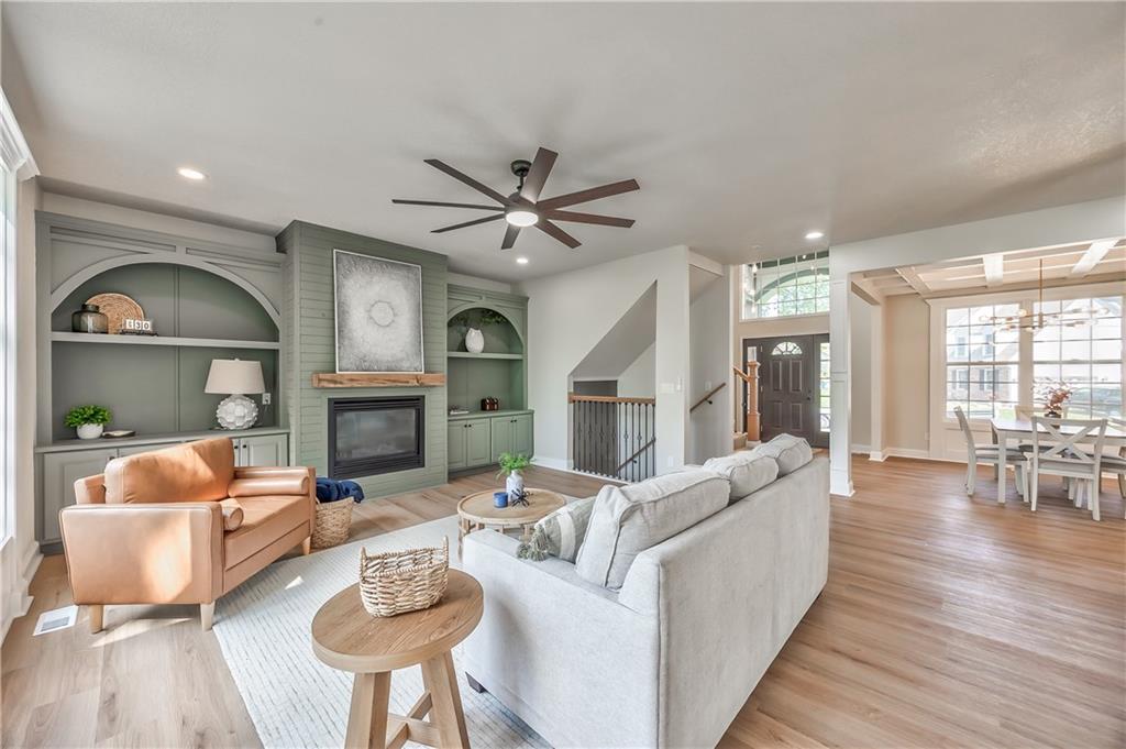 Spacious living area featuring light wood-finish flooring, a contemporary ceiling fan, and a fireplace with a wood mantel