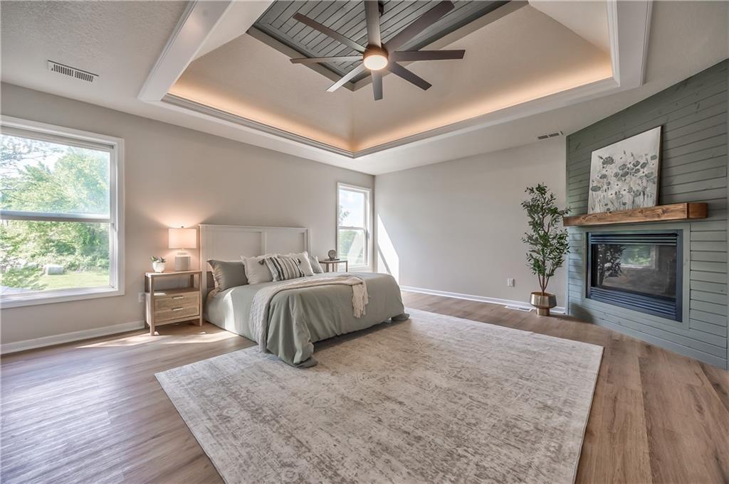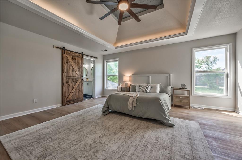 Bedroom featuring a multi-layered tray ceiling with recessed lighting, wood-finish flooring, and two large windows