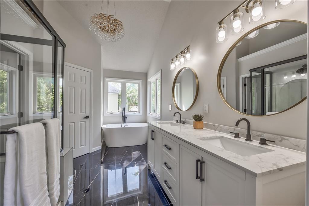 Dual vanity with quartz countertop, black fixtures, and round gold-framed mirrors