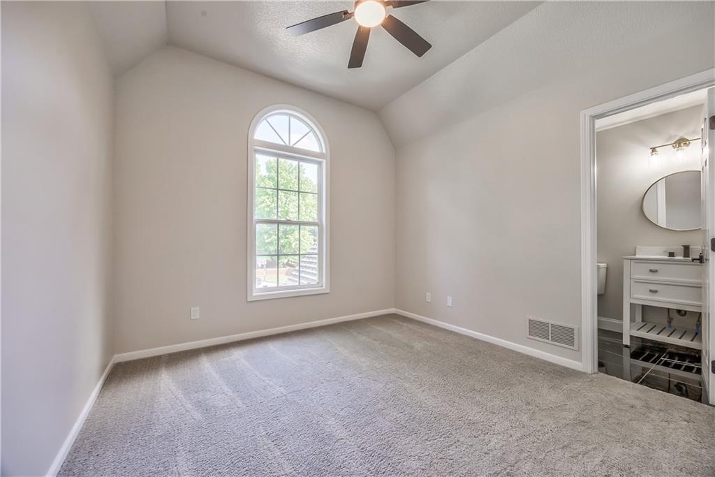 Vaulted ceiling room with an arched window, soft gray carpeting, and a ceiling fan with integrated lighting